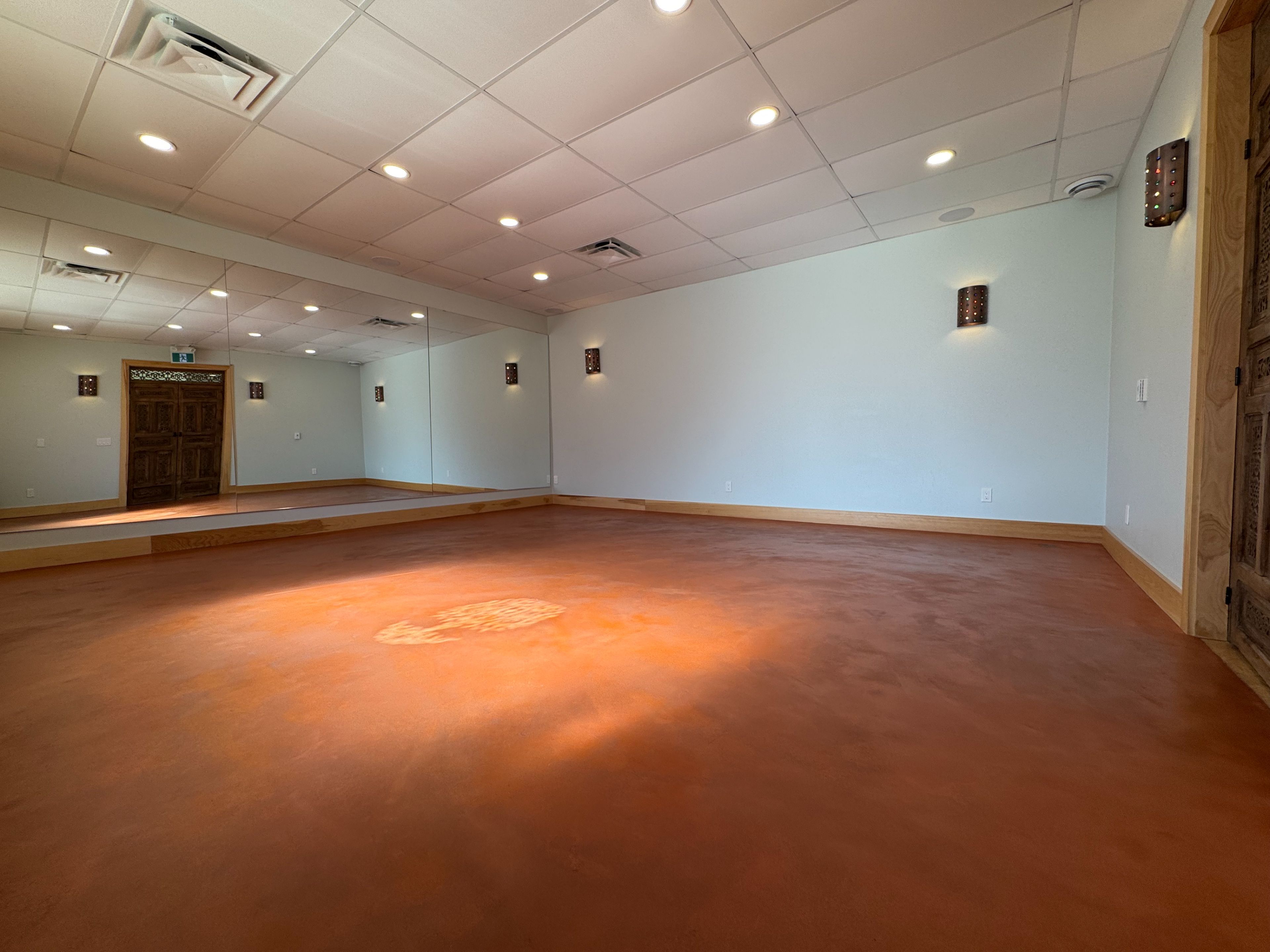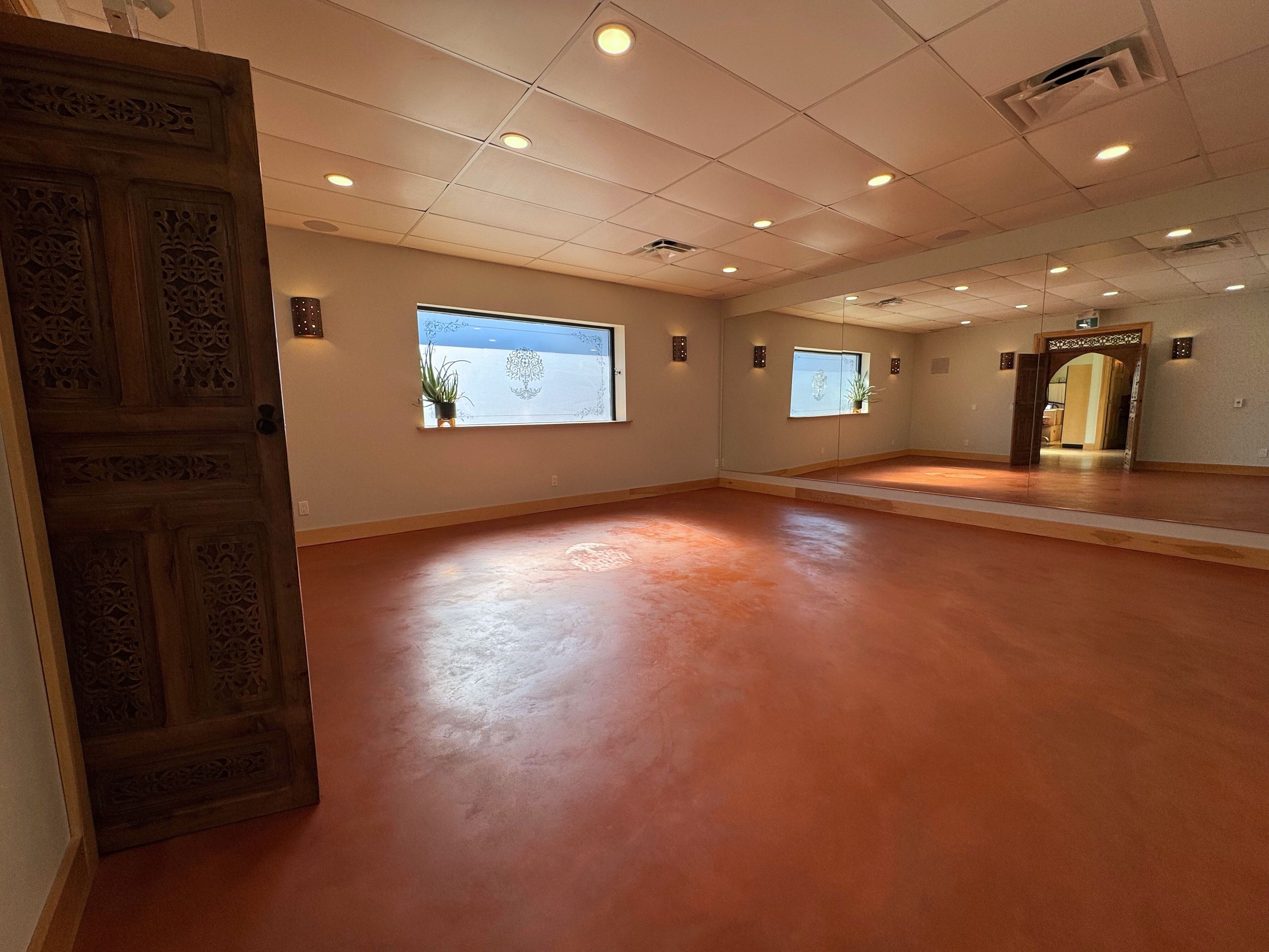 • Bright boutique hot yoga studio with infrared ceiling heating for optimal comfort.