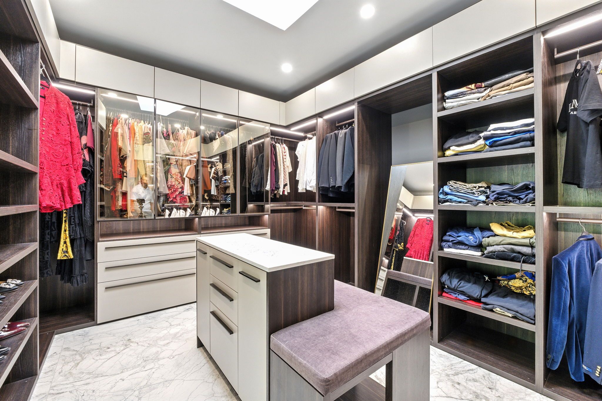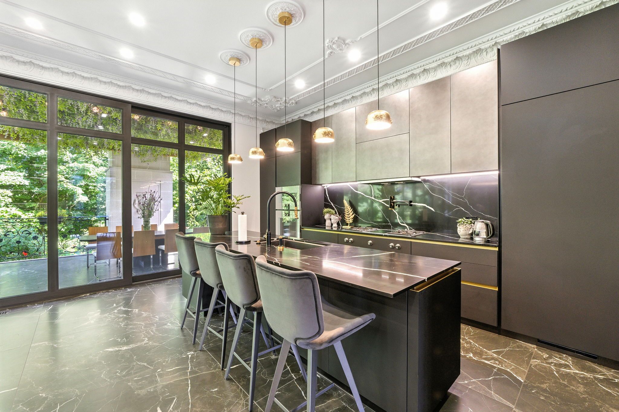 • Sleek modern kitchen featuring built-in appliances and bespoke details.