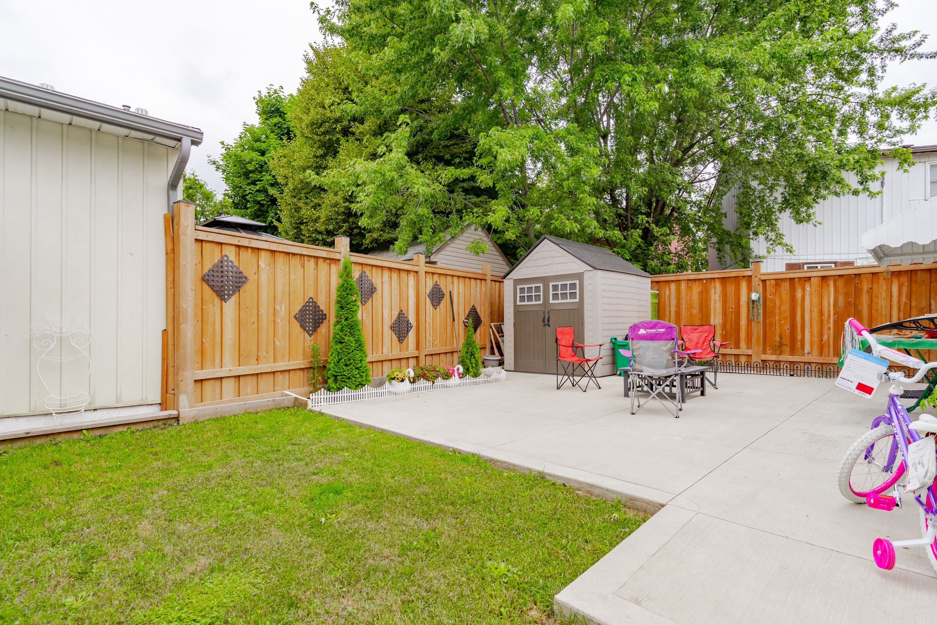 • Professionally landscaped backyard featuring a concrete patio for family gatherings.