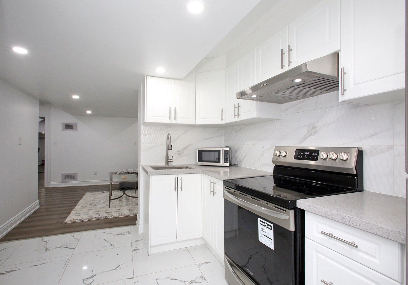 • Modern kitchen with quartz countertops and stainless steel appliances.