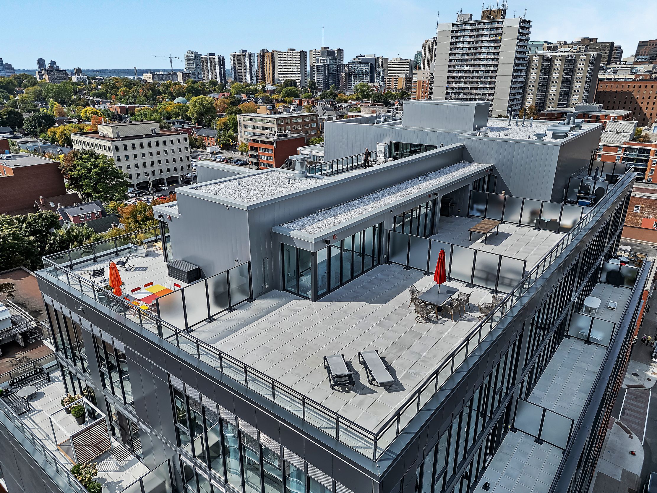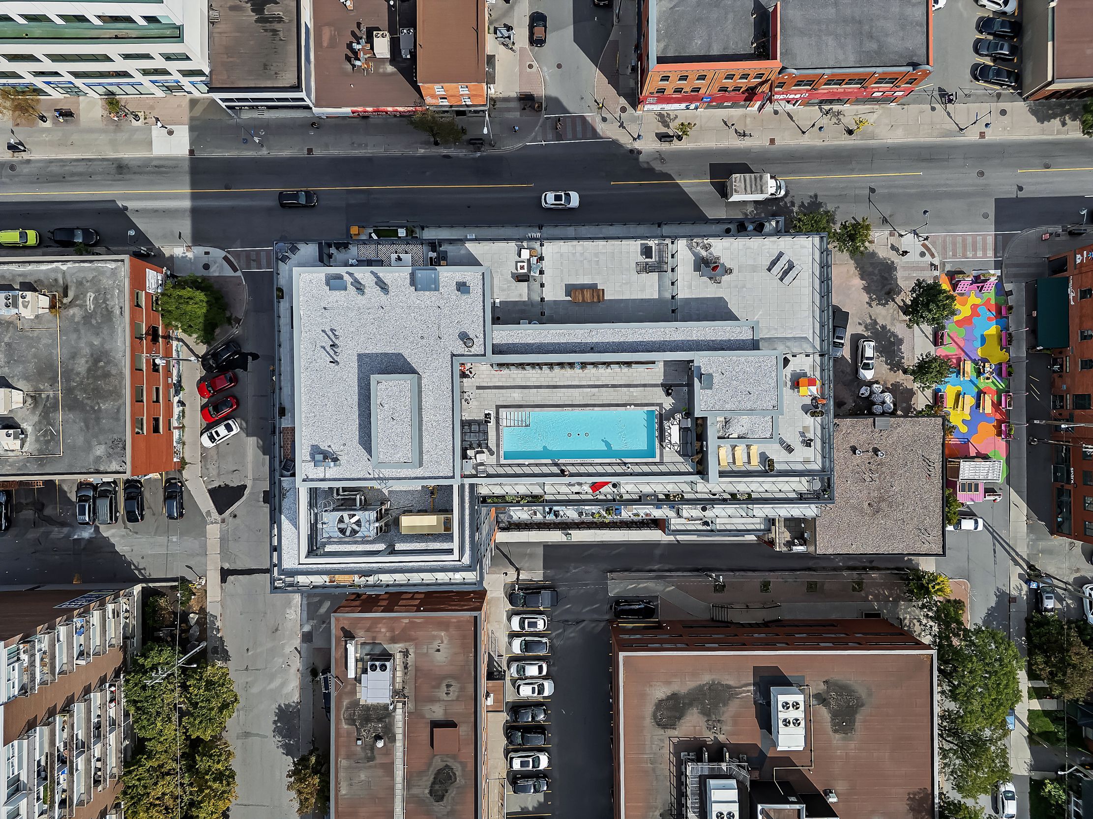 • Access to rooftop pool, exercise room, and included parking amenities.