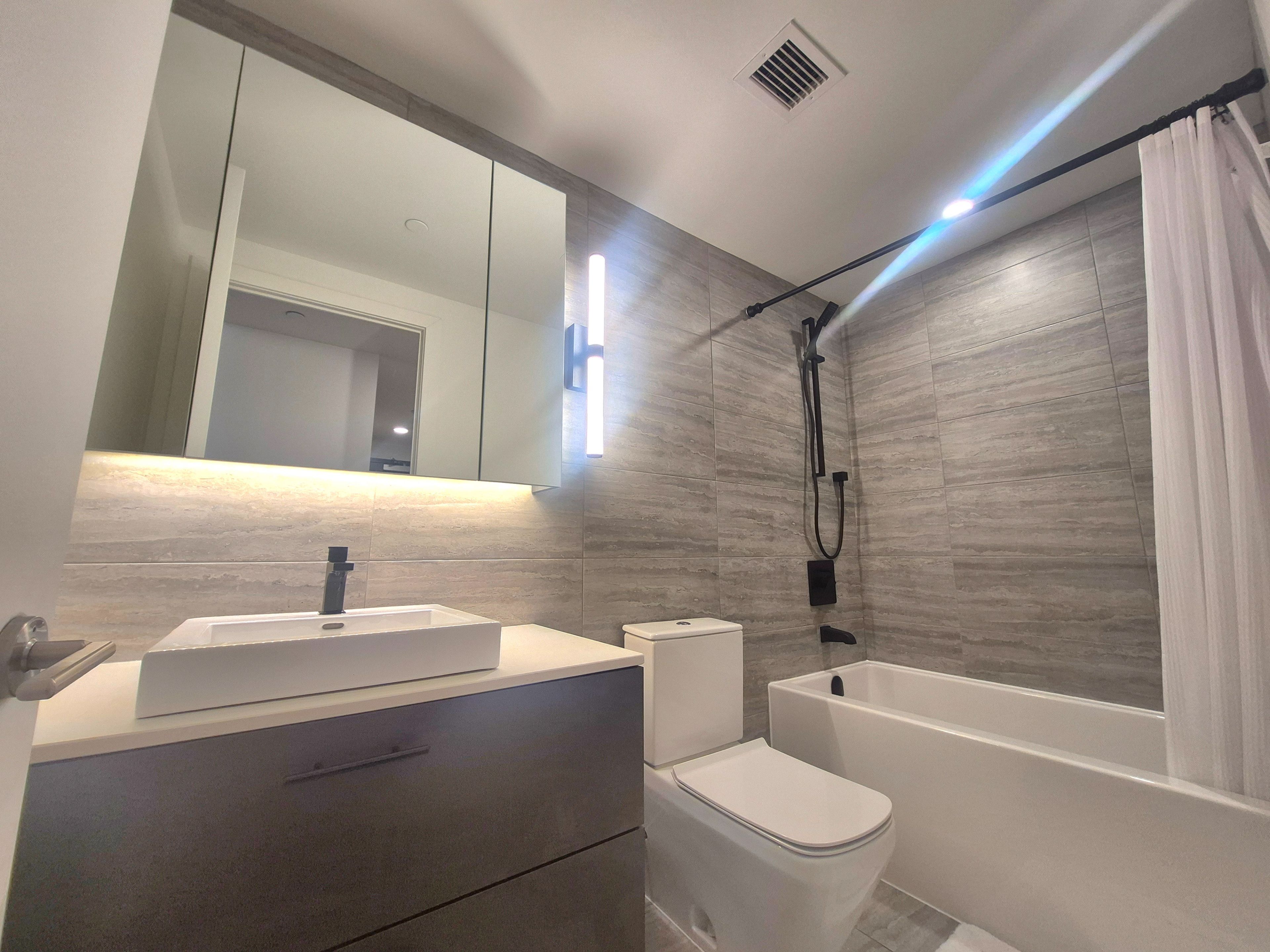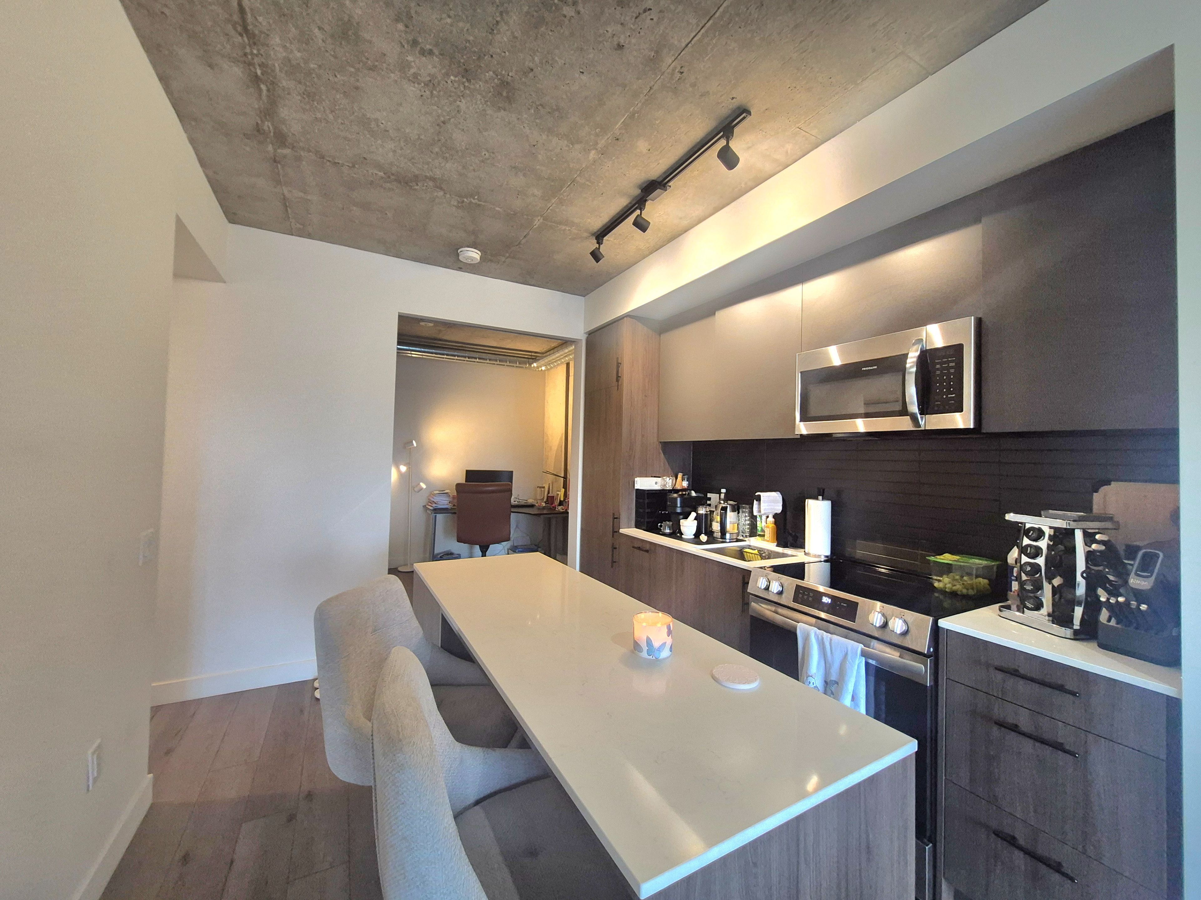 • Building amenities include rooftop pool, fitness center, and lounge.