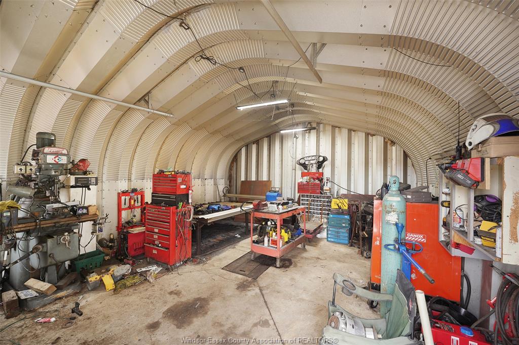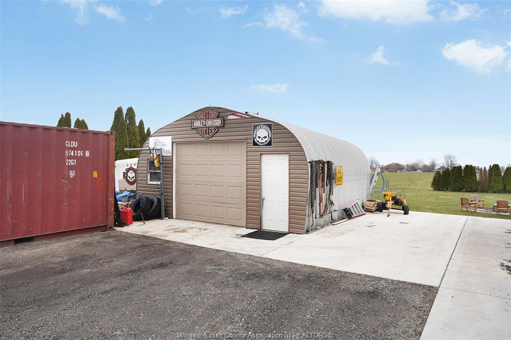 • Detached shop with concrete floor, motorcycle lift, and pellet stove.