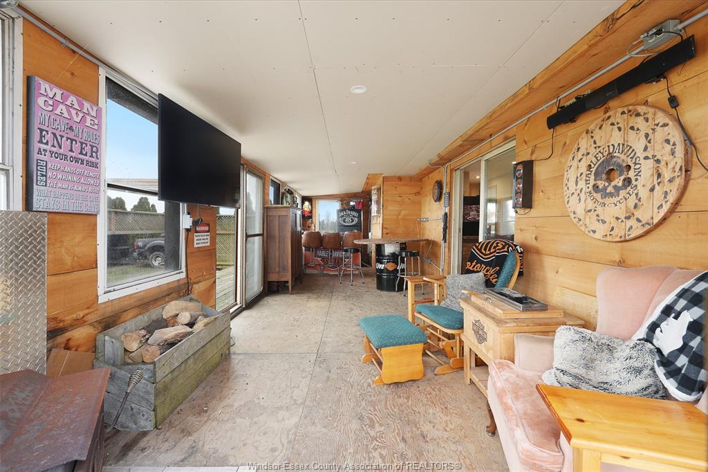 • Spacious 4-season sunroom with a cozy wood-burning fireplace.