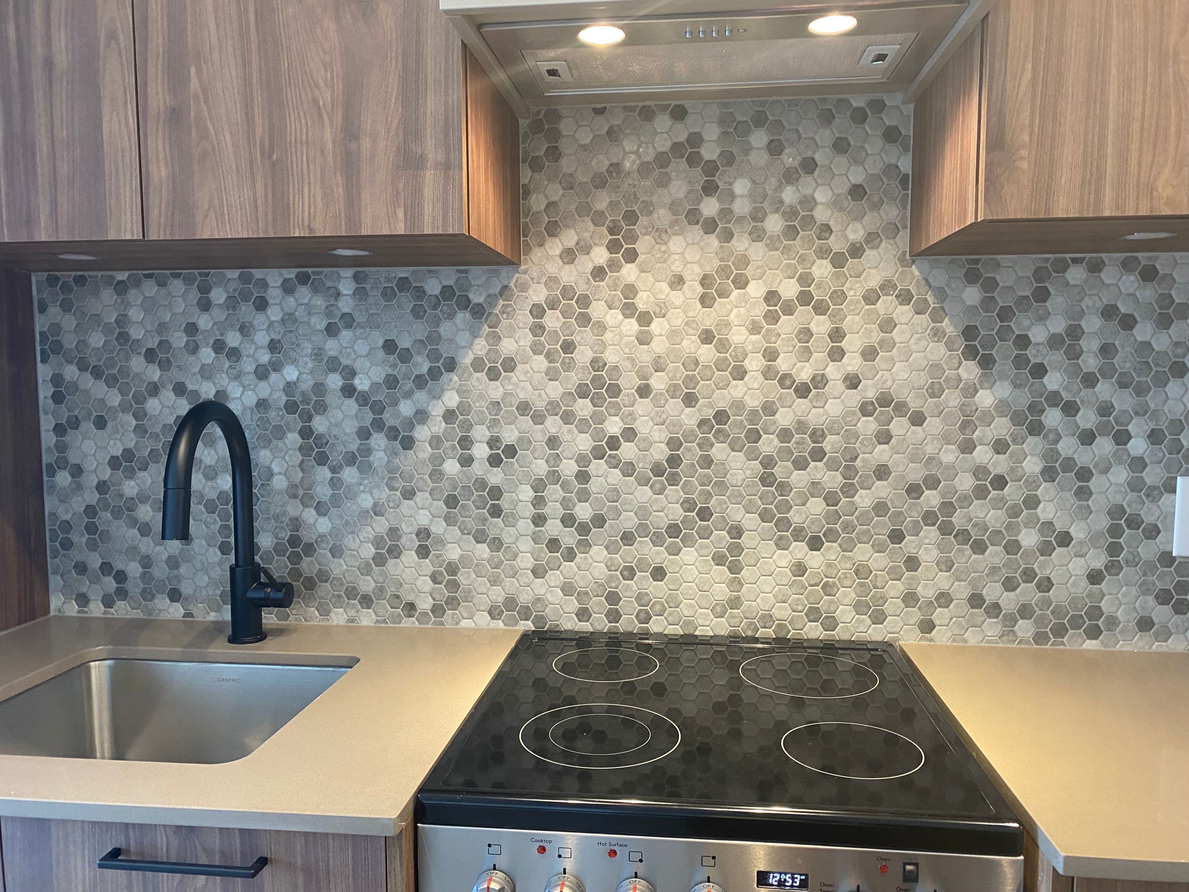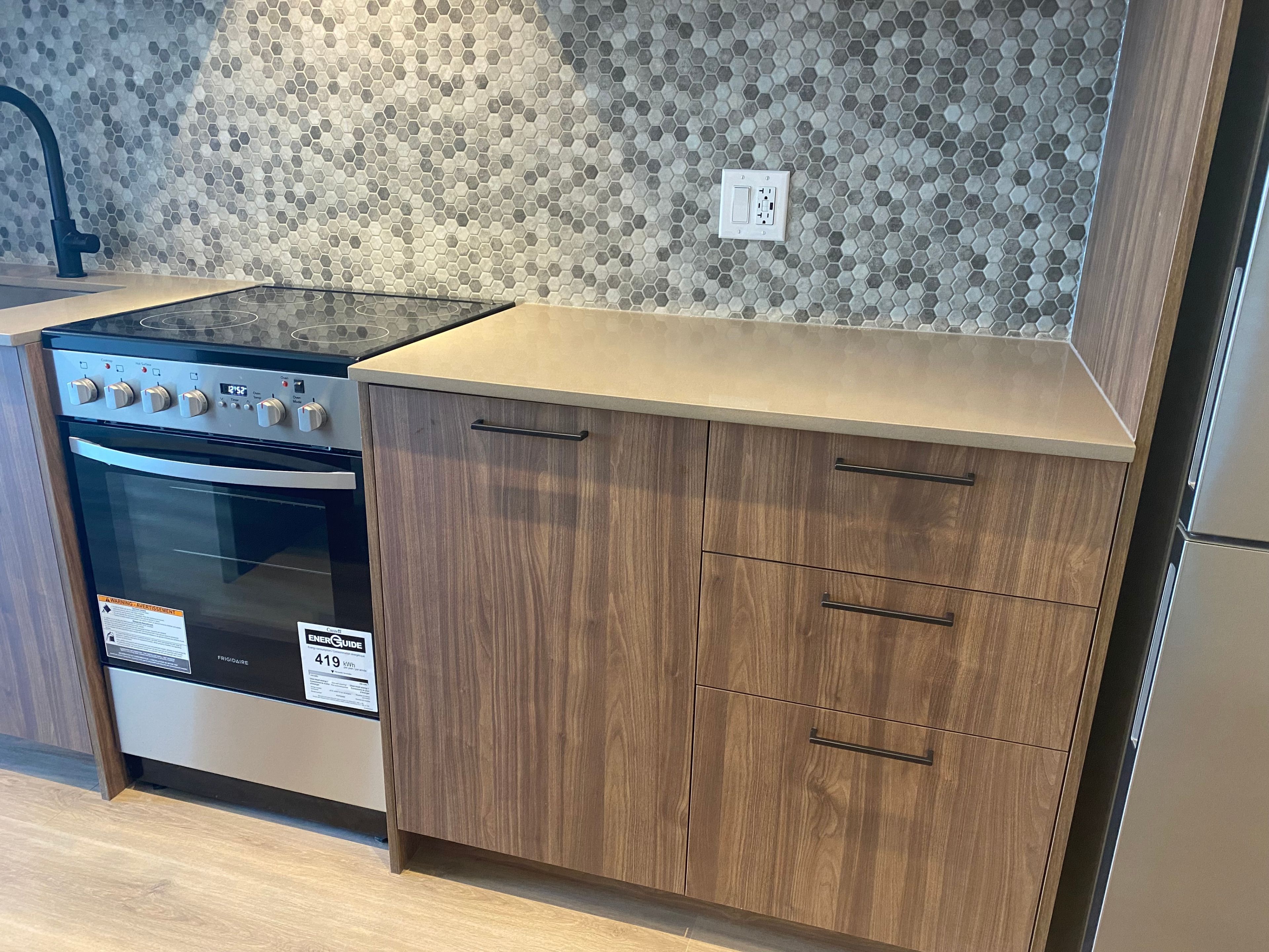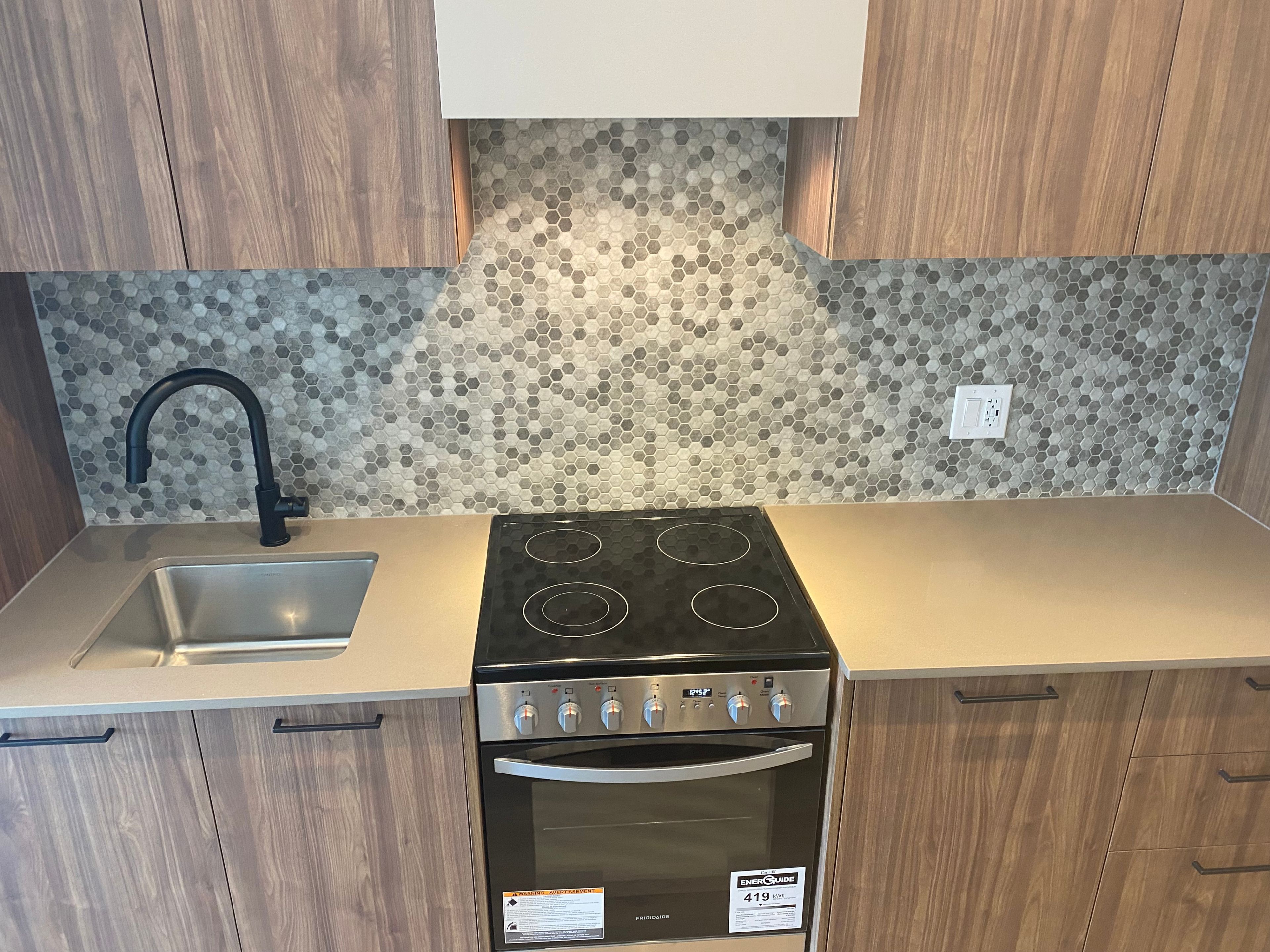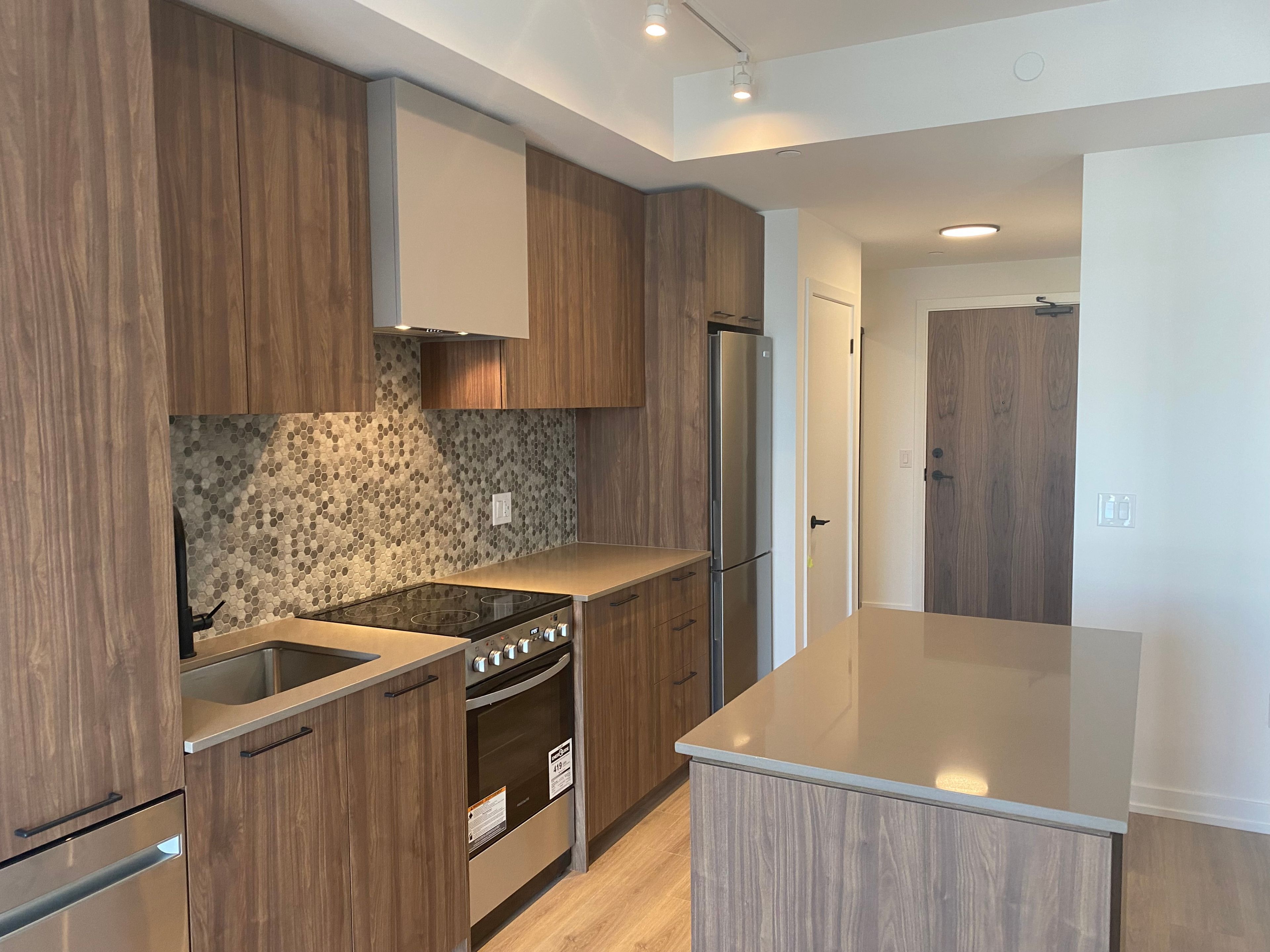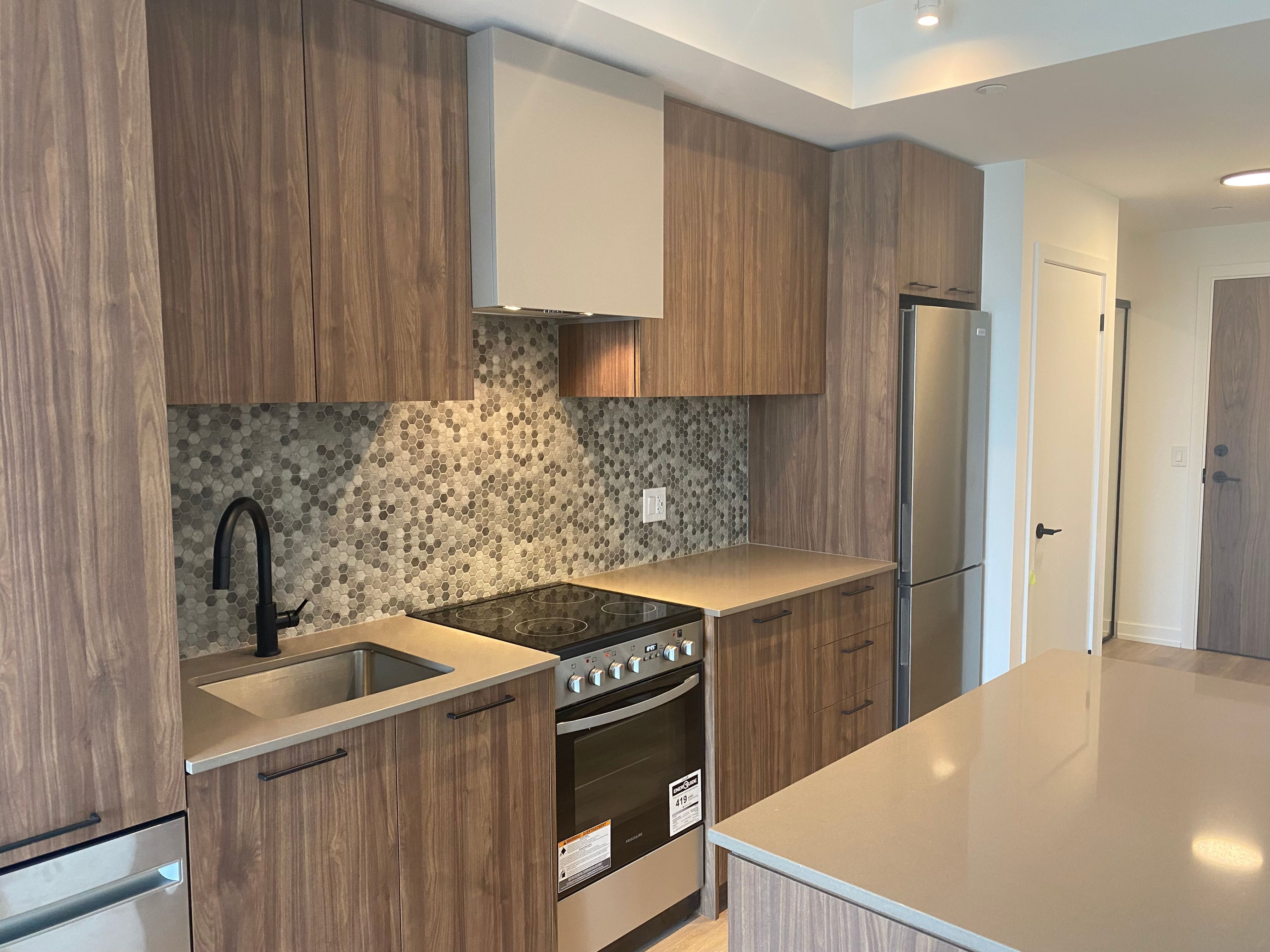 • Modern condo features hardwood floors and quartz countertops for stylish living.