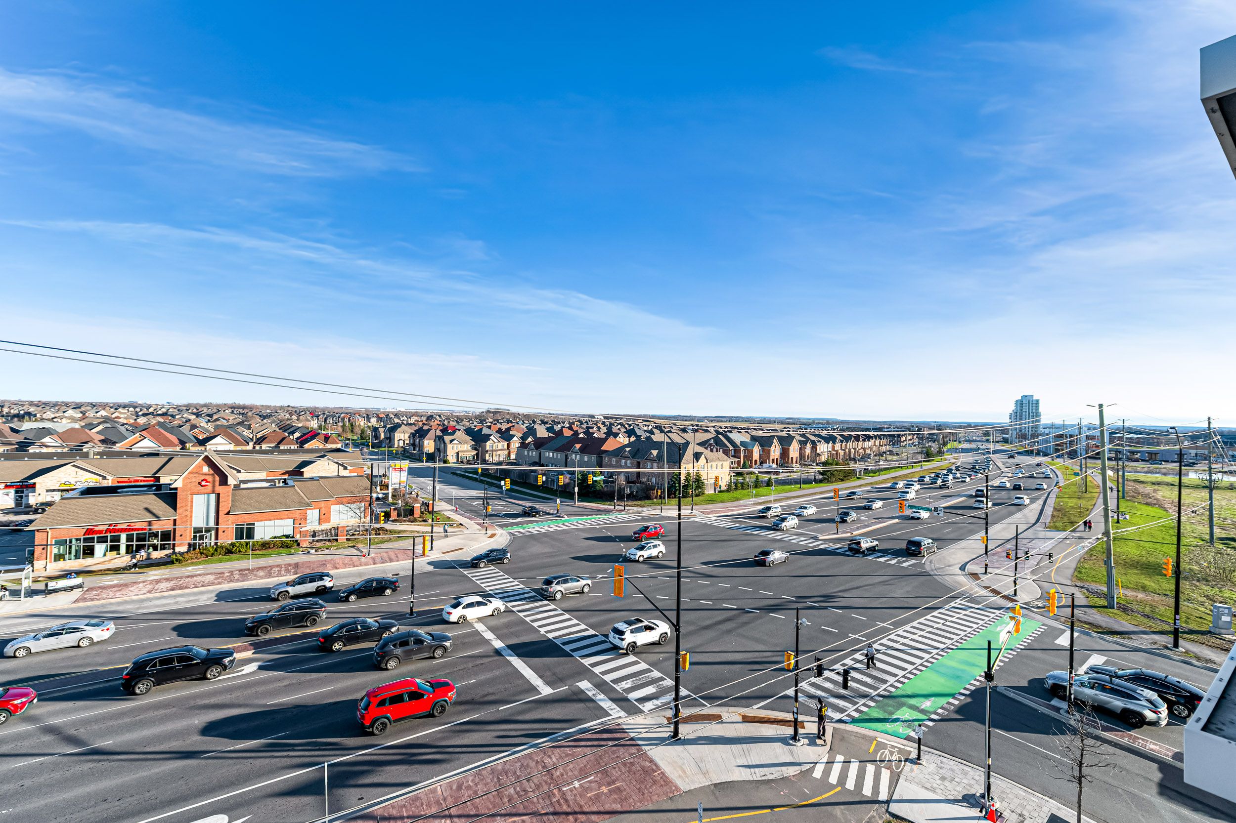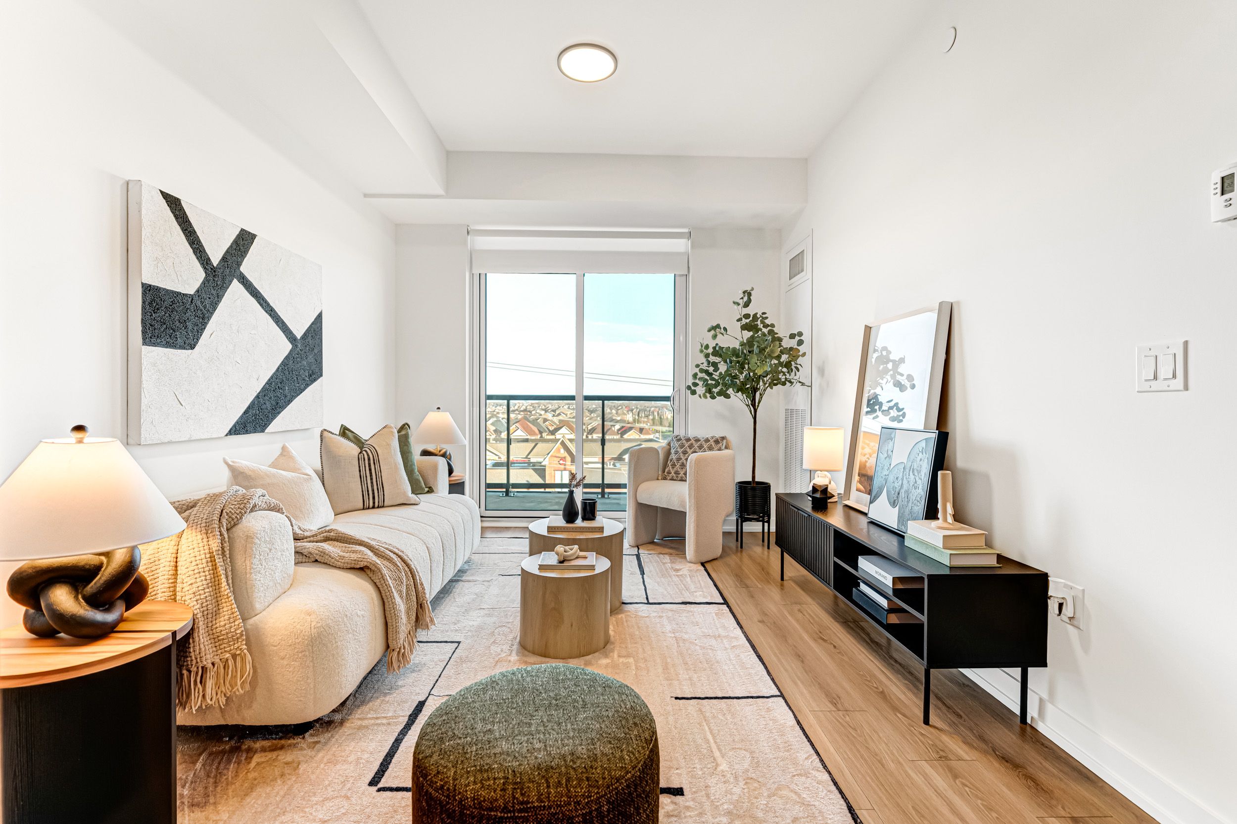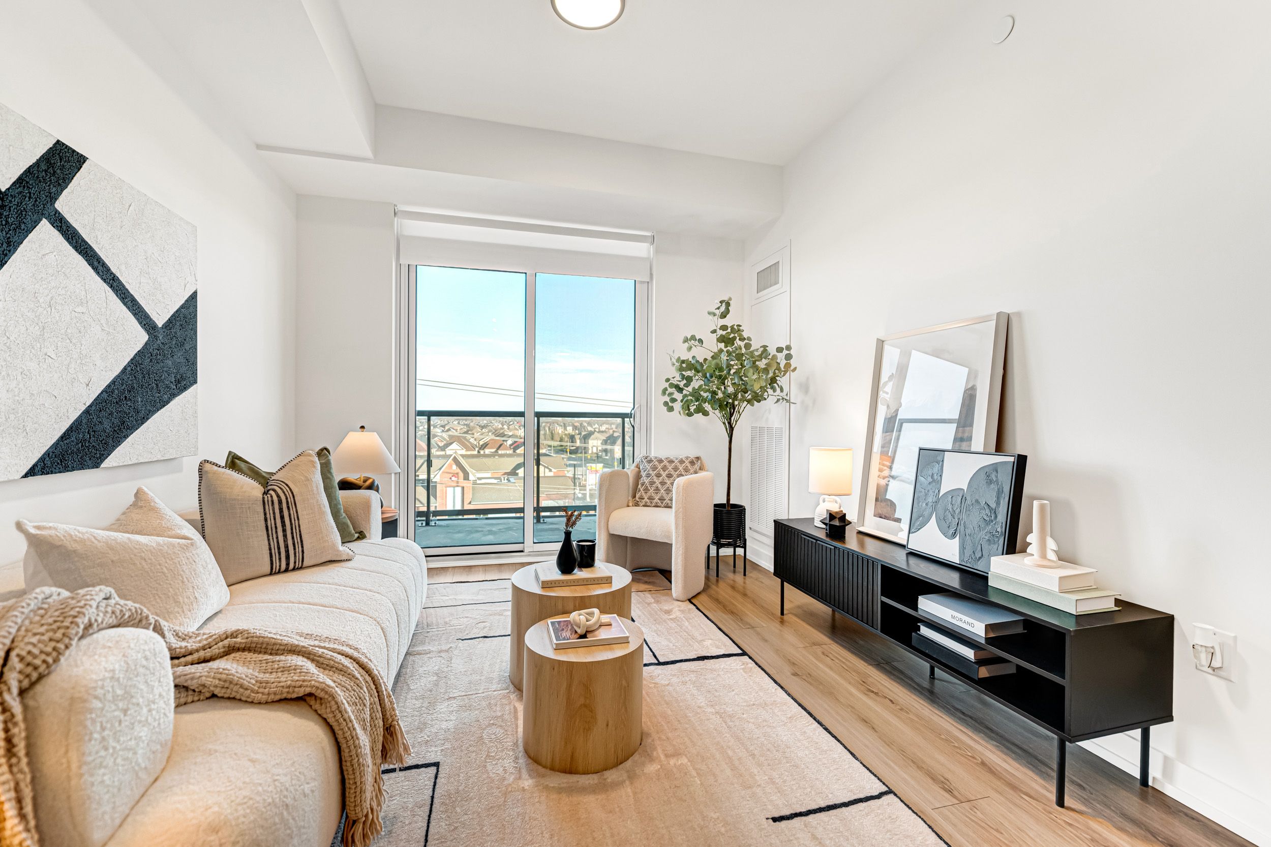 Welcome to this beautiful 1-bedroom plus den suite with unobstructed views in daniels mpv, ideally located in the heart of brampton's vibrant mount pleasant village community. Offering622 sq. Ft. Including the balcony, this unit delivers the perfect blend of modern style and everyday functionality. Soaring ceilings and floor-to-ceiling windows fill the open-concept layout with natural light while showcasing sweeping views of the surrounding neighbourhood and open sky. The chef-inspired kitchen is a true showpiece, featuring rich walnut cabinetry, a stylish backsplash, quartz countertops, stainless steel appliances, and a functional centre island with breakfast bar, perfect for both everyday living and entertaining. The living and dining area flows seamlessly to the balcony, an ideal spot to enjoy your morning coffee or evening sunset. The spacious primary bedroom offers a peaceful retreat with generous natural light, while the versatile den provides flexibility as a home office or potential second bedroom. The spa-inspired 4-piece bathroom features a soaker tub, classic white subway tile, and contemporary fixtures. Completing the suite is a convenient in-suite stacked washer and dryer. Includes 1 underground parking space and 1 locker. Prime location just steps to mount pleasant go station and with easy access to highways 410, 401, and 407. Close to transit, parks, plazas, schools, and everyday amenities. Whether you're a first-time buyer, downsizer, or savvy investor, this is an exceptional opportunity to own in one of brampton's most dynamic communities.