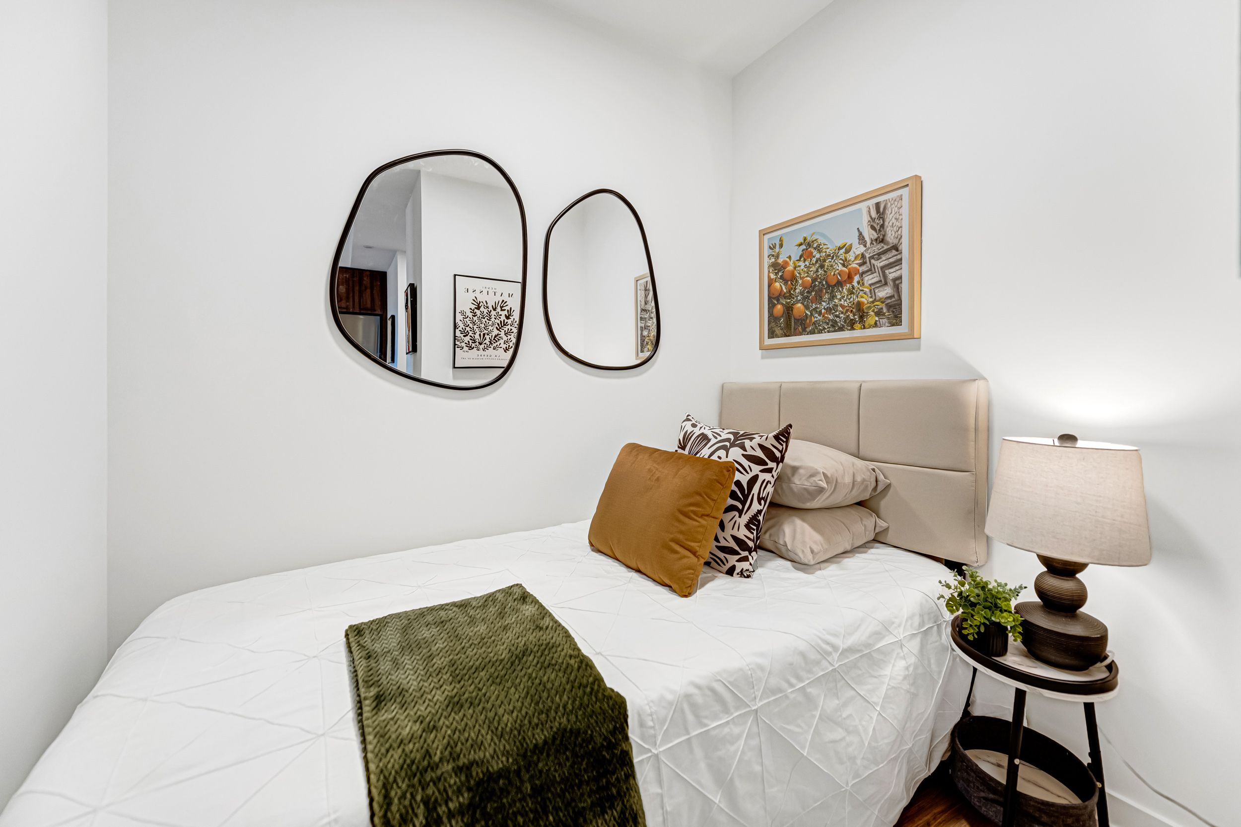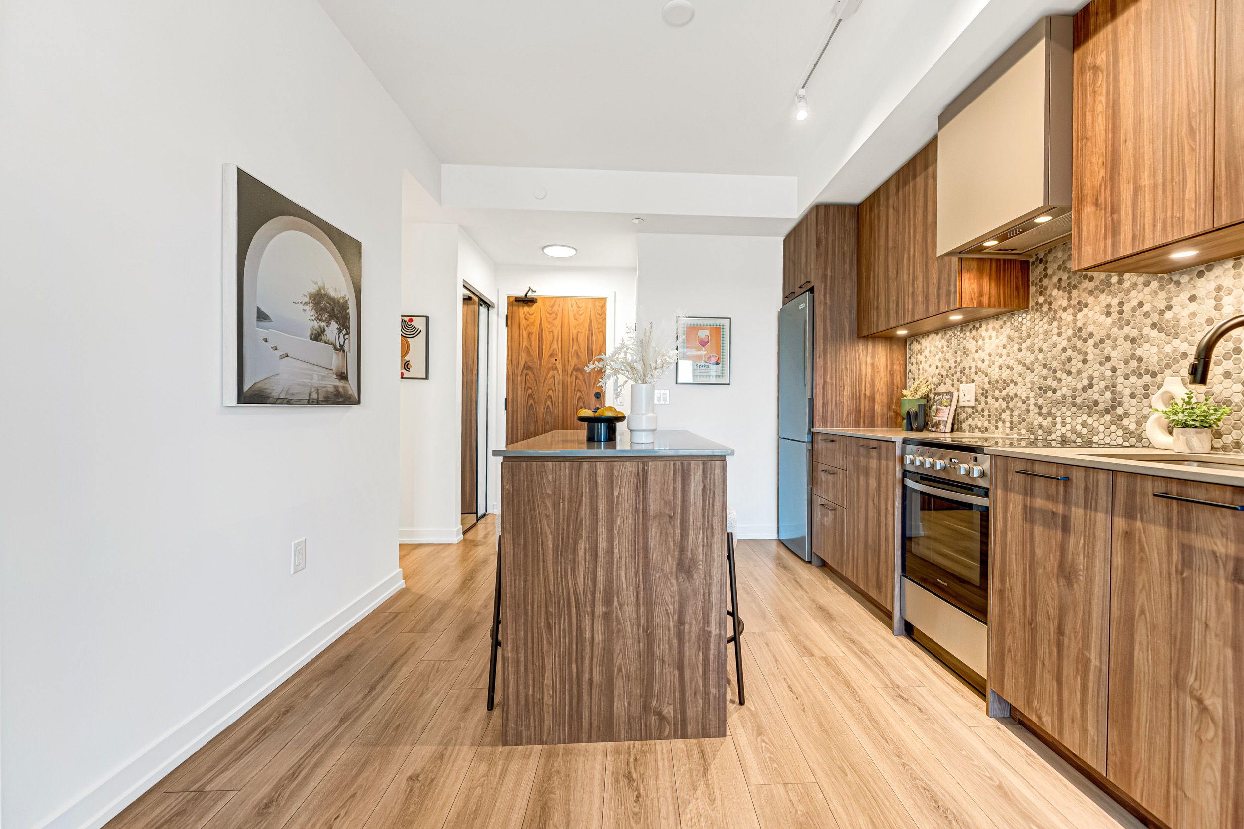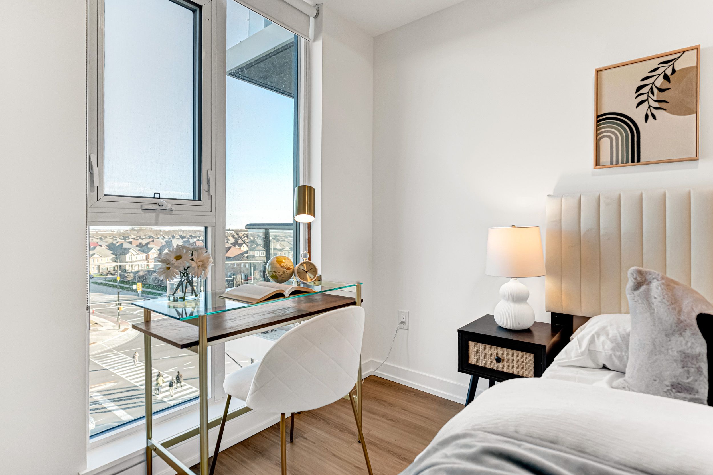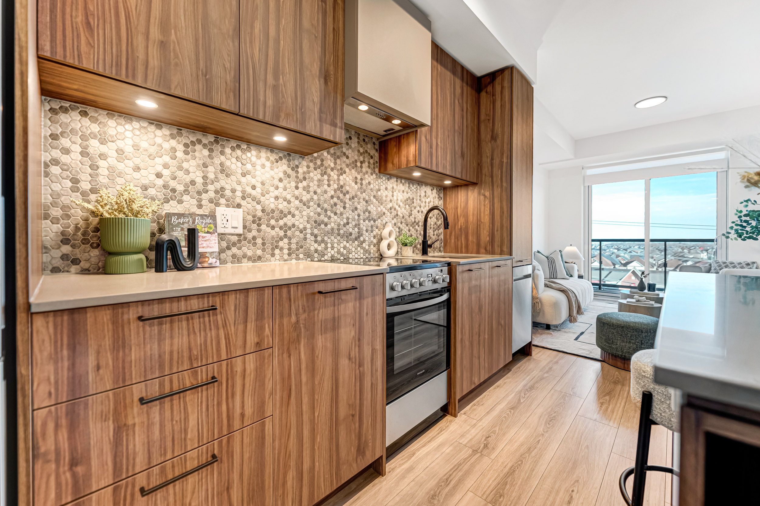 Welcome to this beautiful 1-bedroom plus den suite with unobstructed views in daniels mpv, ideally located in the heart of brampton's vibrant mount pleasant village community. Offering622 sq. Ft. Including the balcony, this unit delivers the perfect blend of modern style and everyday functionality. Soaring ceilings and floor-to-ceiling windows fill the open-concept layout with natural light while showcasing sweeping views of the surrounding neighbourhood and open sky. The chef-inspired kitchen is a true showpiece, featuring rich walnut cabinetry, a stylish backsplash, quartz countertops, stainless steel appliances, and a functional centre island with breakfast bar, perfect for both everyday living and entertaining. The living and dining area flows seamlessly to the balcony, an ideal spot to enjoy your morning coffee or evening sunset. The spacious primary bedroom offers a peaceful retreat with generous natural light, while the versatile den provides flexibility as a home office or potential second bedroom. The spa-inspired 4-piece bathroom features a soaker tub, classic white subway tile, and contemporary fixtures. Completing the suite is a convenient in-suite stacked washer and dryer. Includes 1 underground parking space and 1 locker. Prime location just steps to mount pleasant go station and with easy access to highways 410, 401, and 407. Close to transit, parks, plazas, schools, and everyday amenities. Whether you're a first-time buyer, downsizer, or savvy investor, this is an exceptional opportunity to own in one of brampton's most dynamic communities.