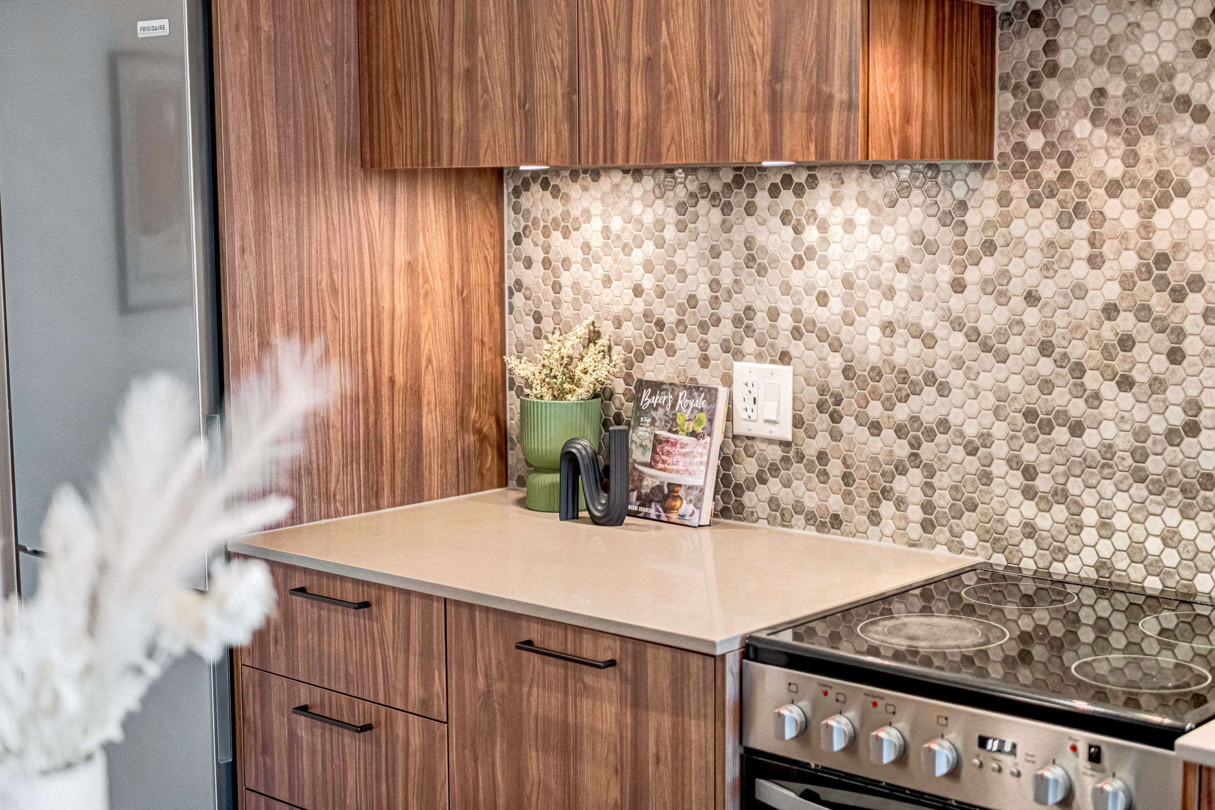 • Chef-inspired kitchen with quartz countertops and stainless steel appliances.