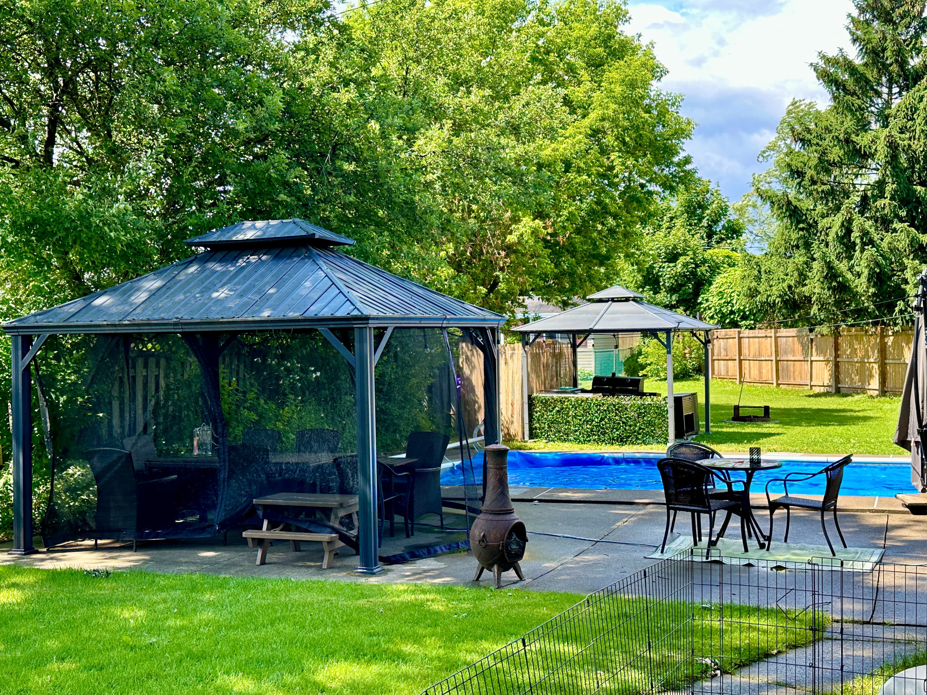 This home sets a new standard for the ideal family residence in a neighbourhood you'll love! Located in the esteemed chippewa park area, this beautifully updated 4+1 bed, 3 bath estate home is nestled in a secluded cul-de-sac directly across from the park. Enjoy resort-style living with a heated inground pool- ready for swimming as early as spring! Pool upgrades in 2023/2024 include a new liner, heater, pump, filter, and skimmer. The backyard features an exceptionally large lot (that spans the three neighbouring backyards), with two steel gazebos, canvas pergola, bonfire pit, flexible outdoor kitchen space, and mature trees for privacy. Original hardwood floors and timeless character have been preserved, enhanced with extensive professional renovations inside, outside, and across the grounds over the past 3 years. The home offers bright bedrooms and living spaces, renovated baths, an eat-in kitchen, and large living and dining rooms. The dining room can be converted to a fifth bedroom (with minor modifications)with existing 2-piece ensuite , or continue as dining/(flex space-family room/office), with walkout to deck and seasonally covered entertaining area. The lower level offers storage, a separate entrance, dry kitchenette, renovated 3-piece bath, and large bachelor suite, ideal for guests or extended family. Additional highlights include pull-down attic storage, 2023/2024 - new shingles, boiler, on-demand hot water tank, stained glass front and garage man doors, window glass replacement, some flooring, lighting, and paint, washer/dryer, kitchen fridge, stamped concrete walkway, and levelled front lawn with new sod. A rare opportunity to own a character-rich estate with modern luxury, exceptional outdoor amenities in the desirable chippewa park location! Huge lot size (as per geowarehouse) 186. 46 ft x 83. 65 ft x 60. 15 ft x 153. 49 ft. * video coming soon!*
