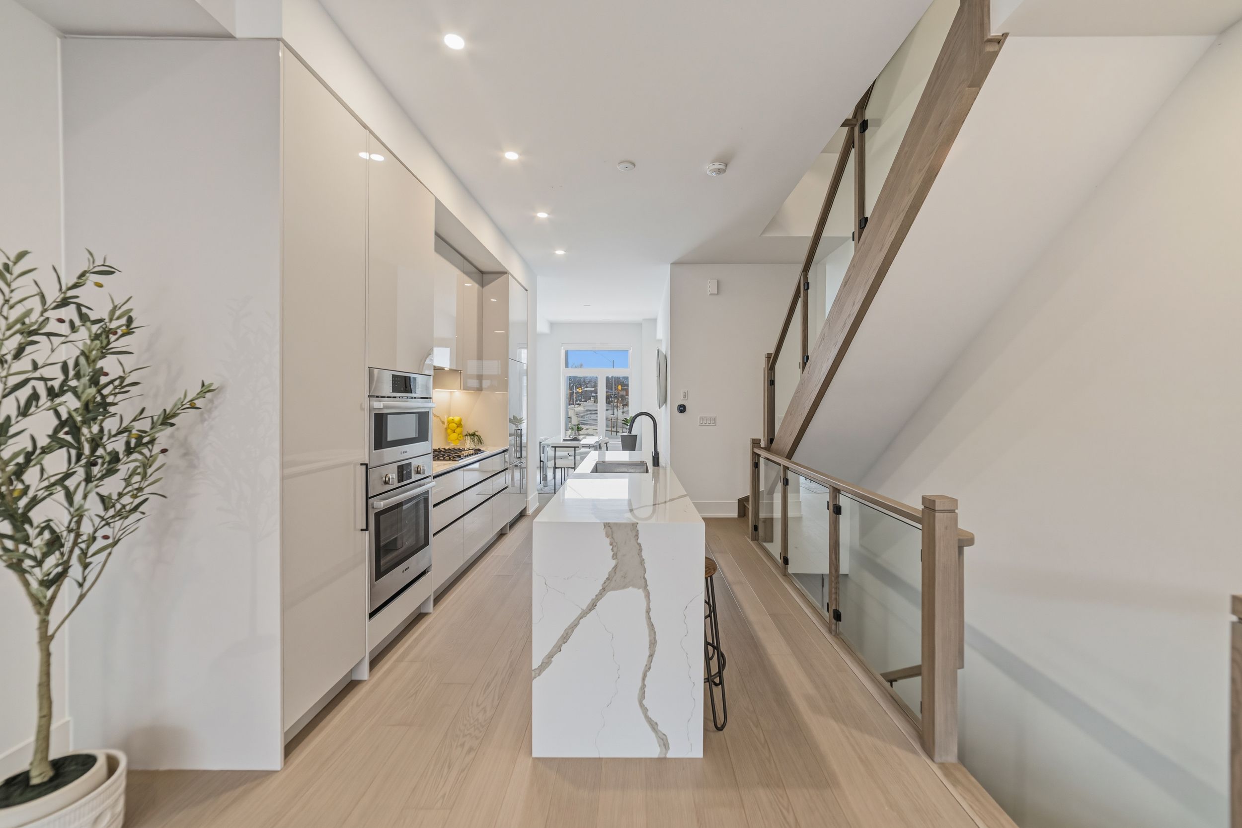 • Gourmet kitchen with premium appliances and striking quartz waterfall island.