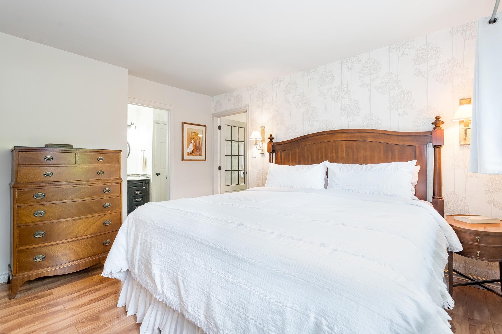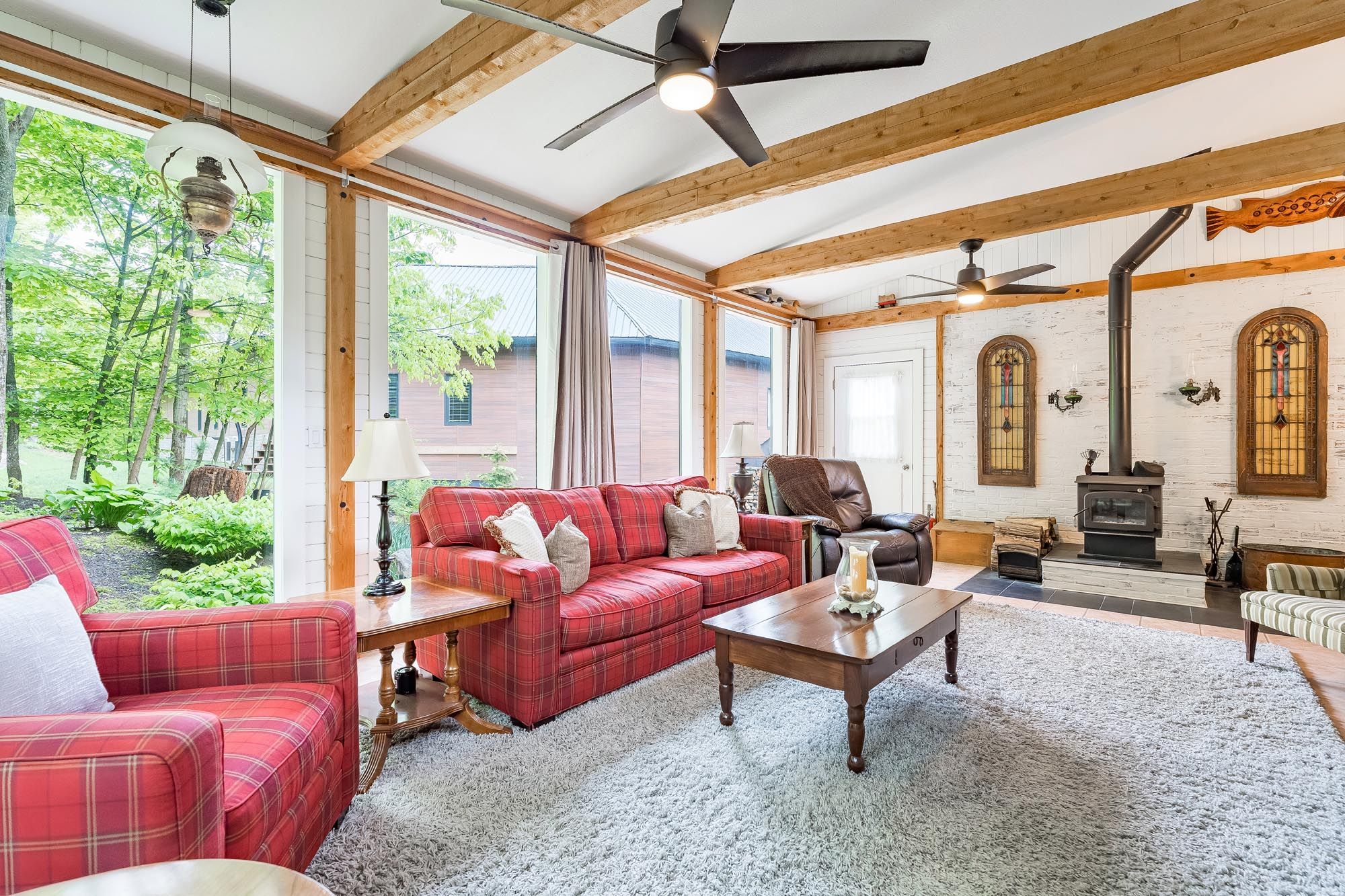 • Bright sunroom with wood stove, connecting indoor and outdoor living.