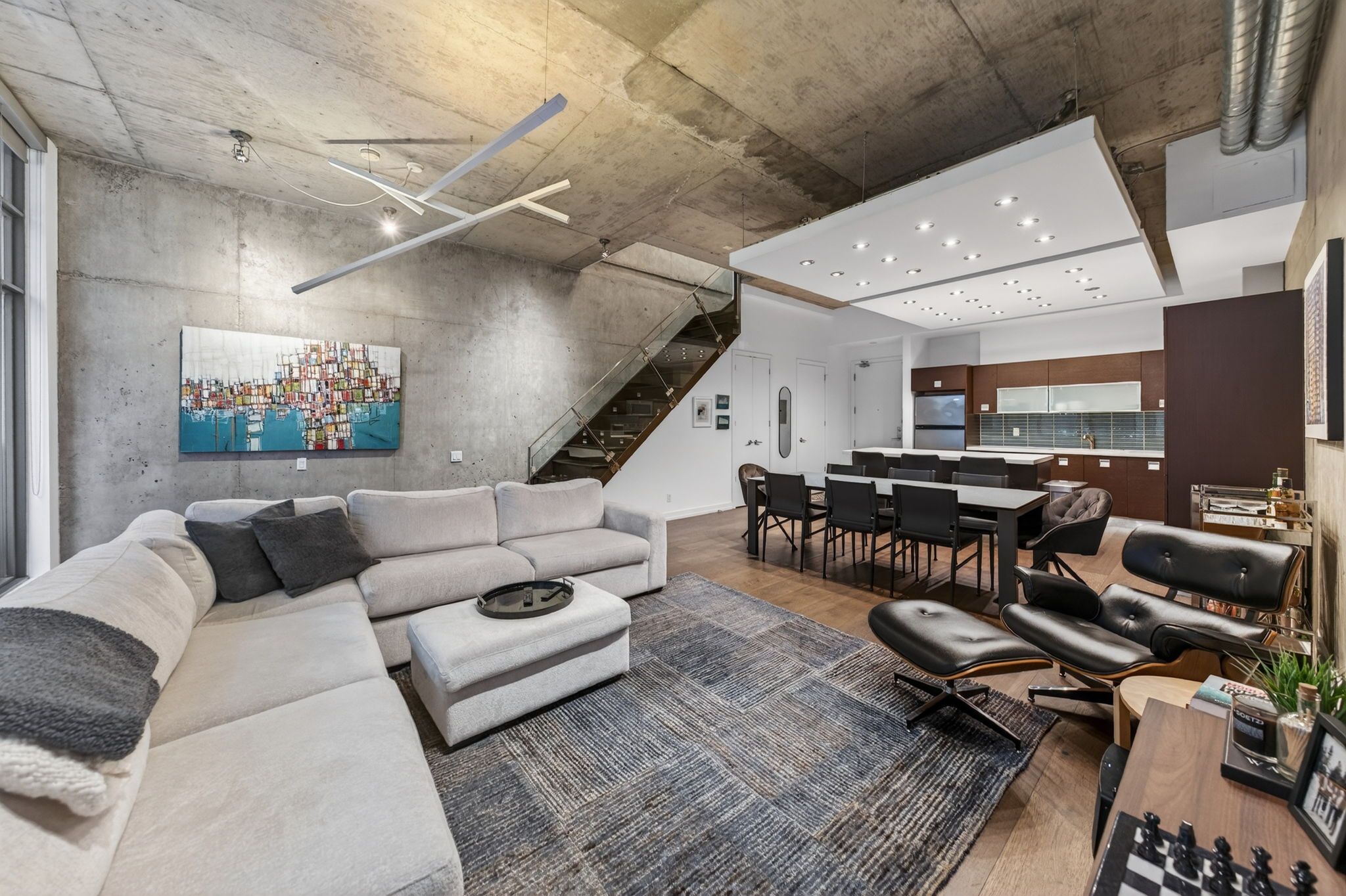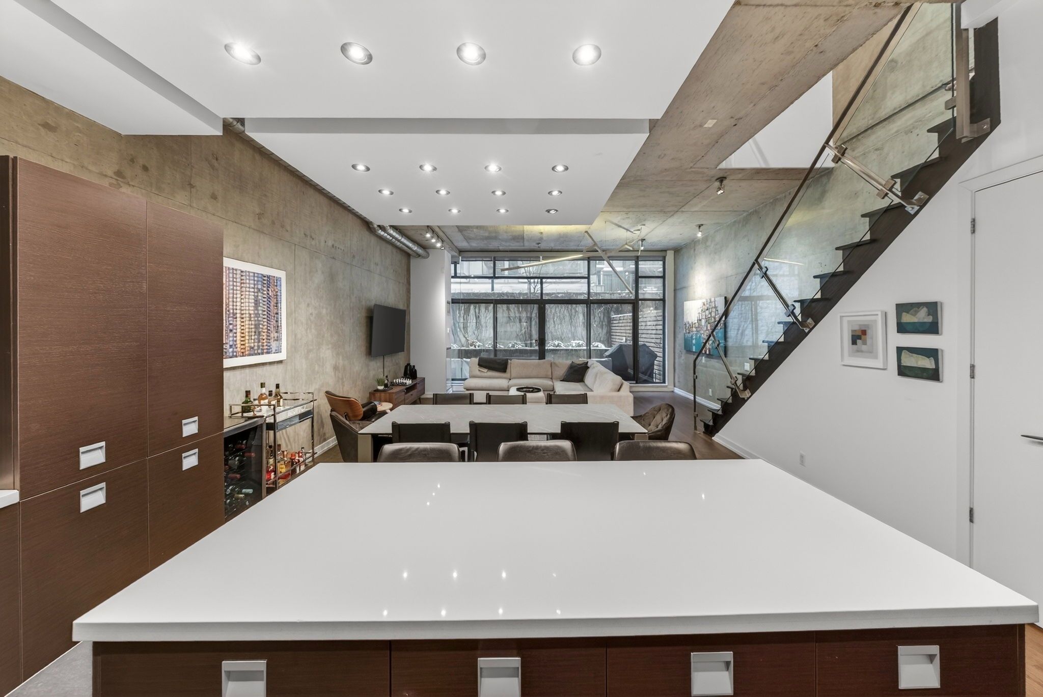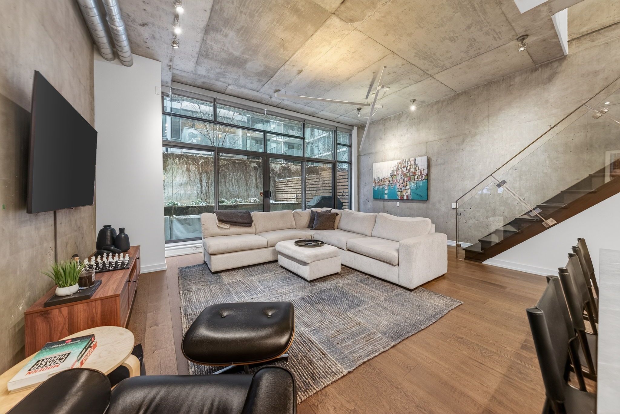 Ultra-modern 2-storey loft residence in the heart of vibrant king west. Offering over 1,600 sq ft of refined living space, this 2-bedroom plus expansive den, 3-bathroom home blends sophisticated design with effortless comfort. Soaring 11-foot ceilings on the main floor, dramatic floor-to-ceiling windows with custom treatments, and striking exposed concrete accents. The designer italian scavolini kitchen is the centerpiece of the home, complete with an oversized island, premium finishes, and seamlessly integrated european lighting throughout. A statement chandelier and custom floating ceiling features with ambient lighting elevate the space even further. A luxurious primary suite featuring an exceptional ensuite retreat. The massive den offers incredible flexibility-perfect as a home office, media lounge, or additional guest space. Extend your living outdoors to a private 460 sq ft terrace and garden oasis, complete with lighting. An unbeatable downtown location just steps to your favorite cafés, restaurants, and shops.