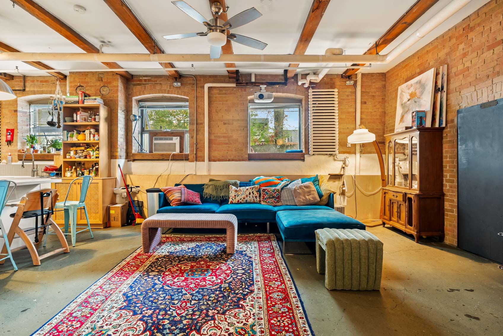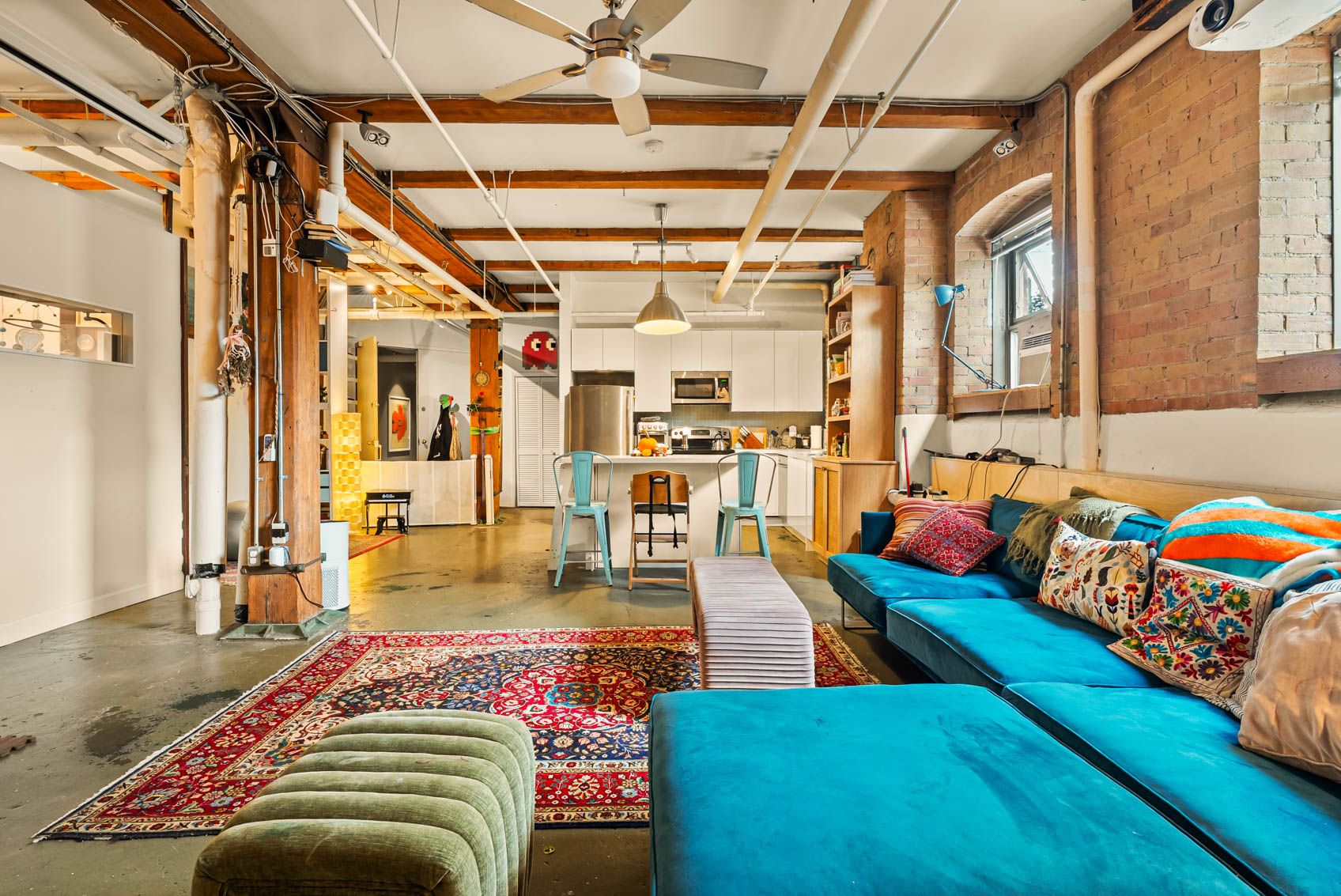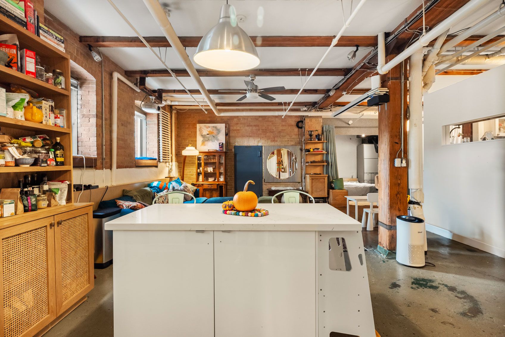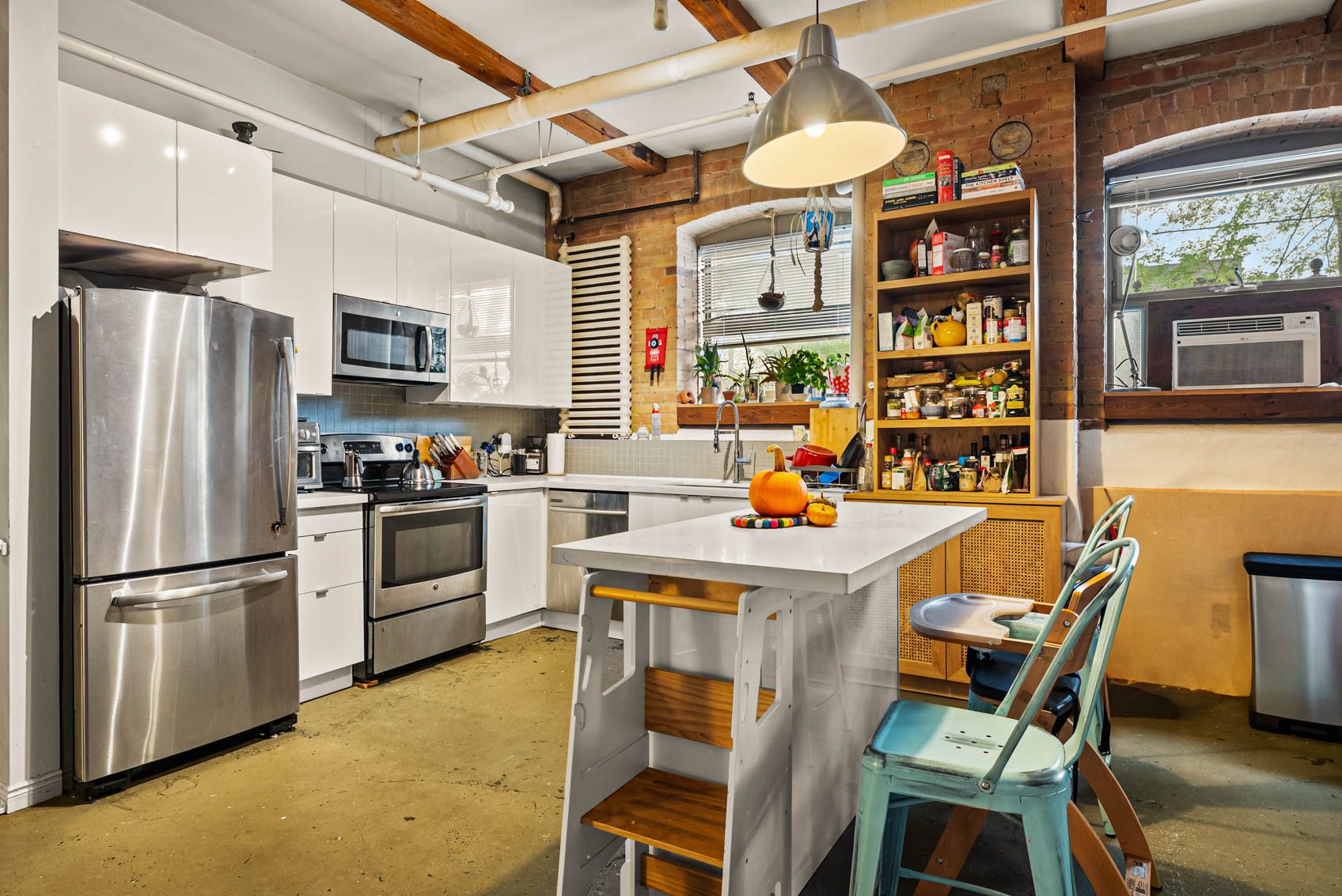 • Features exposed brick, concrete floors, and tall ceilings.