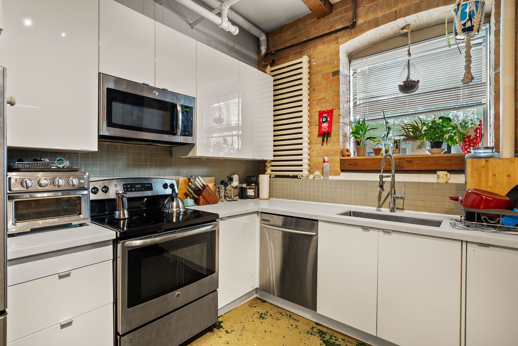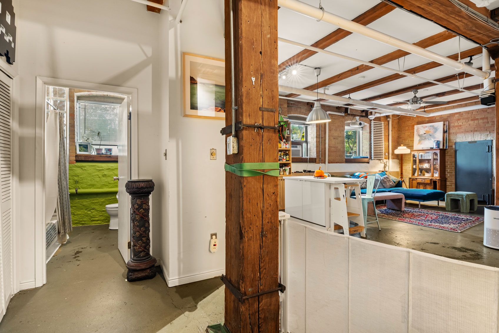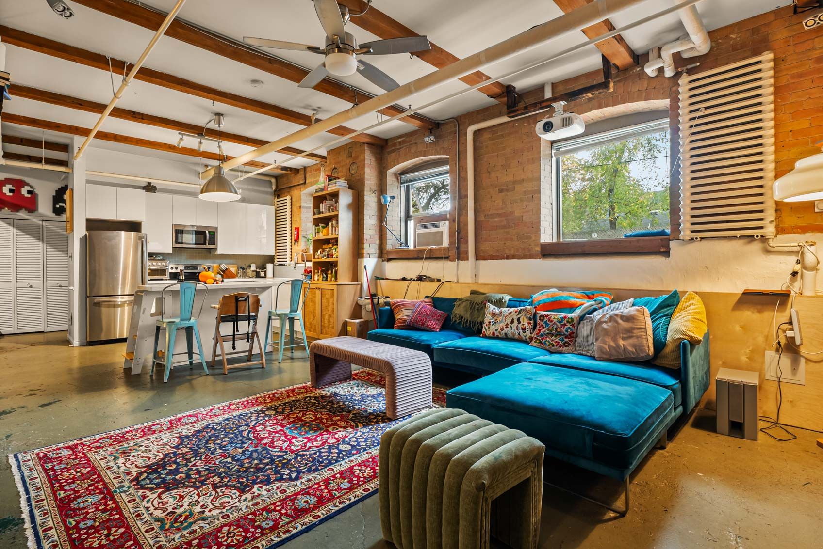 • Features exposed brick, concrete floors, and tall ceilings.