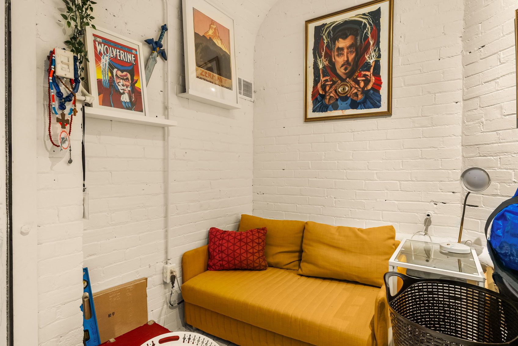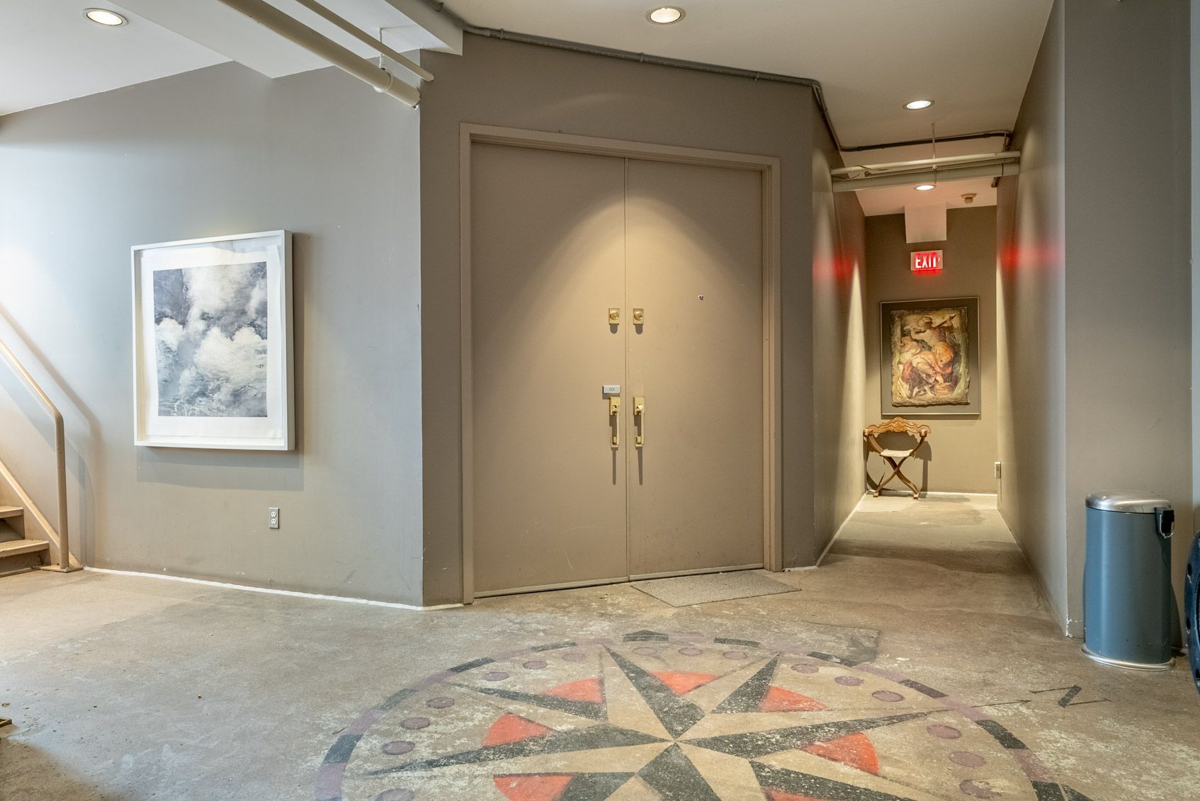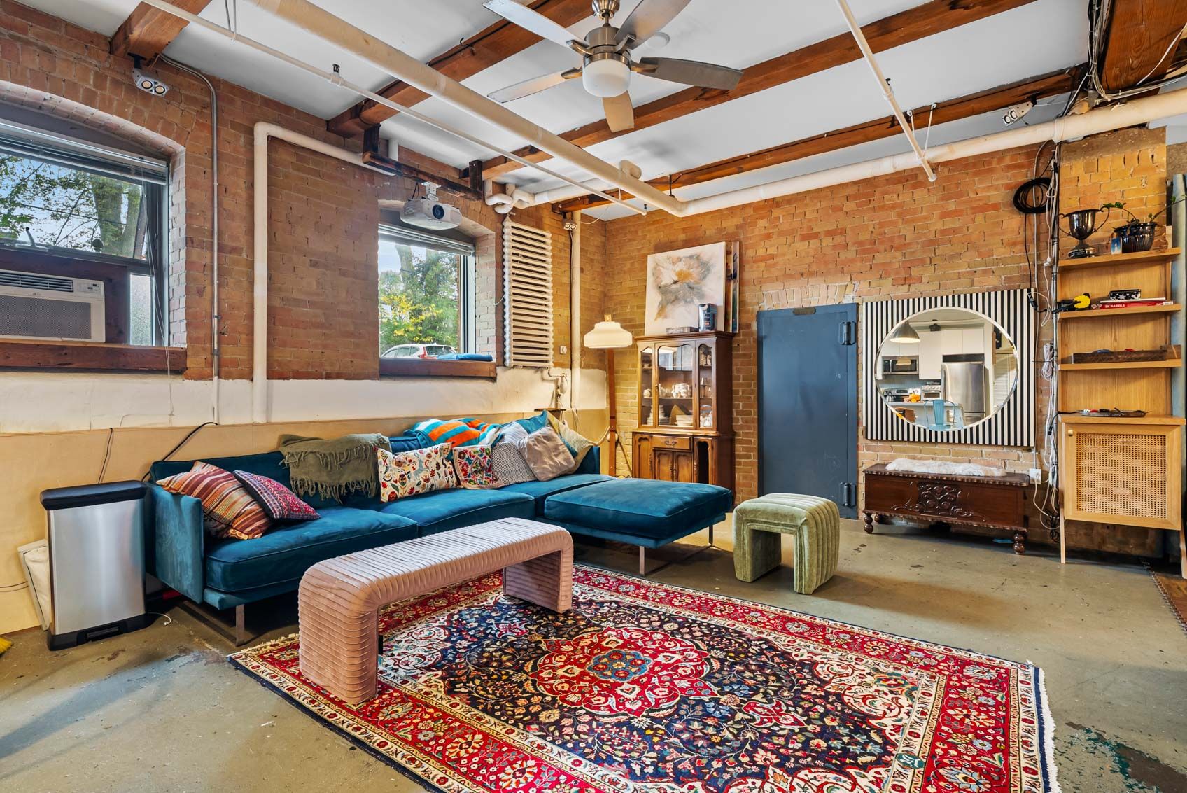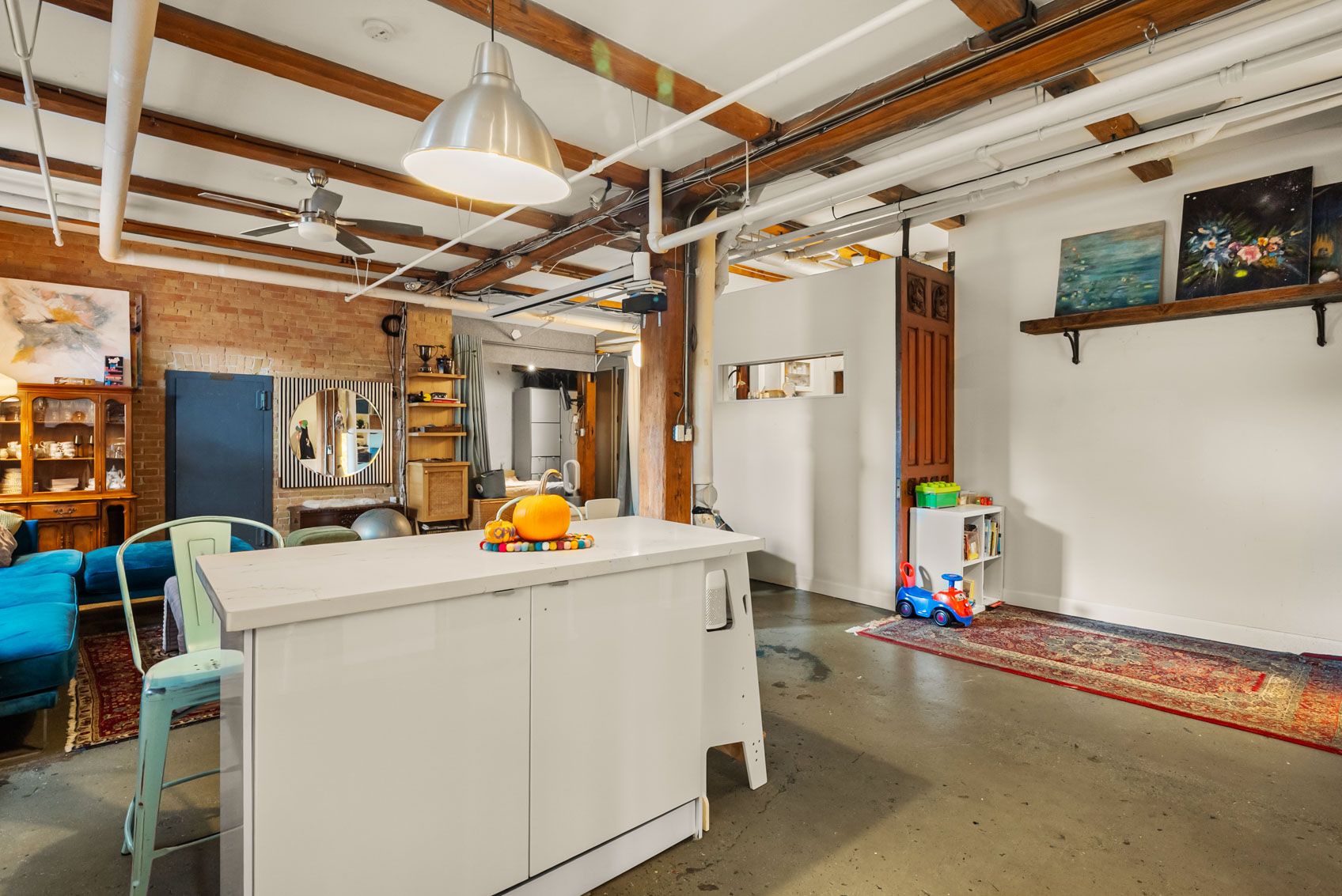 • Features exposed brick, concrete floors, and tall ceilings.
