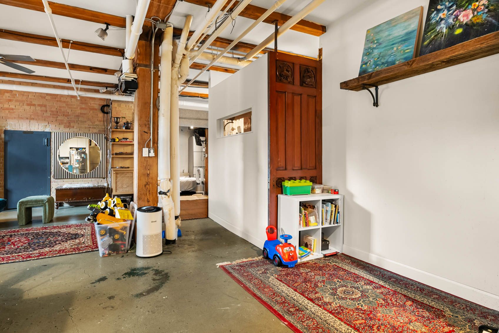 • Spacious open concept layout with wood post and beam design.