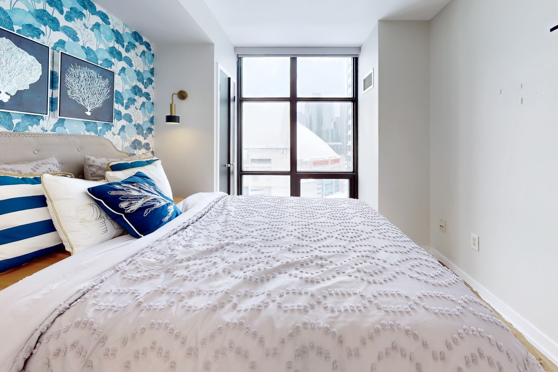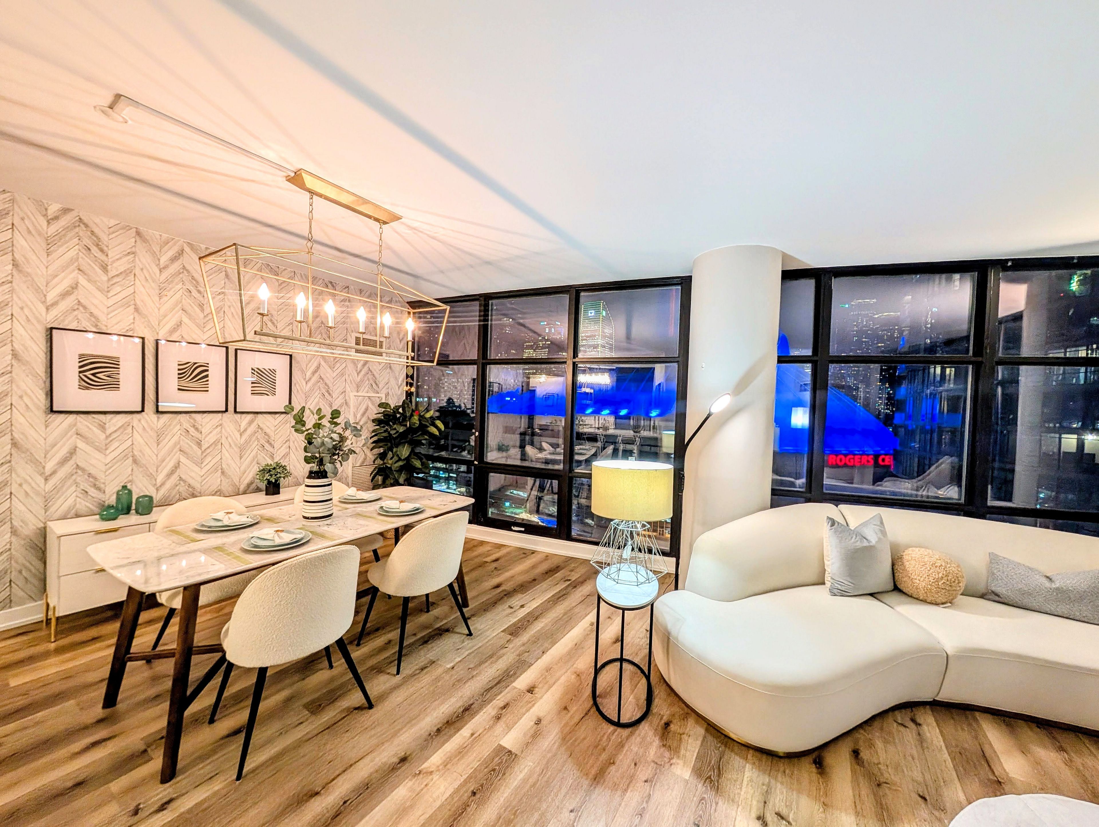 Wake up to sweeping lake and skyline views from one of the most coveted vantage points on toronto's waterfront. This bright and elegant corner suite offers over 1,200 sq ft of refined indoor living, with breathtaking south and east exposures showcasing lake ontario, the toronto islands, rogers centre, and the cn tower. Designed for both comfort and sophistication, the residence features a highly desirable 2+1 bedroom, 2-bath split-bedroom layout, ideal for privacy and functionality. The open-concept living and dining area is highlighted by floor-to-ceiling windows, a stylish accent wall, electric fireplace, and a walkout to a balcony capturing some of the best unobstructed views in the city. The modern kitchen is sleek and functional, featuring stainless steel appliances, a gas stove, contemporary cabinetry, quartz countertops, backsplash, and a striking waterfall island-perfect for entertaining. The primary bedroom retreat enjoys serene lake views, motorized blinds, a generous walk-in closet with california closet organizers, and a luxurious ensuite. The well-proportioned second bedroom and spacious den offer excellent flexibility for a home office, fitness area, or additional sleeping space. Tastefully updated bathrooms complete the suite. Located in an unmatched downtown waterfront setting, just steps to transit, shops, dining, nightlife, sports and entertainment venues, the financial district, and the lakefront. This is urban luxury living at its finest-ready for you to call home.