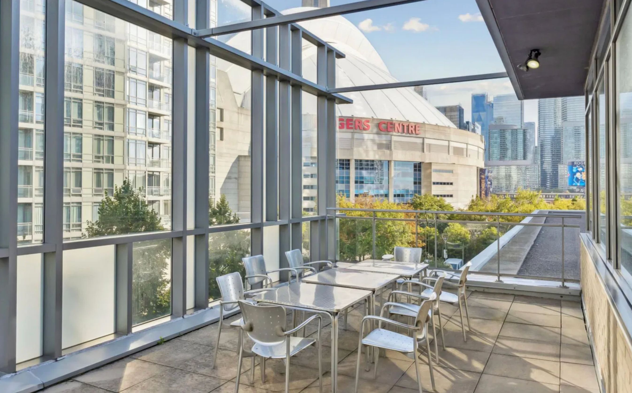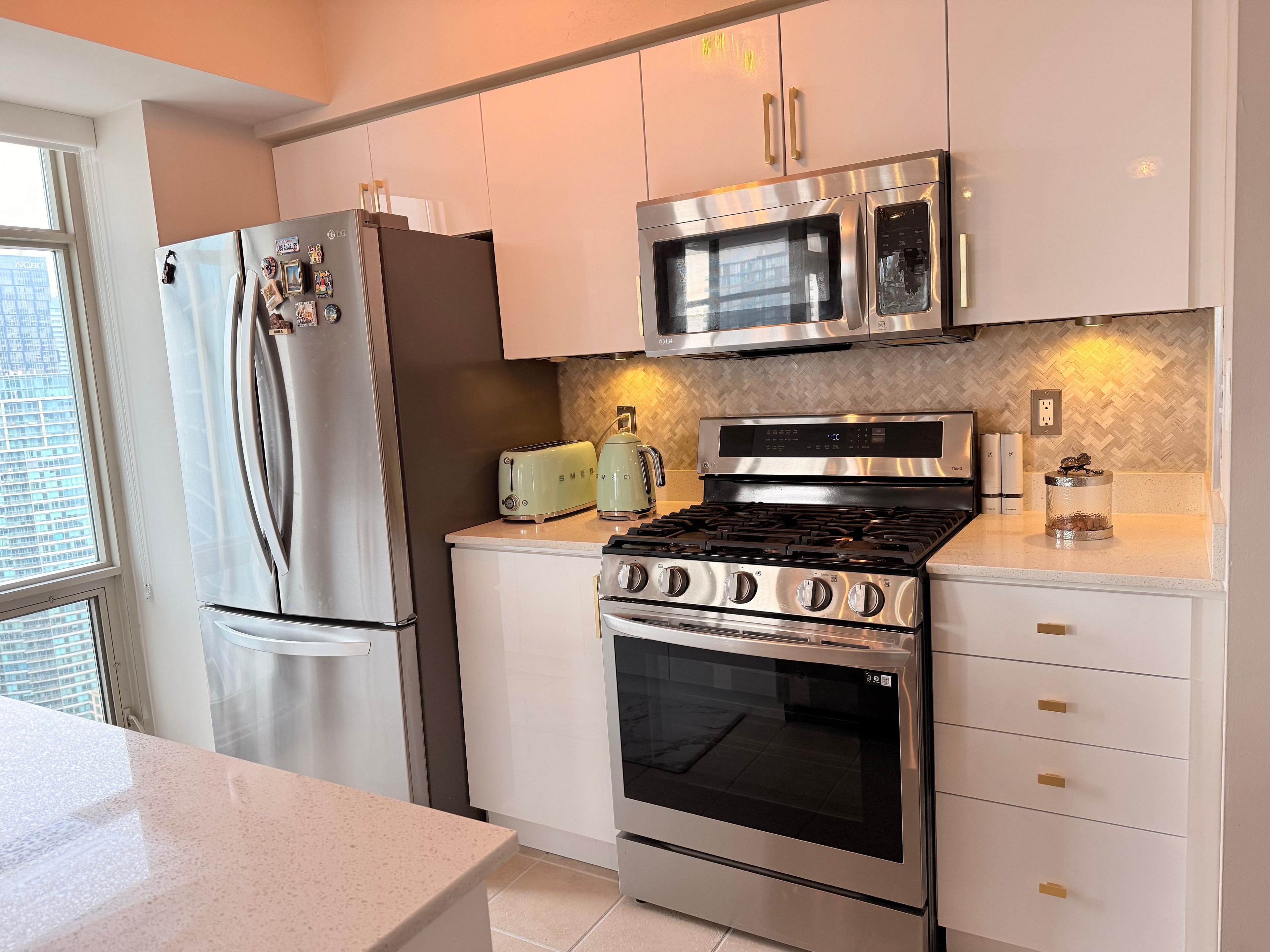Experience elevated downtown living in this rarely offered high-floor corner unit with breathtaking panoramic city views and floor-to-ceiling windows. Larger-than-average layout offering enhanced living space compared to typical units. A chef-inspired kitchen with a sought-after gas stove, and upgraded appliances. The spacious bedroom features smart motorized blinds for added comfort and convenience. The den has been enhanced with a custom closet-ideal for a home office. All utilities and parking (p1) is included. Unmatched amenities: exclusive access to the 30,000 sq ft superclub with fully equipped fitness centre, indoor pool, sports courts, bowling, and more. Prime downtown location: steps to the cn tower and rogers centre, transit, waterfront, restaurants, and entertainment.