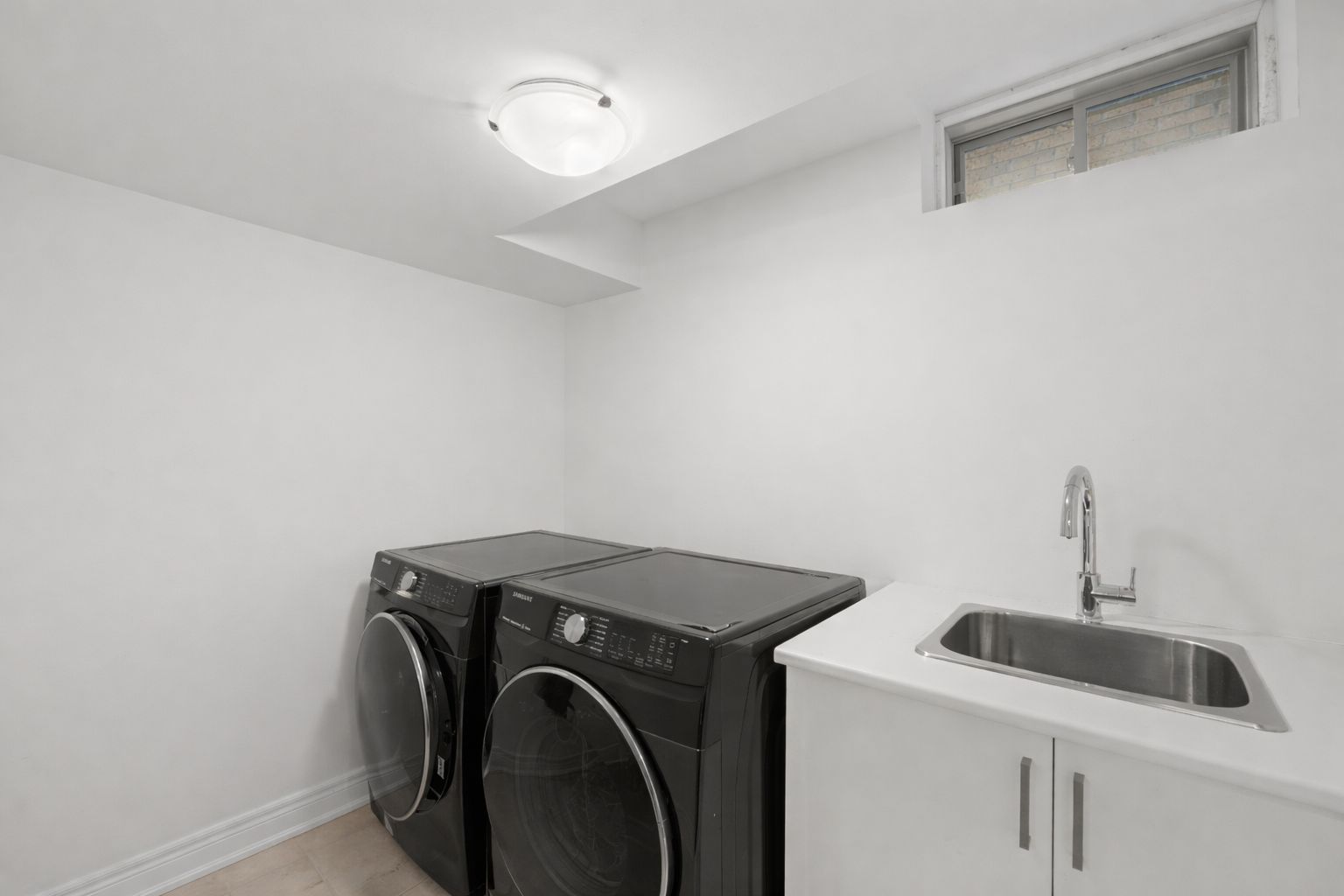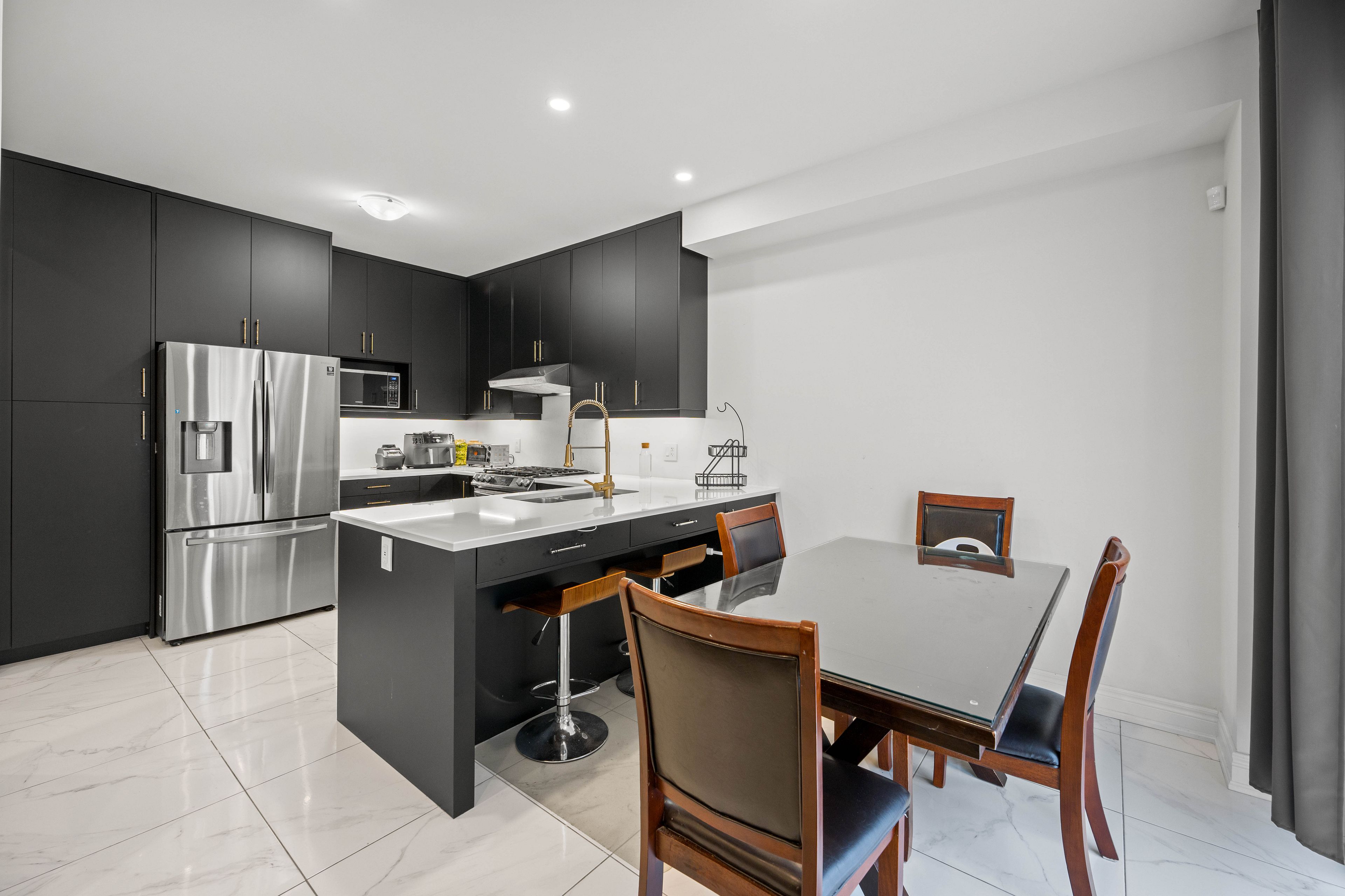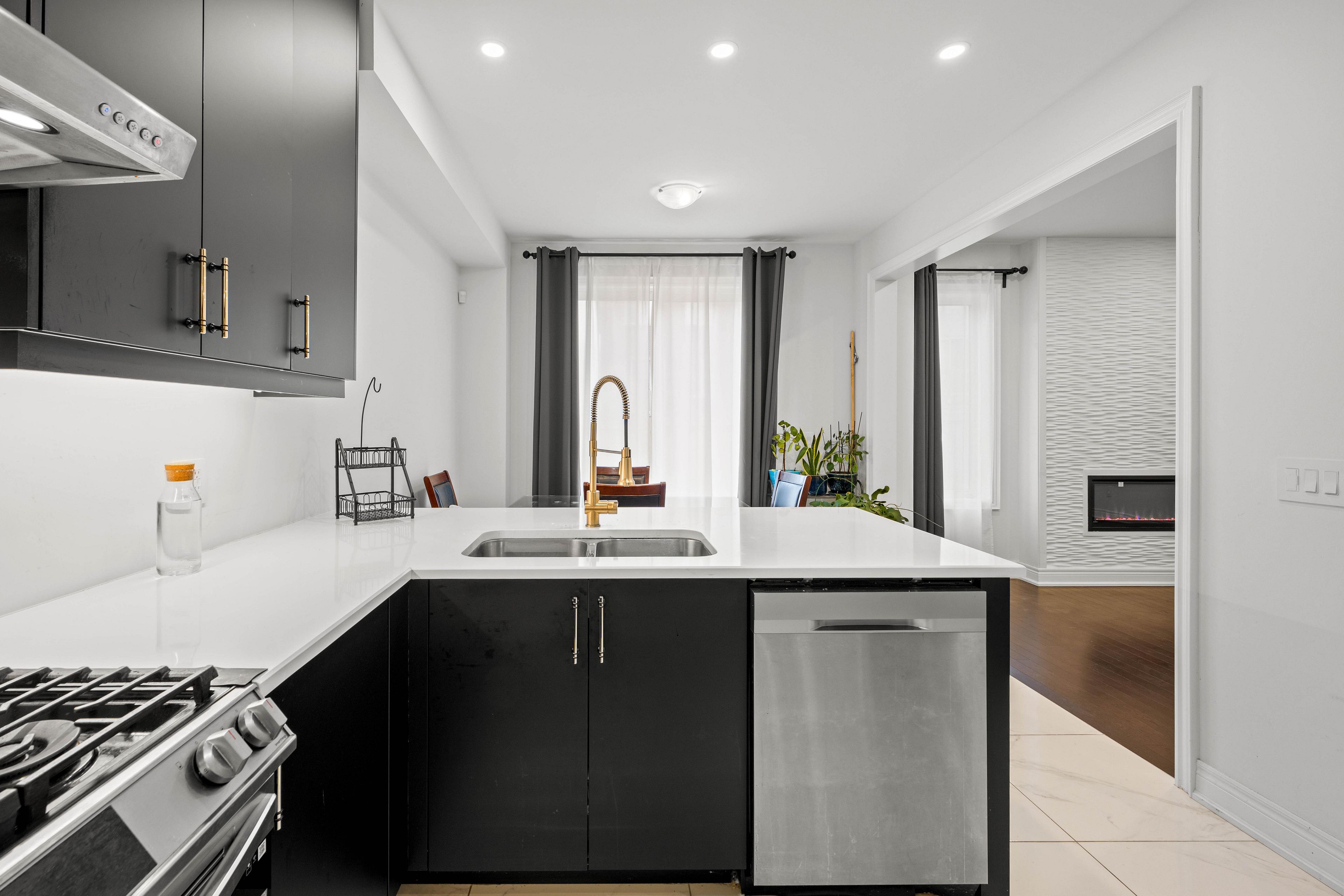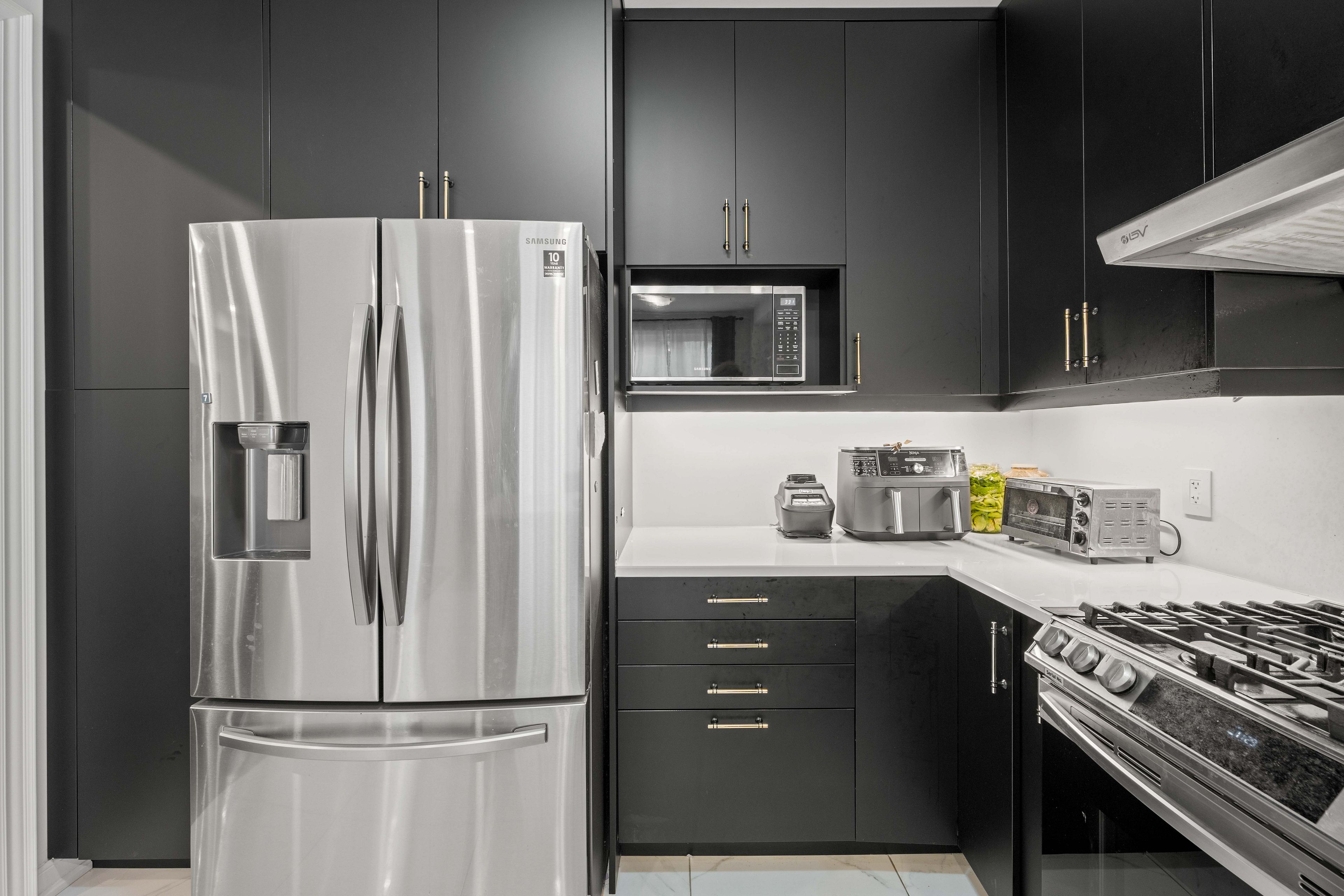 • Kitchen features stainless steel appliances, quartz countertops, and gas stove.