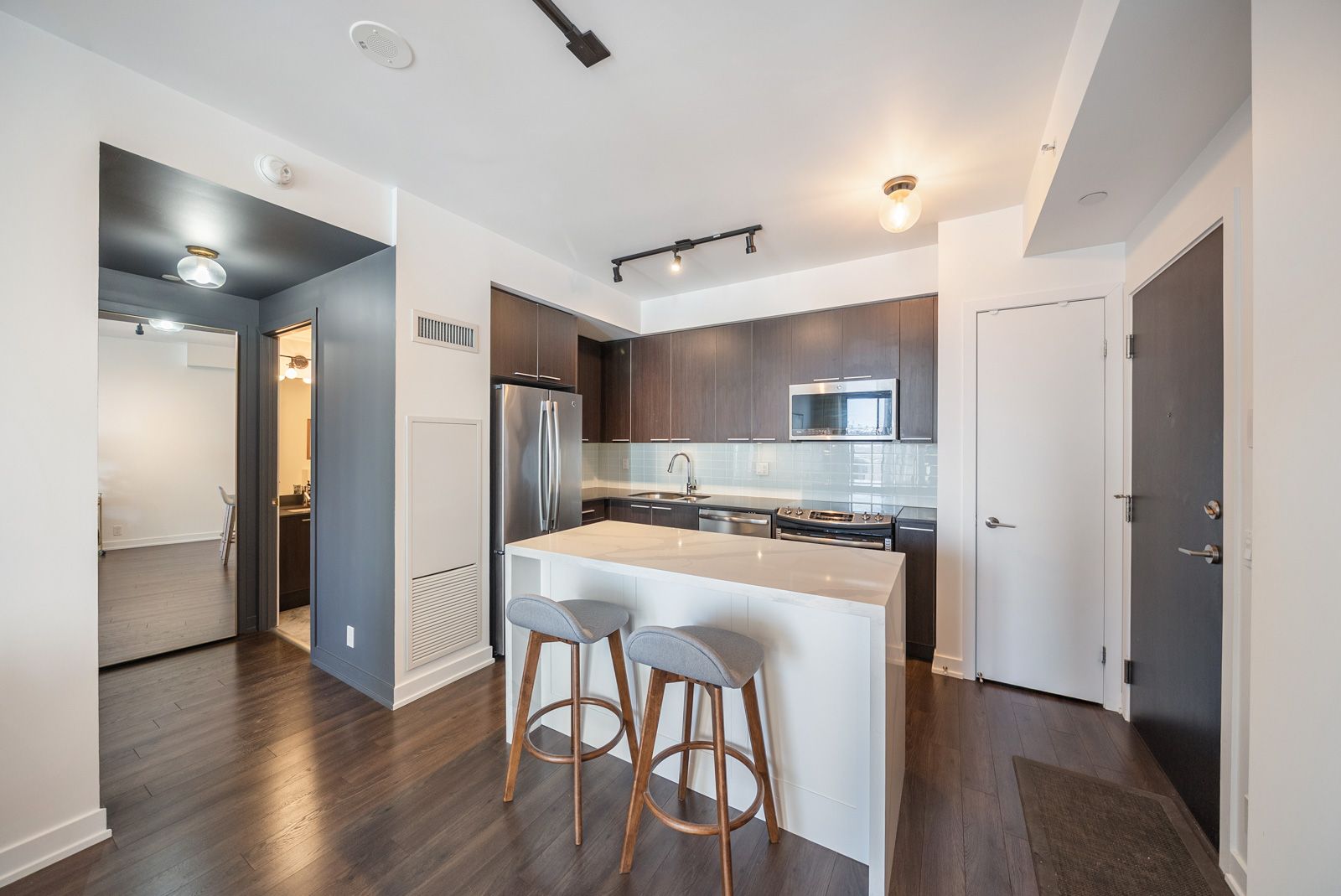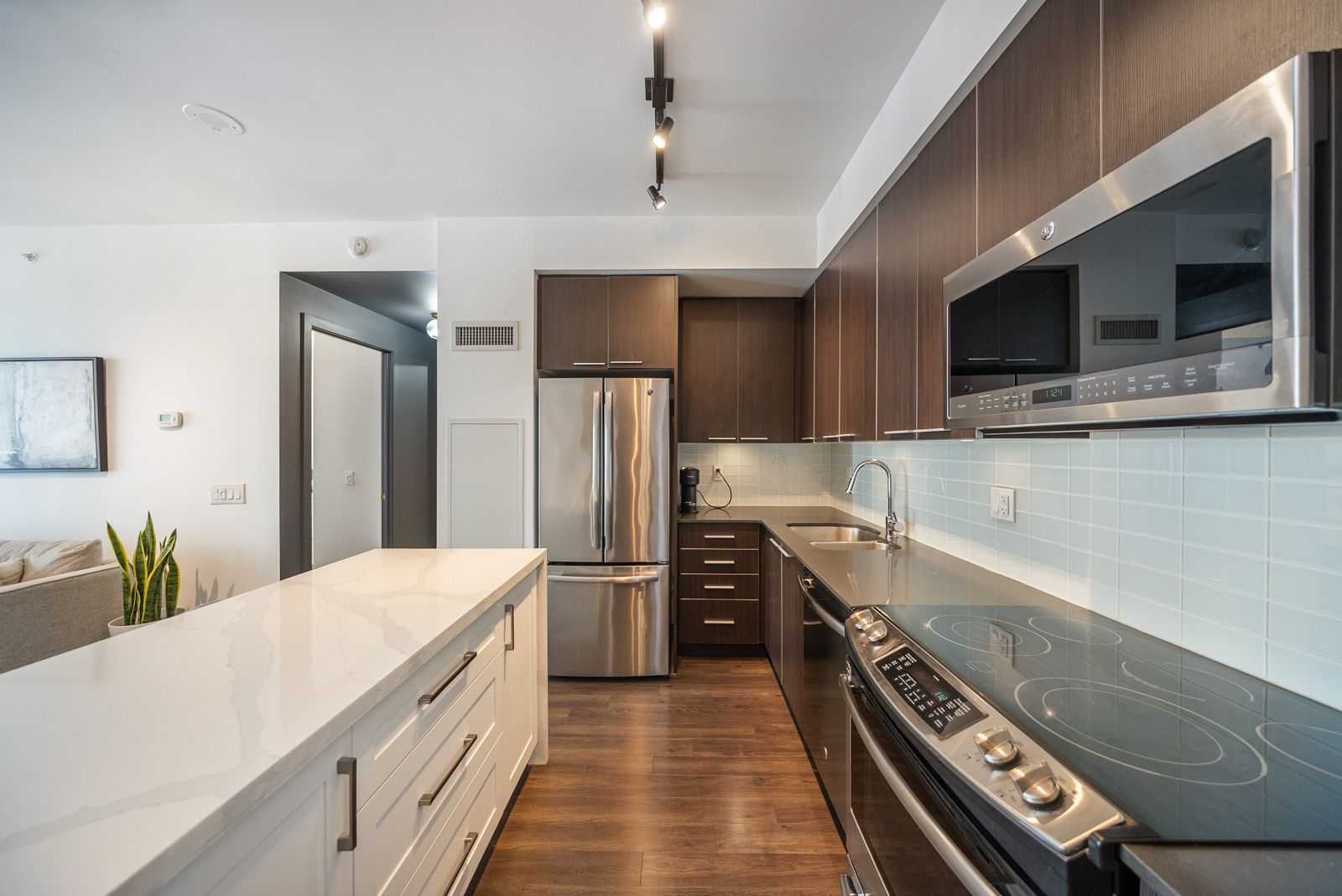 • Contemporary kitchen features stainless steel appliances and quartz island.