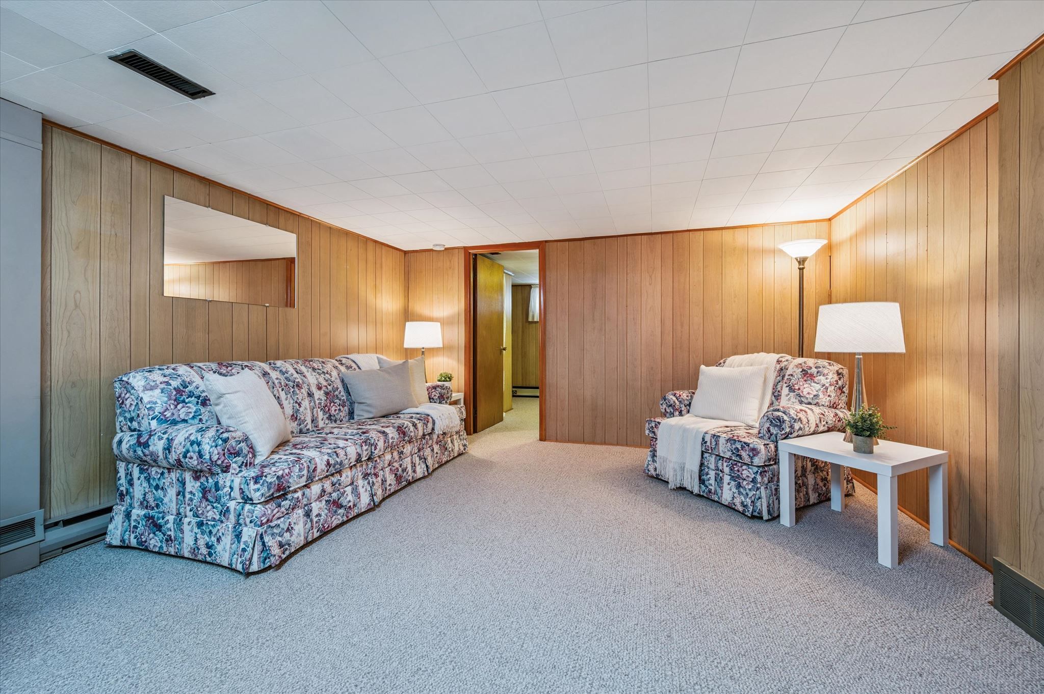 • Finished basement with recreation room, wet bar, and extra bedroom.