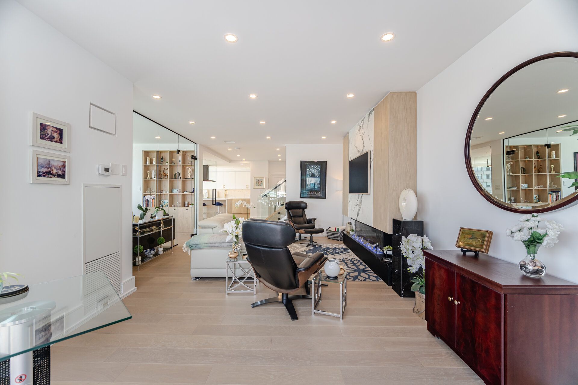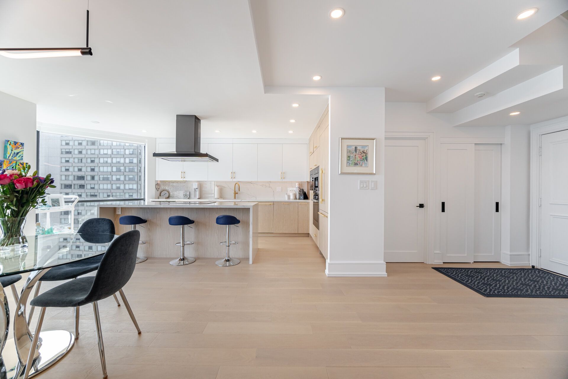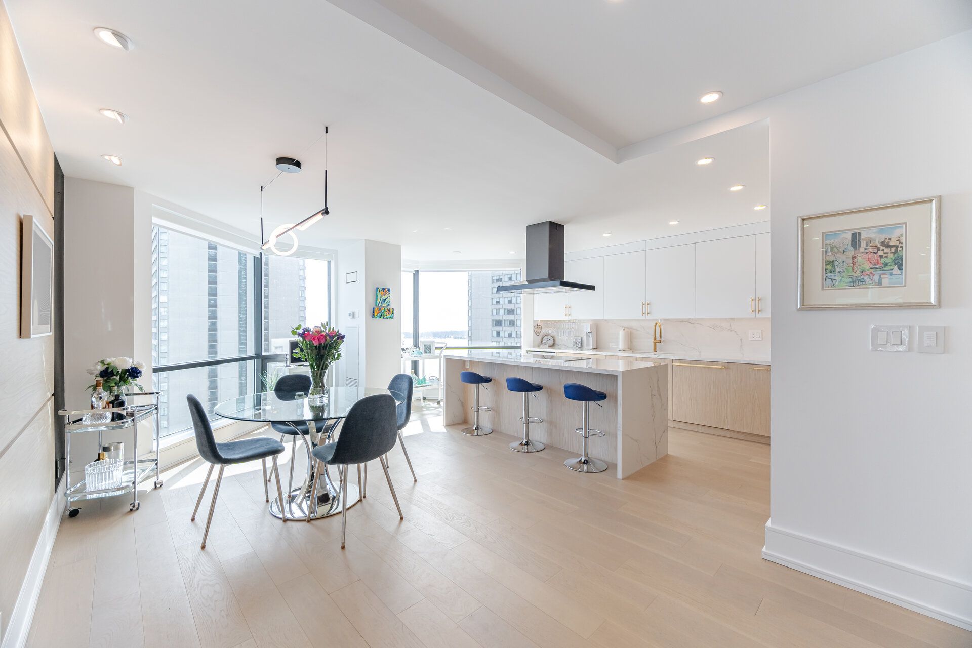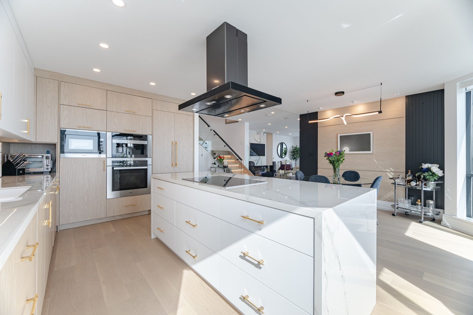 • Sleek kitchen with Miele appliances and waterfall island for cooking enthusiasts.