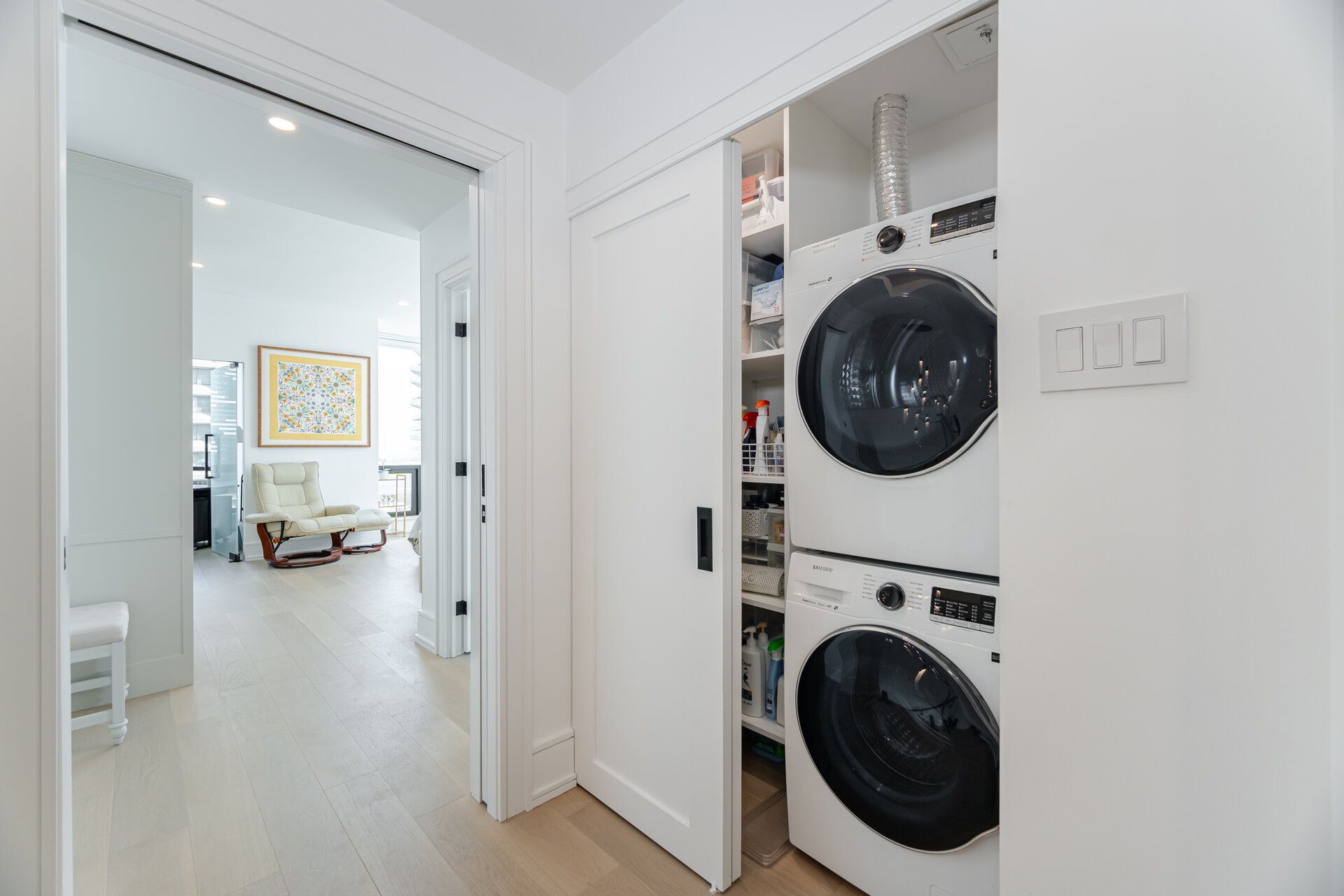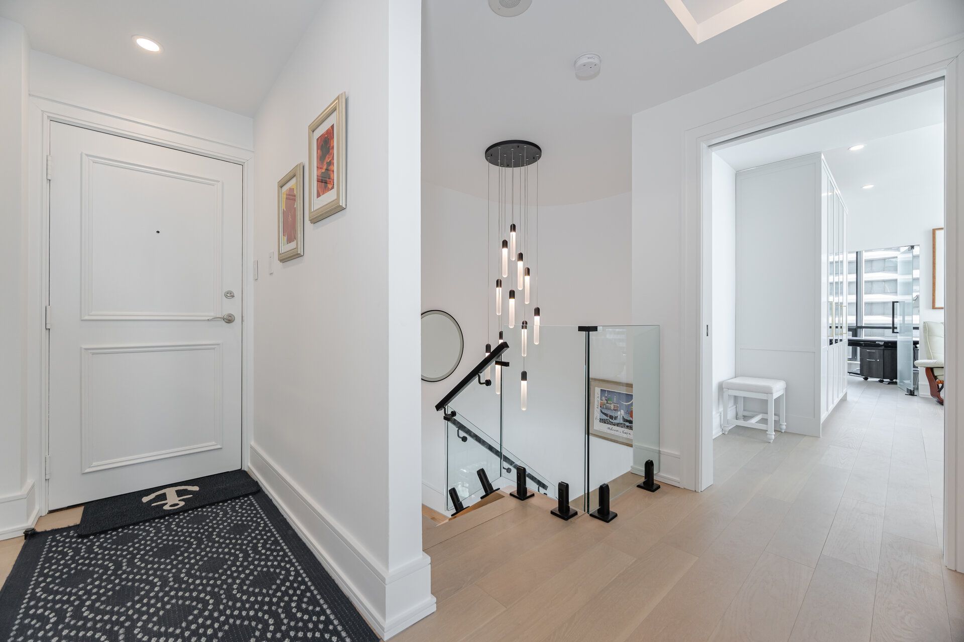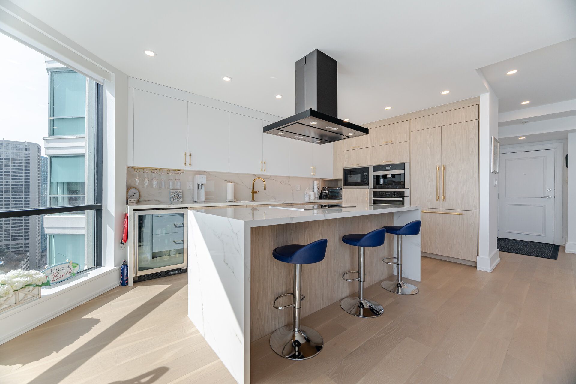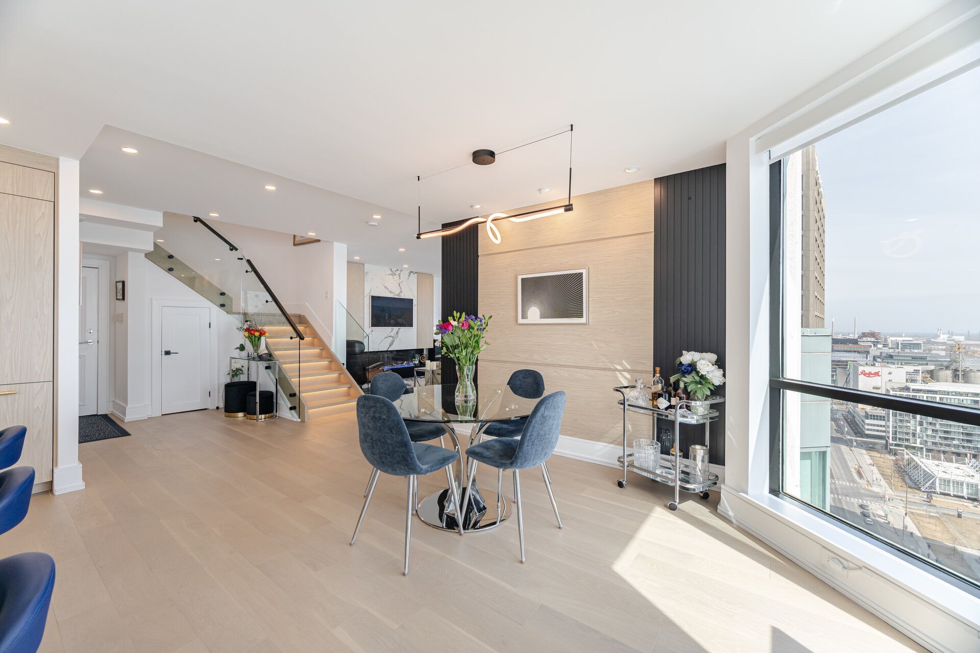 Perched high above the waterfront at the foot of yonge street, this renovated two-storey residence delivers over 2,100 square feet of refined interior living plus an extraordinary 375 square foot terrace that feels like your own private observatory over lake ontario. South and east exposures stretch across floor to ceiling windows, framing uninterrupted water views that shift from sunrise to sunset. Inside, the design is polished, intentional, and quietly luxurious. Smooth ceilings, engineered hardwood floors, and a sculptural glass-railed staircase with integrated lighting create a sense of flow across both levels. The living room anchors the home with a statement feature wall. The kitchen is sleek, confident, and built for real living. Miele appliances, including a built-in coffee system, waterfall island, and extensive slide-out storage deliver both beauty and function. Decorative panelled walls and subtle sconce lighting add a layer of tailored sophistication throughout the dining room, primary suite, and baths. Upstairs, the primary retreat feels closer to a boutique hotel suite than a bedroom. Generous in scale with custom walk-in closet organizers and a quiet alcove sitting area, it flows into a spa-inspired ensuite. A second bedroom and a main floor glass-enclosed home office add flexibility for guests, work, or creative pursuits. And then there's the terrace. Rare and expansive. A place to entertain, garden, recharge, or simply watch the lake shift colours throughout the day. Residents enjoy resort style amenities including indoor/outdoor pools, hot tub and steam room, gym and golf simulator, squash, pickleball and basketball courts, theatre room, yoga studio, kids play space, games lounge, guest suites, and entertaining rooms with terraces and bbqs. All utilities are included, along with cable and bell fibe. Two parking spaces, three lockers, ev charging, bike storage, and steps to the path and union station make this an extraordinary opportunity.