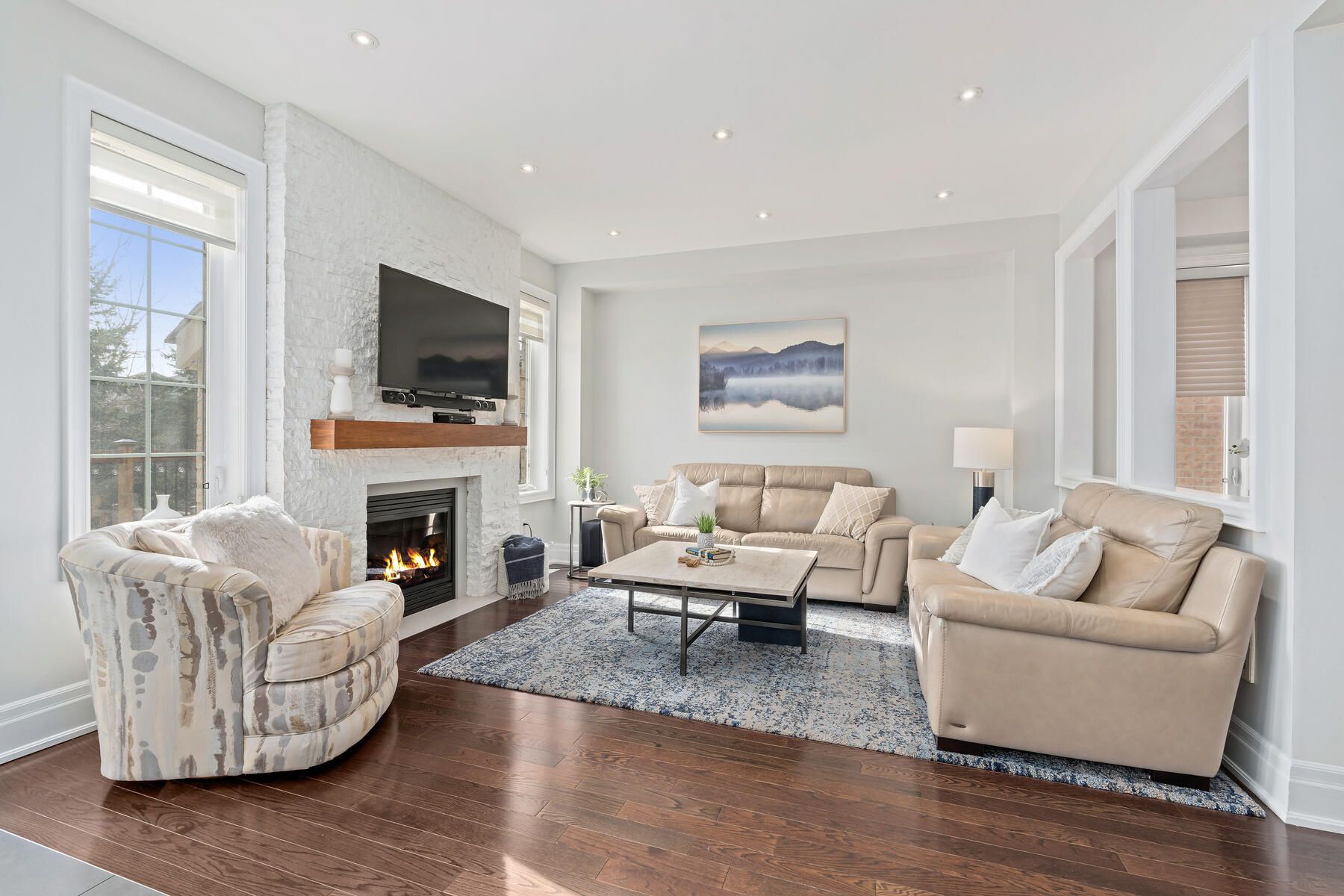 Wake up to breathtaking sunrises over the pond in this stunning georgetown south home, perfectly positioned on a premium lot where nature becomes part of your everyday life. From the moment you arrive, the custom flagstone porch and grand double door entry set the tone for what awaits inside. Step into a soaring foyer that opens into a beautifully finished home, where every detail has been thoughtfully curated. The heart of the home is a magazine worthy, fully renovated kitchen designed to impress, flowing seamlessly into the family room, complete with a striking stone gas fireplace and expansive views of the water beyond. With 4 spacious bedrooms and 4 bathrooms, including a dream primary retreat with a luxurious ensuite, this home offers both comfort and sophistication. Hardwood floors, custom ceilings, crown moulding, and pot lights add warmth and elegance. The finished basement with a custom fireplace provides the perfect space for a home office or quiet retreat, adapting effortlessly to your lifestyle. Step outside to a spectacular two-tier deck wrapped in natural stone, extending around the side and front of the home-an ideal setting for entertaining or simply unwinding while surrounded by peaceful views and the sounds of nature. Located just steps to scenic walking trails, the gellert community centre, shopping, and convenient commuter routes, this home blends tranquility with everyday convenience. With no sidewalk, there's parking for up to 6 vehicles. This is more than a home, it's a lifestyle you'll fall in love with.