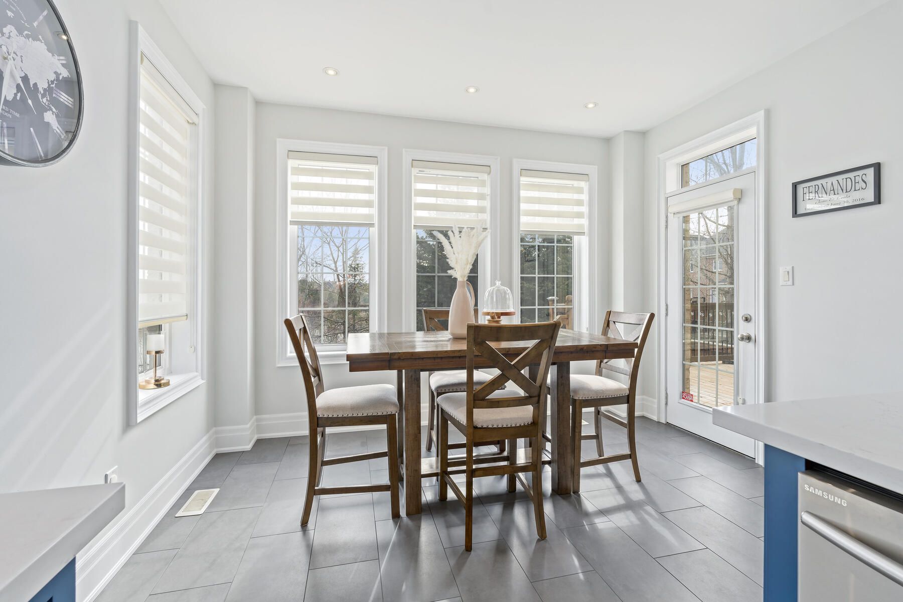 • Renovated kitchen flows into a cozy family room with a gas fireplace.