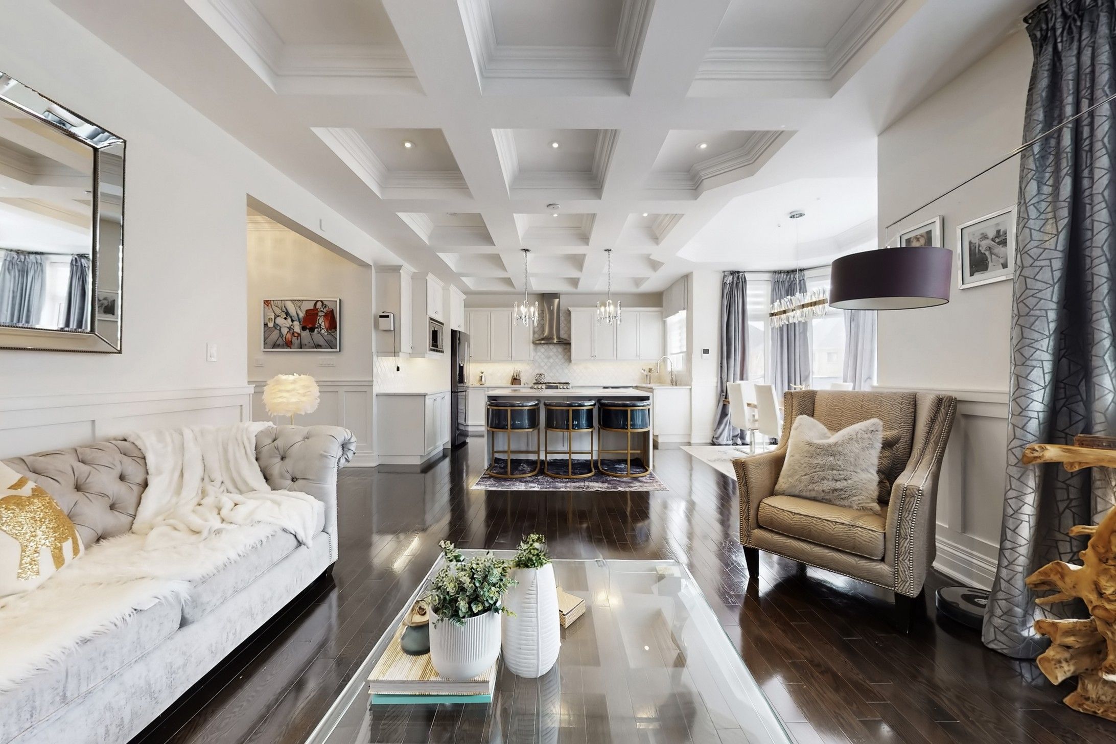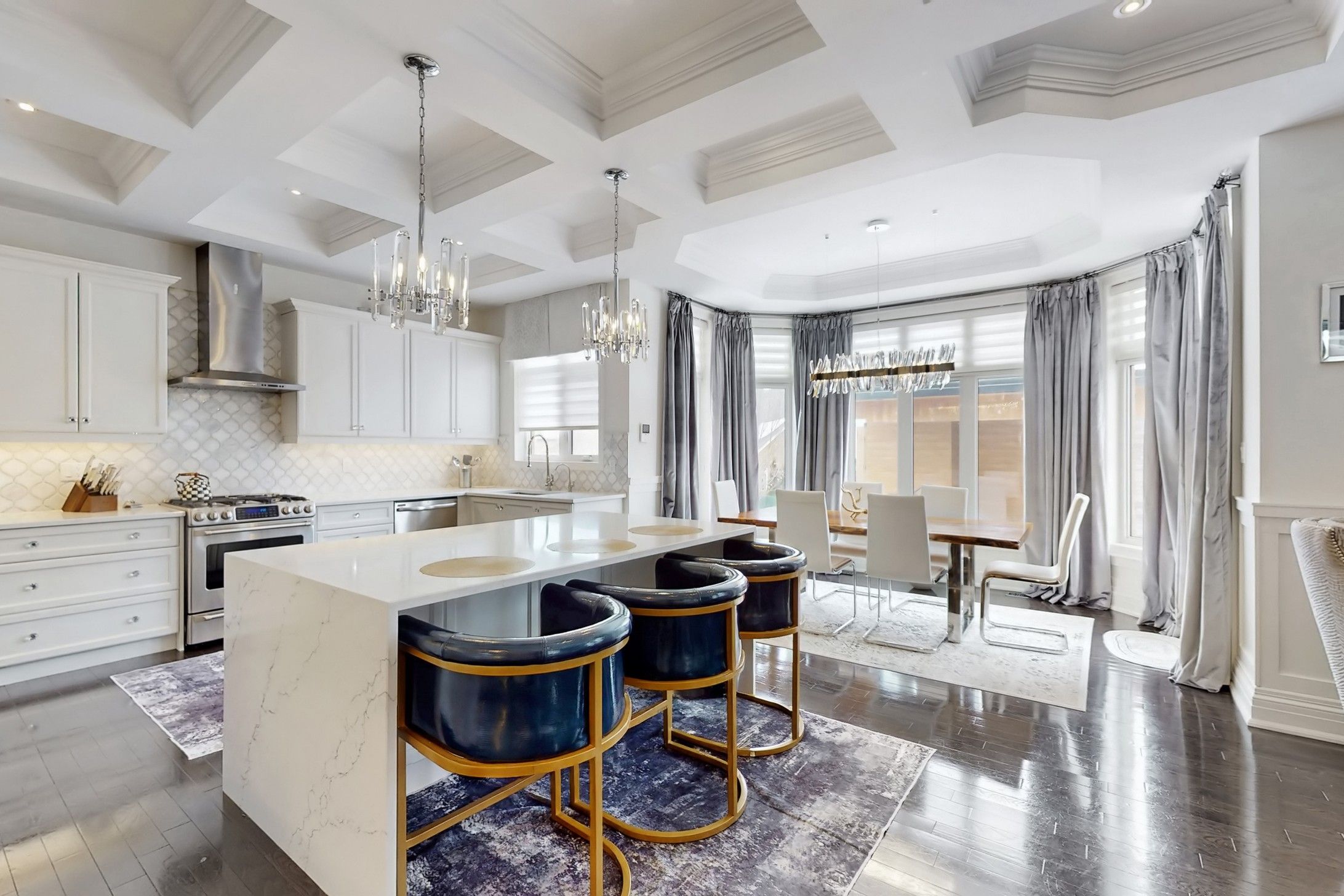 • Chef-inspired kitchen with large island, quartz counters, and butler's servery.