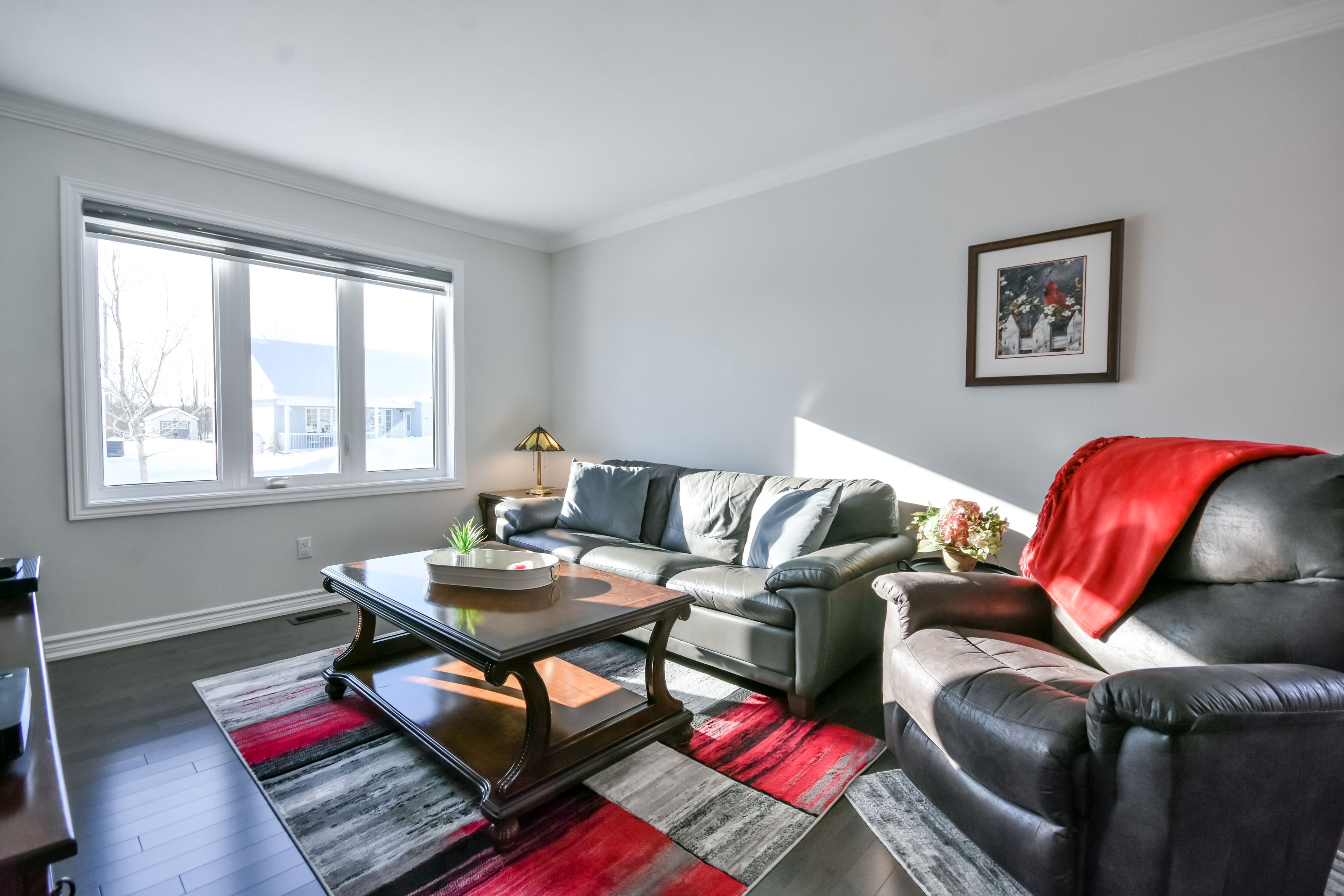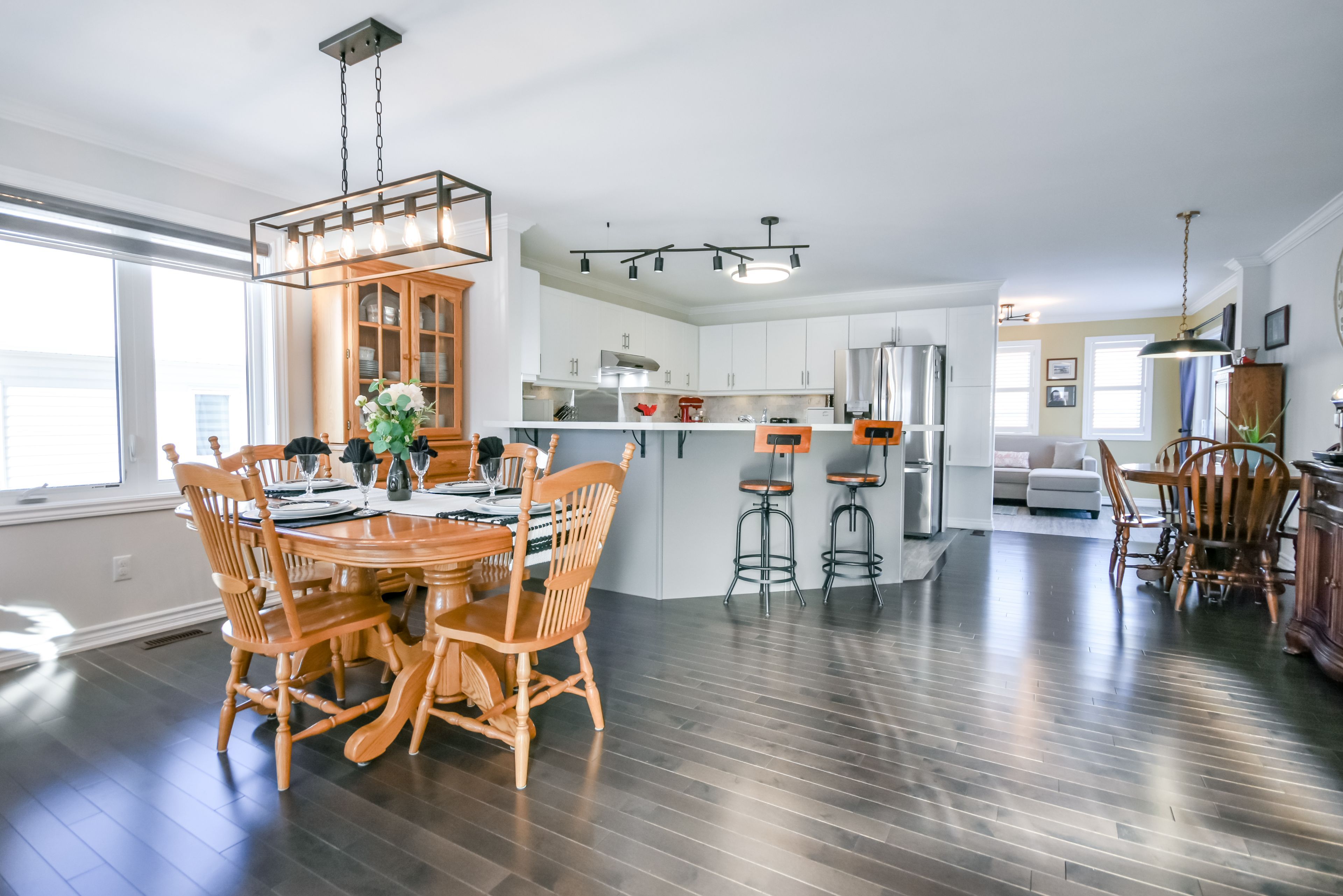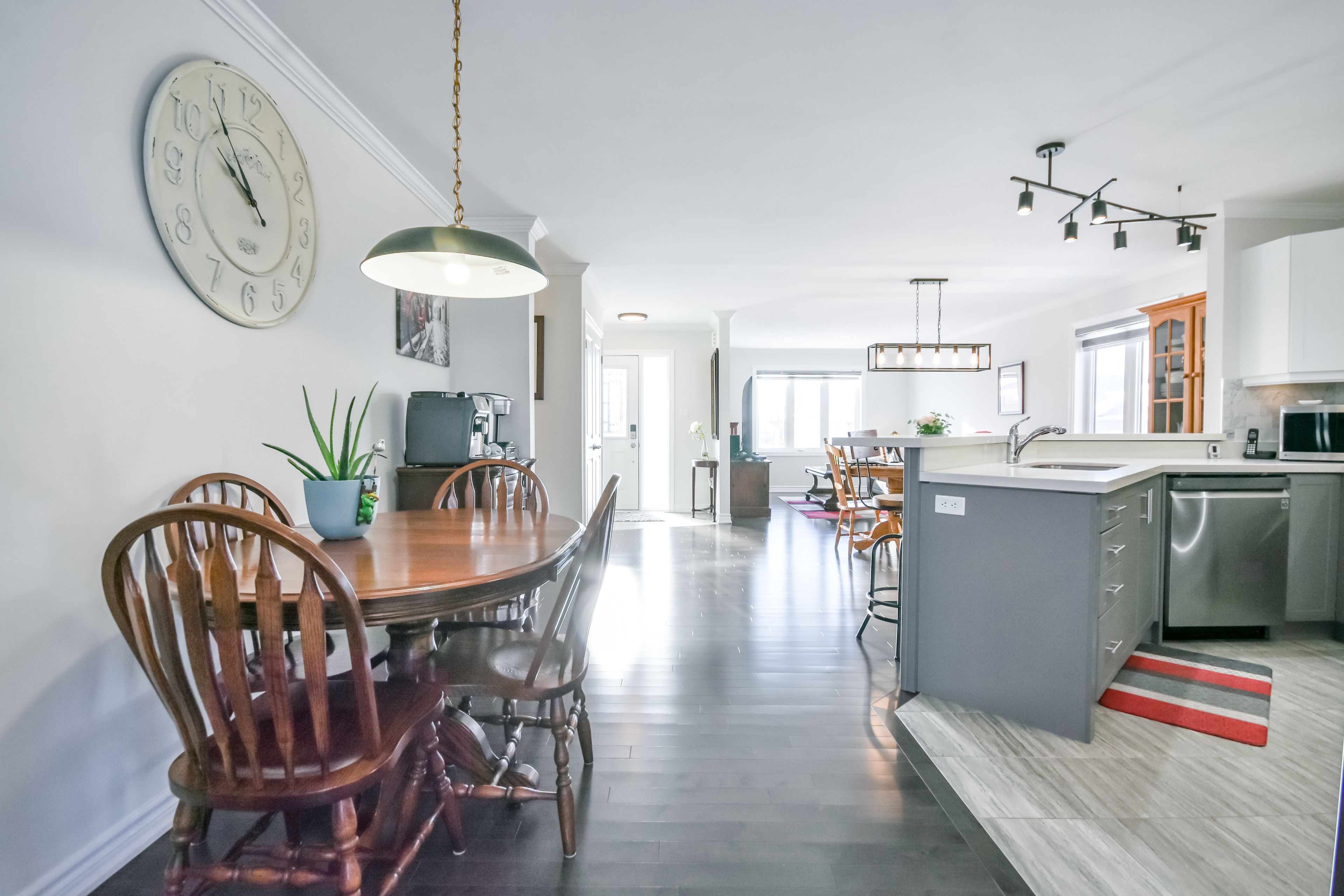 • Modern open concept layout with hardwood and ceramic flooring throughout.
