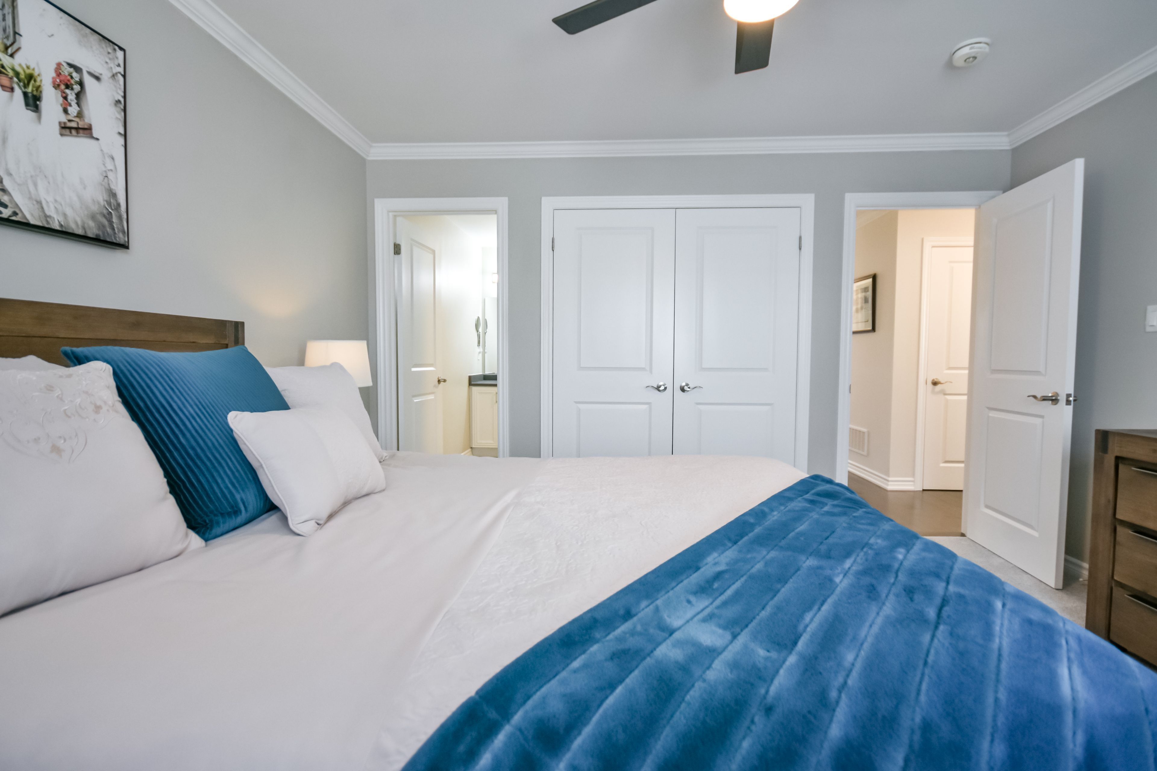 • Chef-inspired kitchen with quartz countertops and gas stove for convenient cooking.