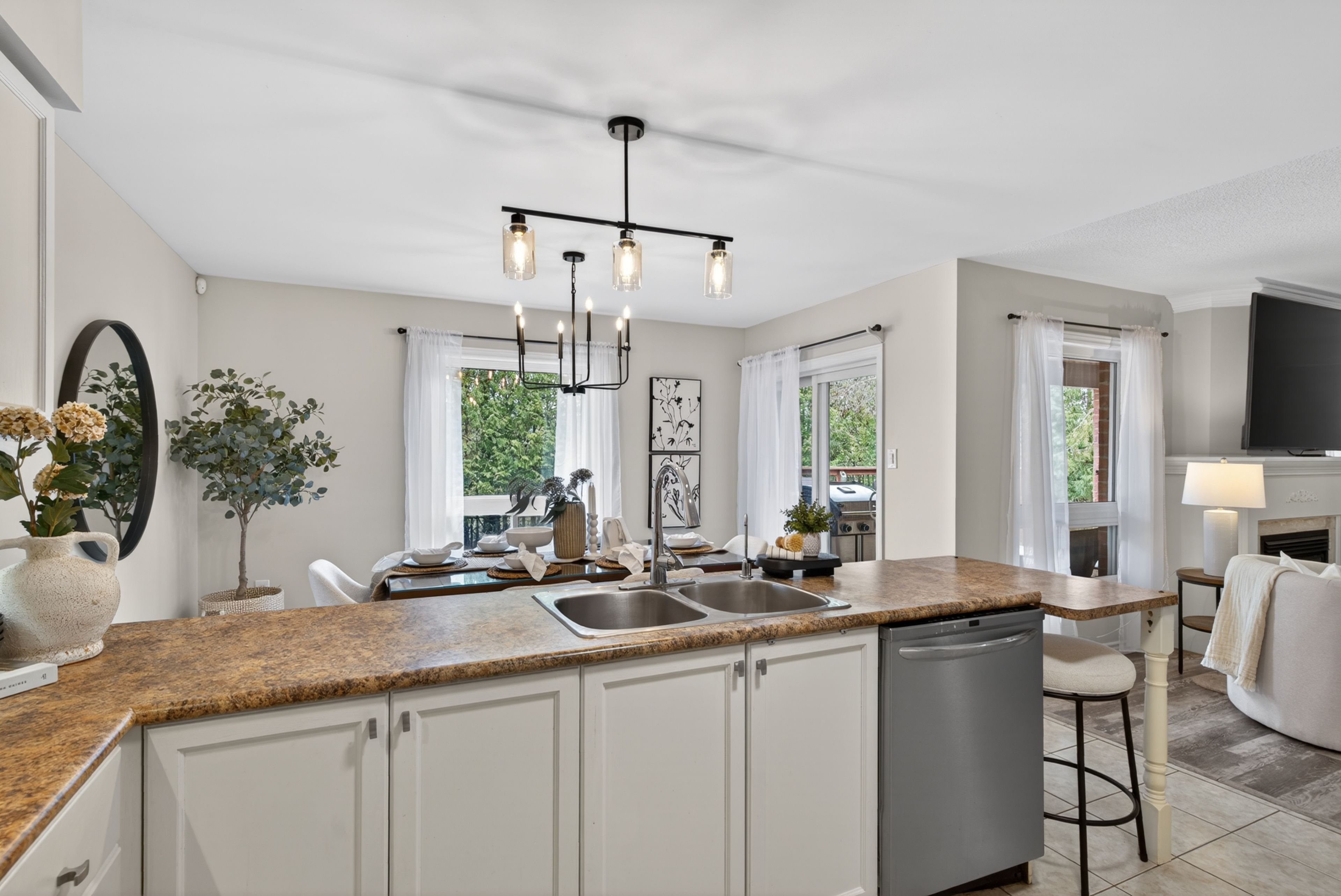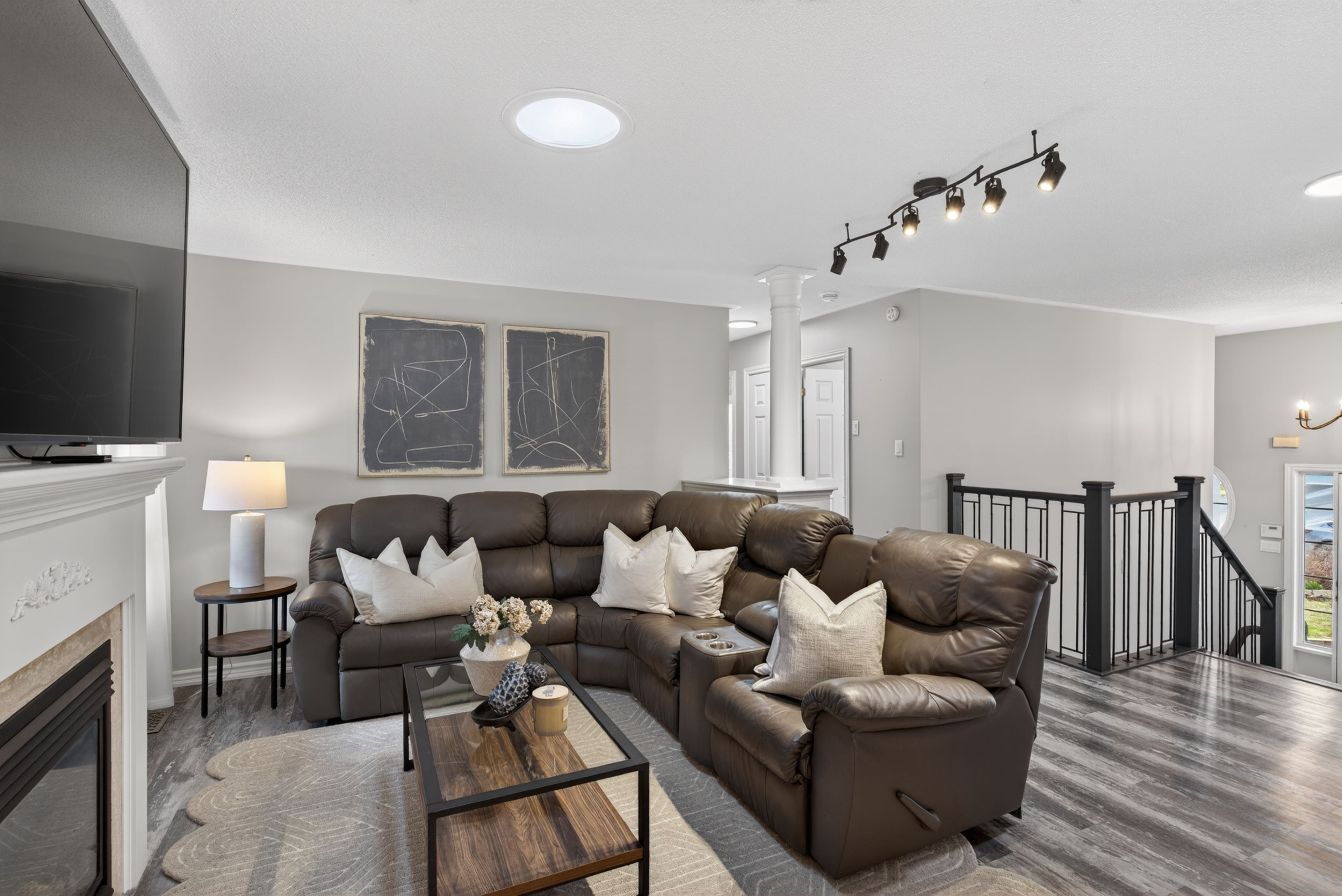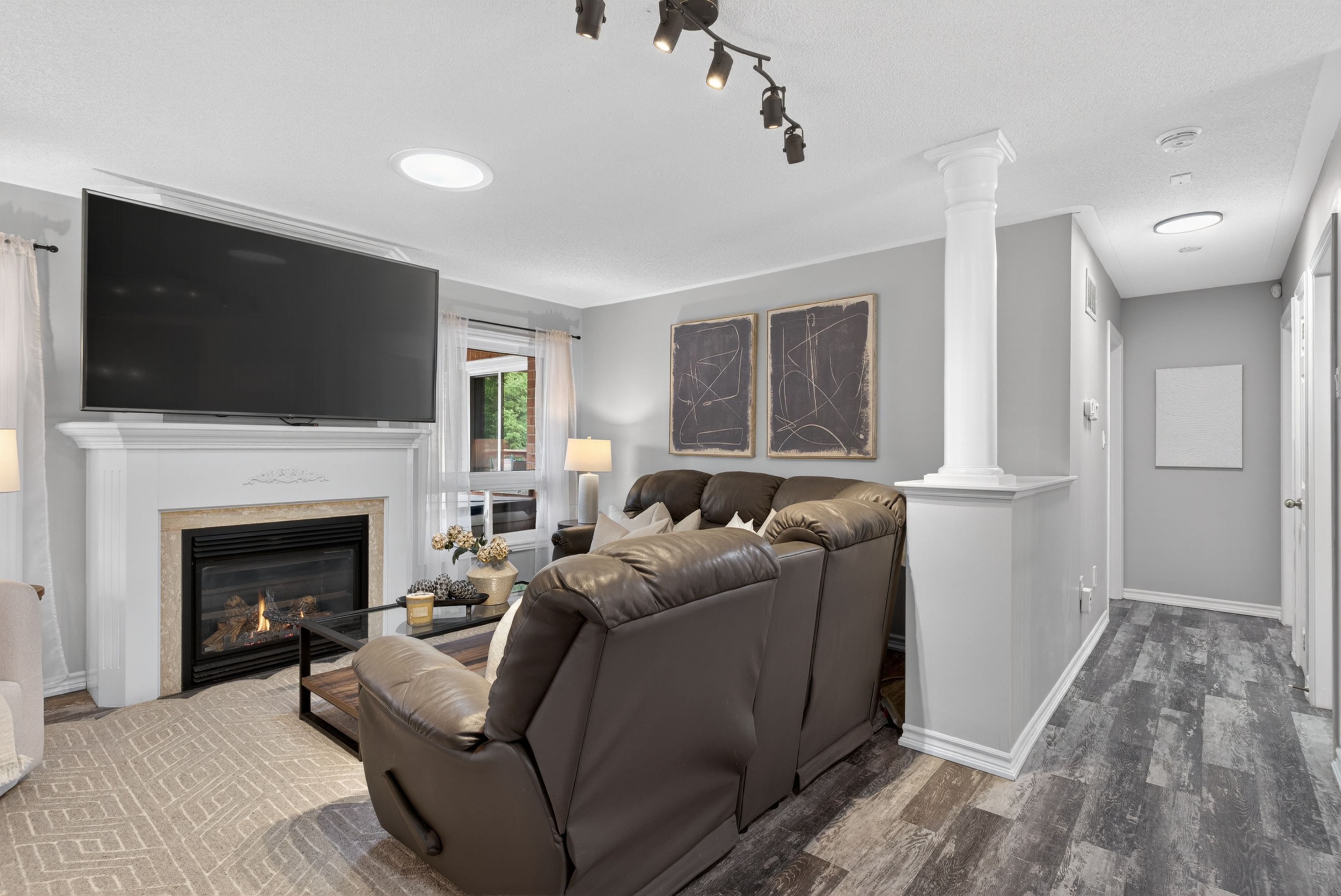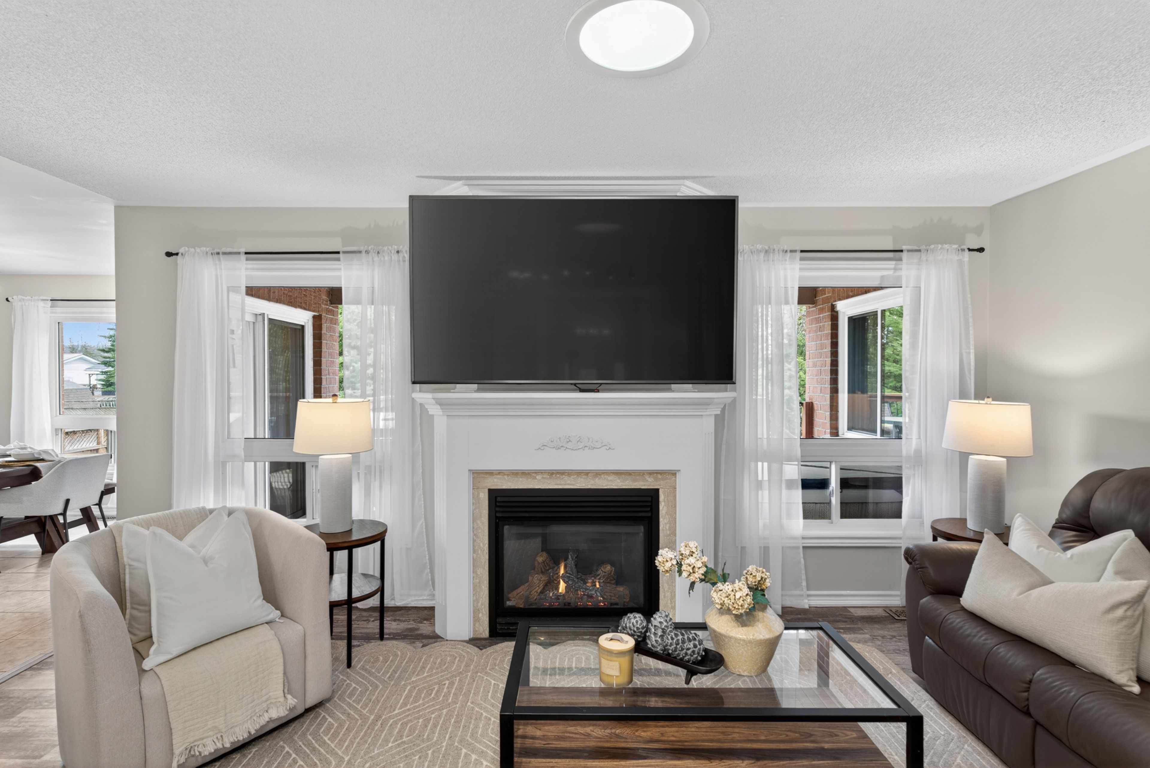 • Bright living room with a cozy gas fireplace for family gatherings.