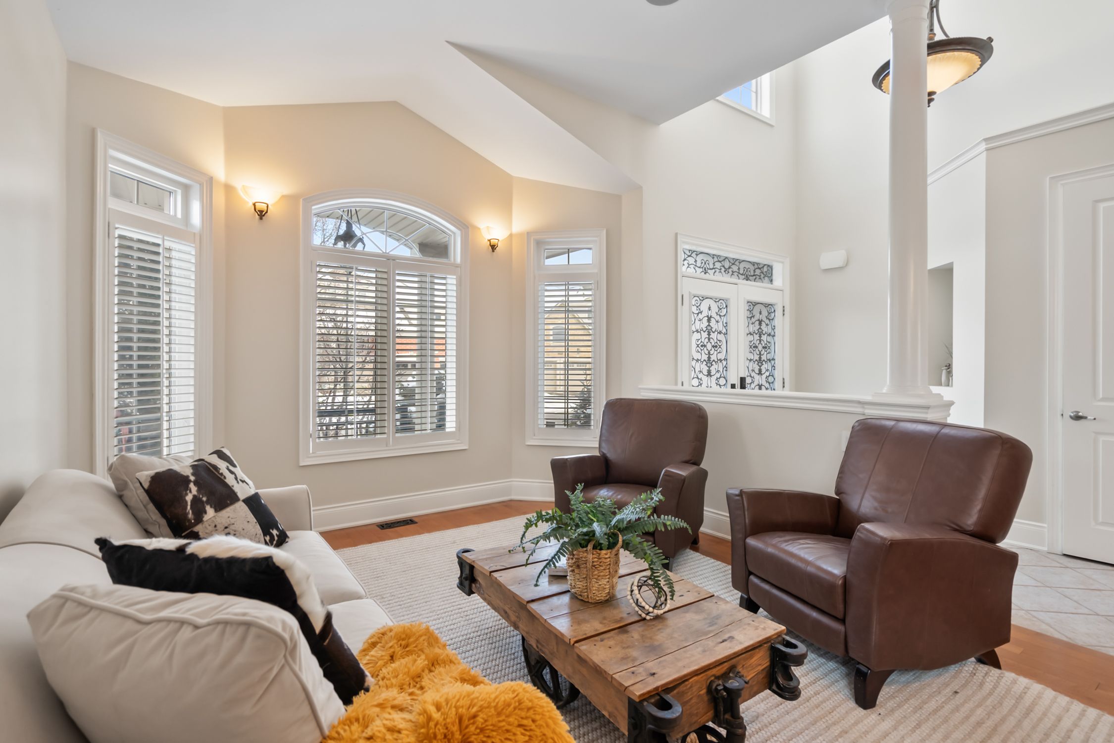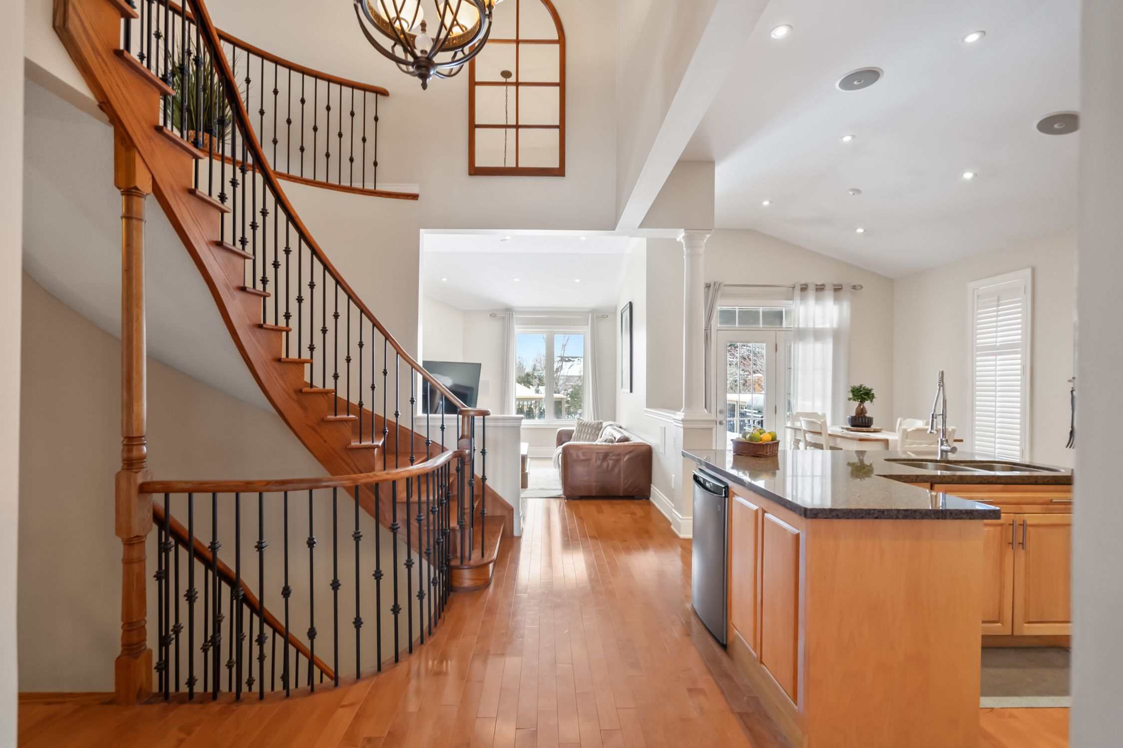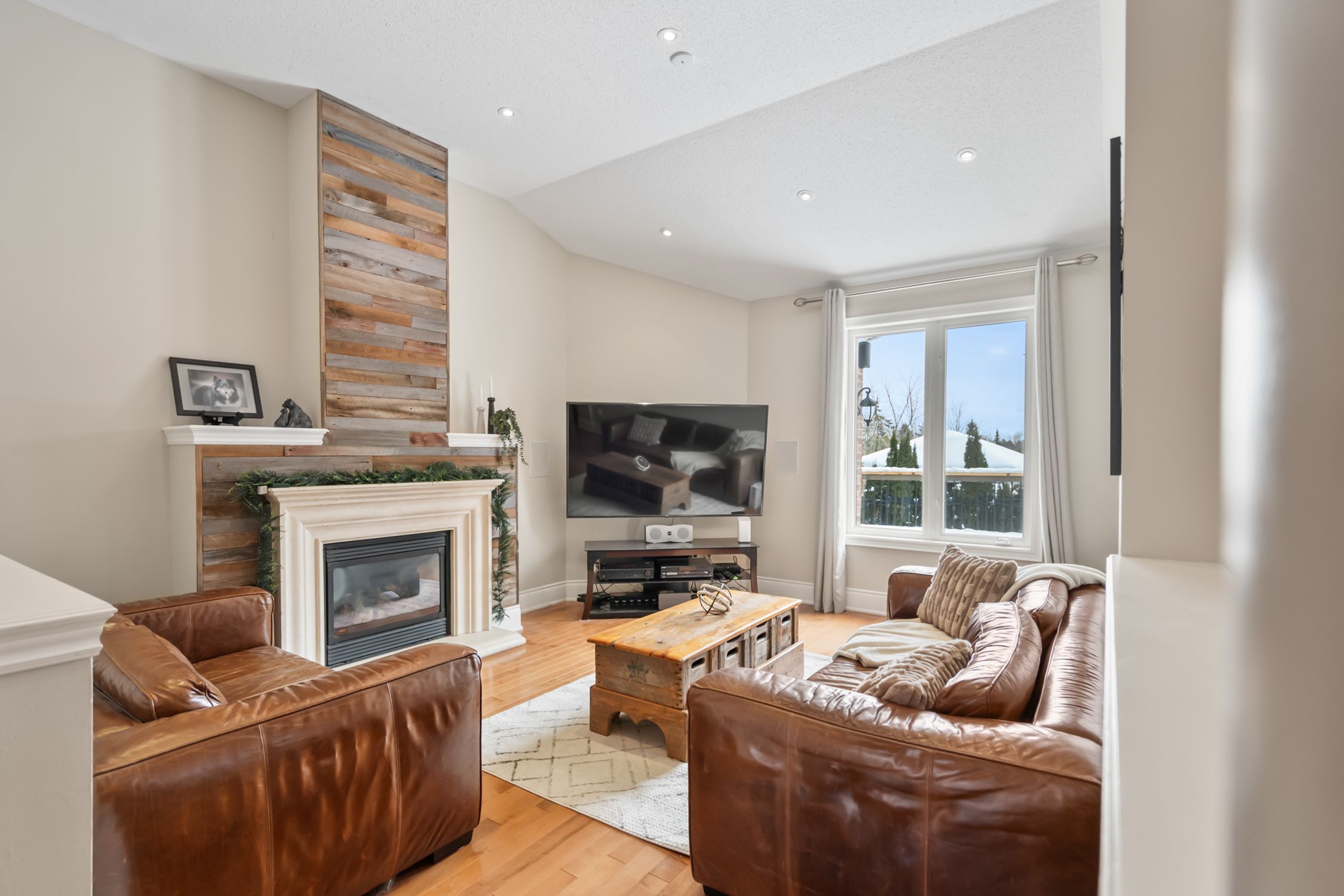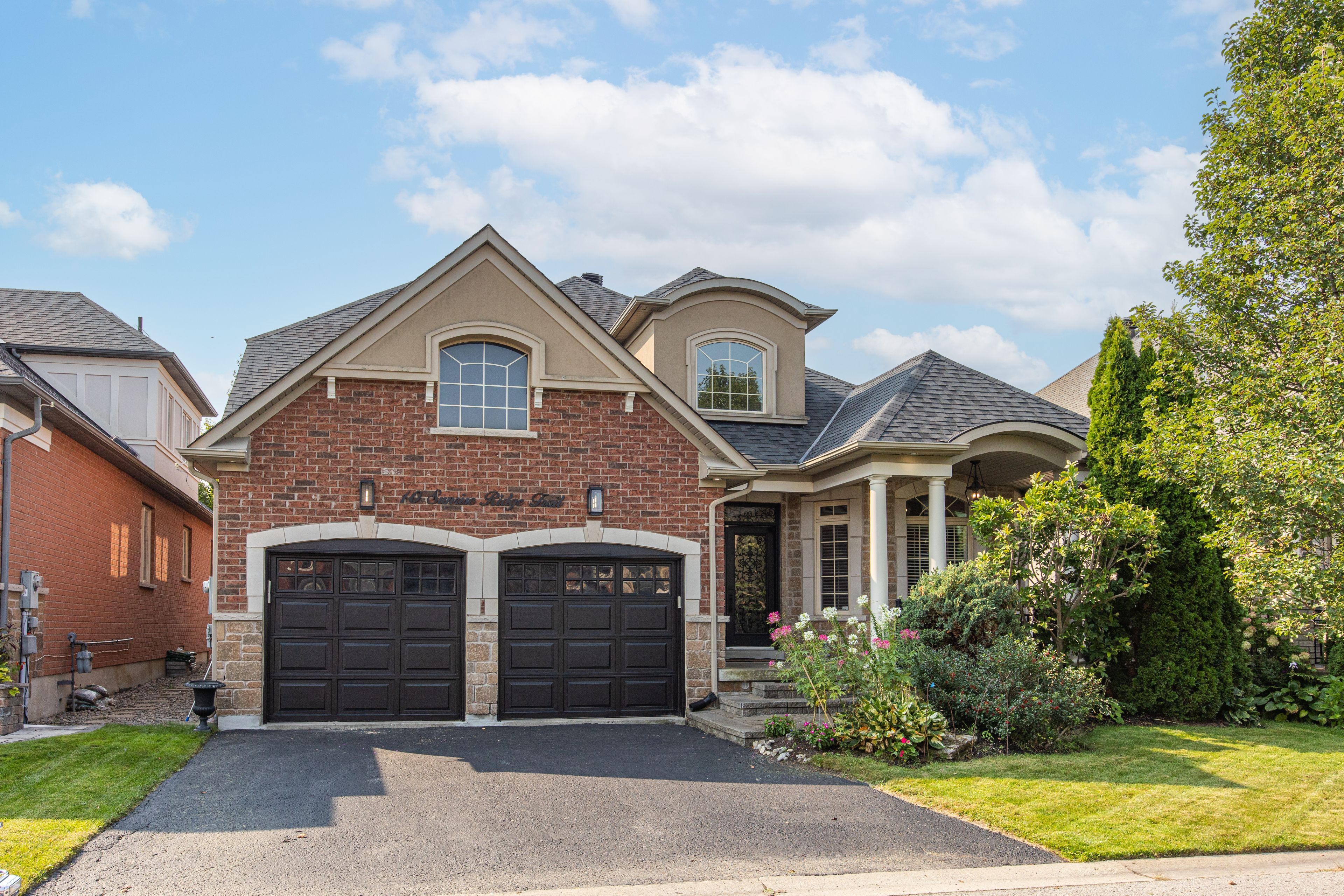 This 2,827 sq. Ft (per mpac) 3-bedroom bungaloft in the gated emerald hills golf course course community offers low-maintenance living with condo fees of $982. 43/month, covering water, sewage, community snow removal and access to the clubhouse, pool, hot tub, sauna, tennis courts, exercise room, meeting room, party room with kitchen, and outdoor children's playground and more! The exterior features an appealing, landscaped front entry with decorative double glass doors, a transom window, and a brick-and-stone facade with stucco accents. It also includes an irrigation system, powder-coated steel fully fenced yard, a large raised deck, and a double car garage. Inside, the main floor boasts a spacious foyer and 11' ceilings. The formal living room features a bayed window wall, flooding the space with natural light. Hardwood floors, california-style shutters, and extended height interior doors enhance the main living areas. The dining room enjoys a large window, while the kitchen offers maple cabinetry, granite countertops, stainless steel appliances, including a new fridge (2024). The breakfast area has a garden door leading to the deck, and the family room includes a gas fireplace, pot lights, and a large window overlooking the yard. The spacious principal bedroom has hardwood flooring, a tray ceiling, large windows, two walk-in closets with custom organizers, a seating area, and access to the deck. The ensuite includes a soaker tub, shower, and heated floors. Additionally, there is a second bedroom, a 4-piece bathroom, and a main floor laundry room with direct garage access. Upstairs, a grand curved staircase leads to the loft bonus room overlooking the main floor. The third bedroom features a large window and closet, and a 4-piece bath completes the upper level. Other: irrigation system (water incl in fees), fridge, dryer and ac 2024, roof approx 5 years, family room and principal bedroom windows replaced, furnace 2018.