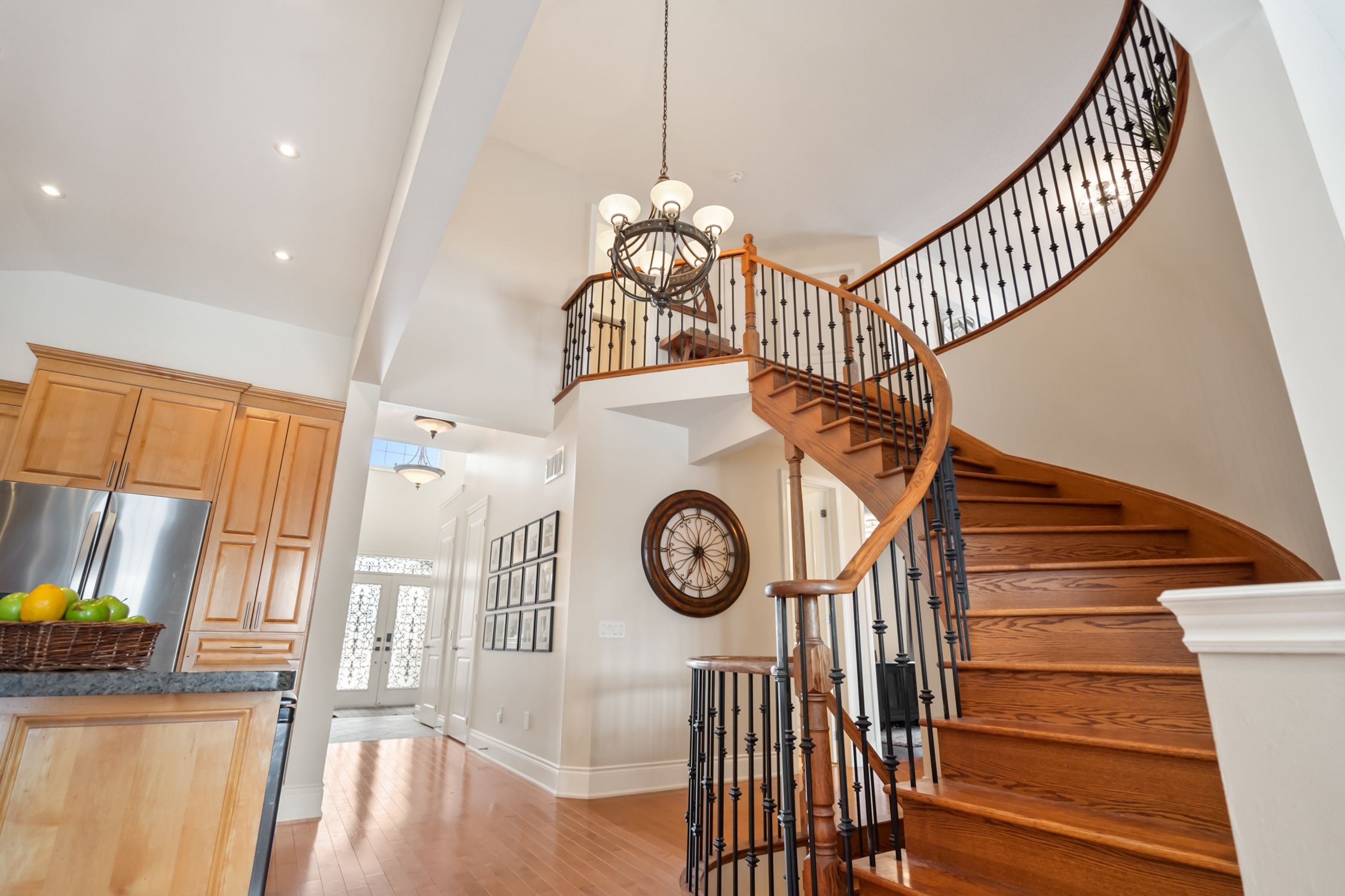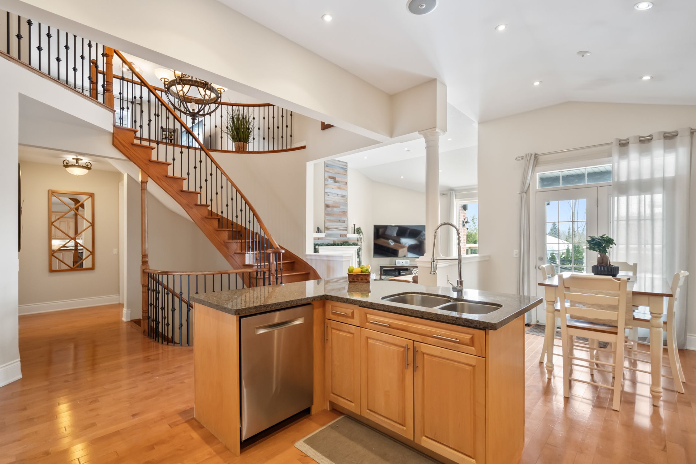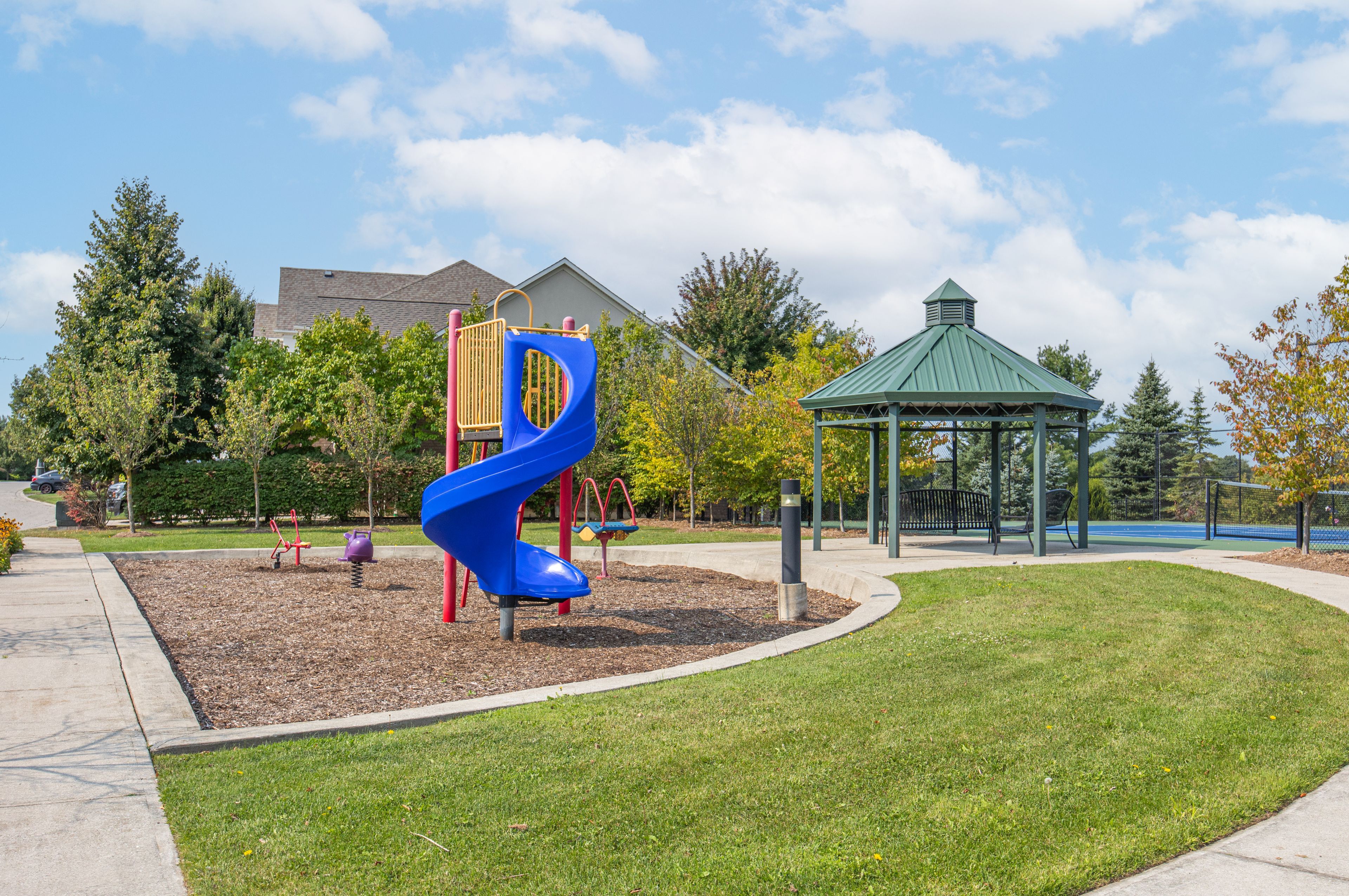 This 2,827 sq. Ft (per mpac) 3-bedroom bungaloft in the gated emerald hills golf course course community offers low-maintenance living with condo fees of $982. 43/month, covering water, sewage, community snow removal and access to the clubhouse, pool, hot tub, sauna, tennis courts, exercise room, meeting room, party room with kitchen, and outdoor children's playground and more! The exterior features an appealing, landscaped front entry with decorative double glass doors, a transom window, and a brick-and-stone facade with stucco accents. It also includes an irrigation system, powder-coated steel fully fenced yard, a large raised deck, and a double car garage. Inside, the main floor boasts a spacious foyer and 11' ceilings. The formal living room features a bayed window wall, flooding the space with natural light. Hardwood floors, california-style shutters, and extended height interior doors enhance the main living areas. The dining room enjoys a large window, while the kitchen offers maple cabinetry, granite countertops, stainless steel appliances, including a new fridge (2024). The breakfast area has a garden door leading to the deck, and the family room includes a gas fireplace, pot lights, and a large window overlooking the yard. The spacious principal bedroom has hardwood flooring, a tray ceiling, large windows, two walk-in closets with custom organizers, a seating area, and access to the deck. The ensuite includes a soaker tub, shower, and heated floors. Additionally, there is a second bedroom, a 4-piece bathroom, and a main floor laundry room with direct garage access. Upstairs, a grand curved staircase leads to the loft bonus room overlooking the main floor. The third bedroom features a large window and closet, and a 4-piece bath completes the upper level. Other: irrigation system (water incl in fees), fridge, dryer and ac 2024, roof approx 5 years, family room and principal bedroom windows replaced, furnace 2018.