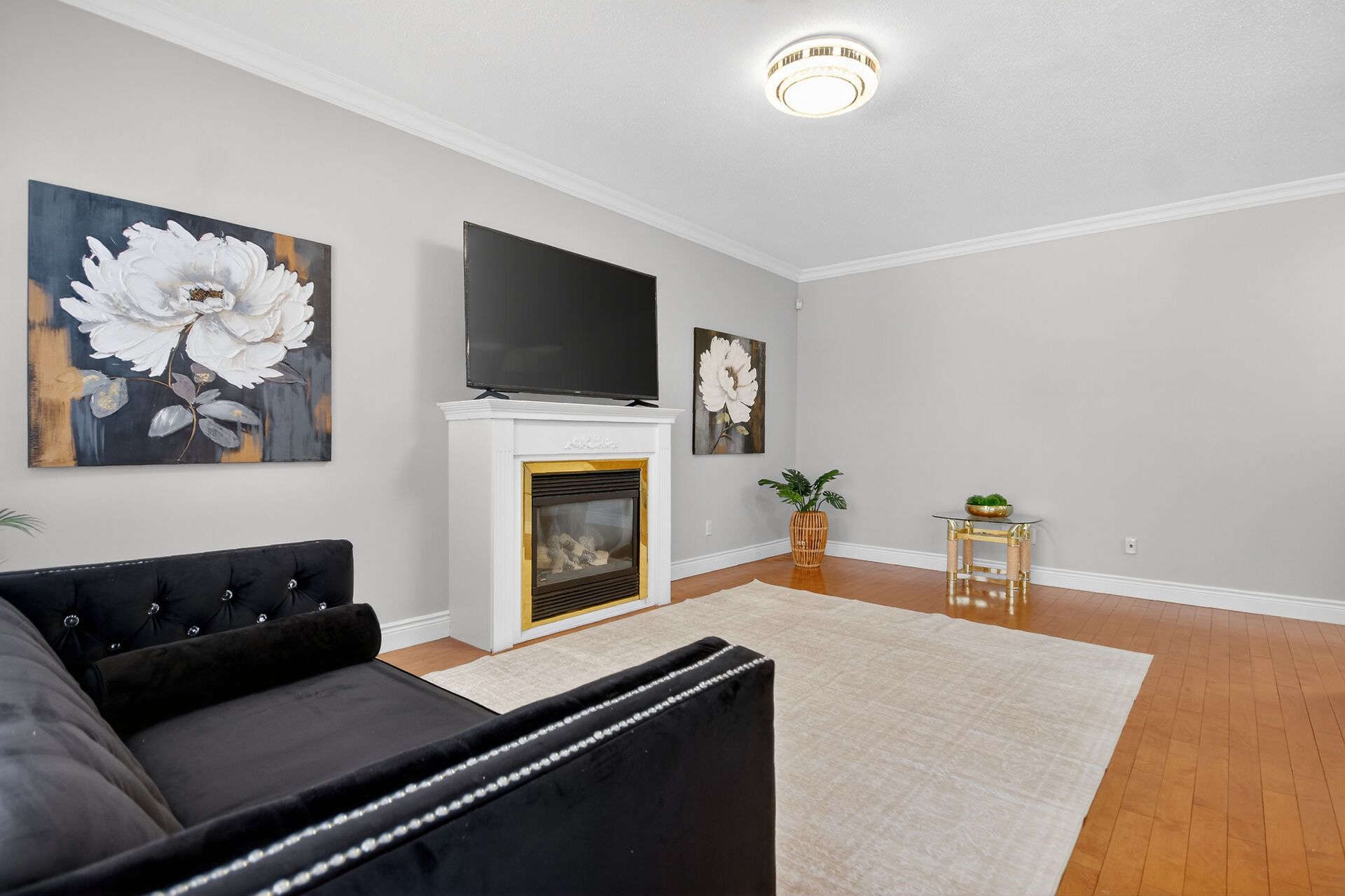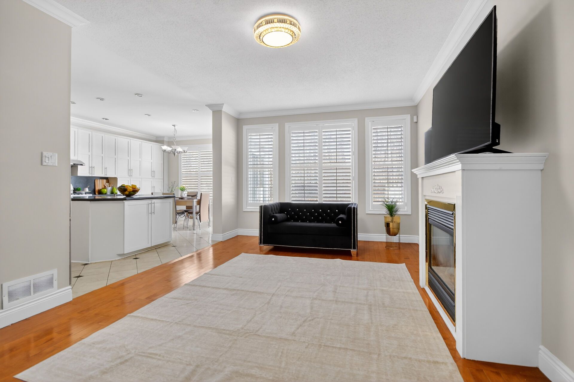 • Cozy family room features a fireplace for warmth and relaxation.