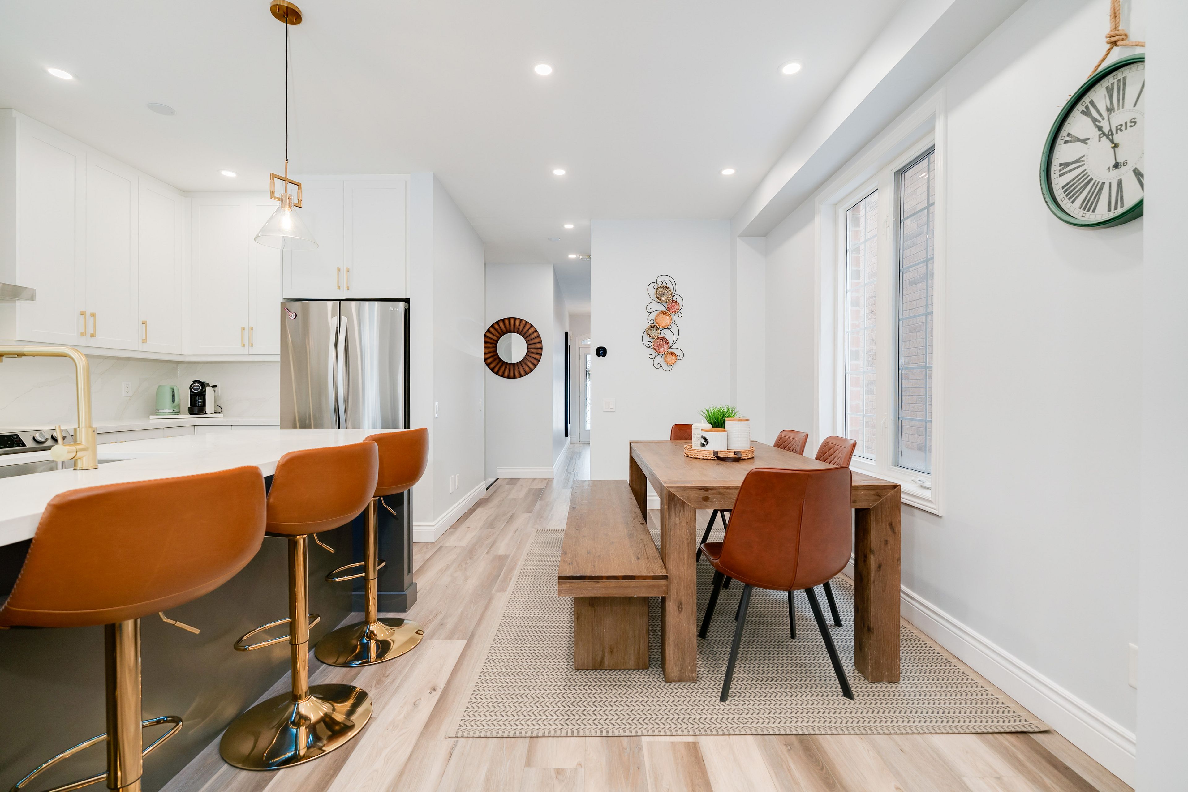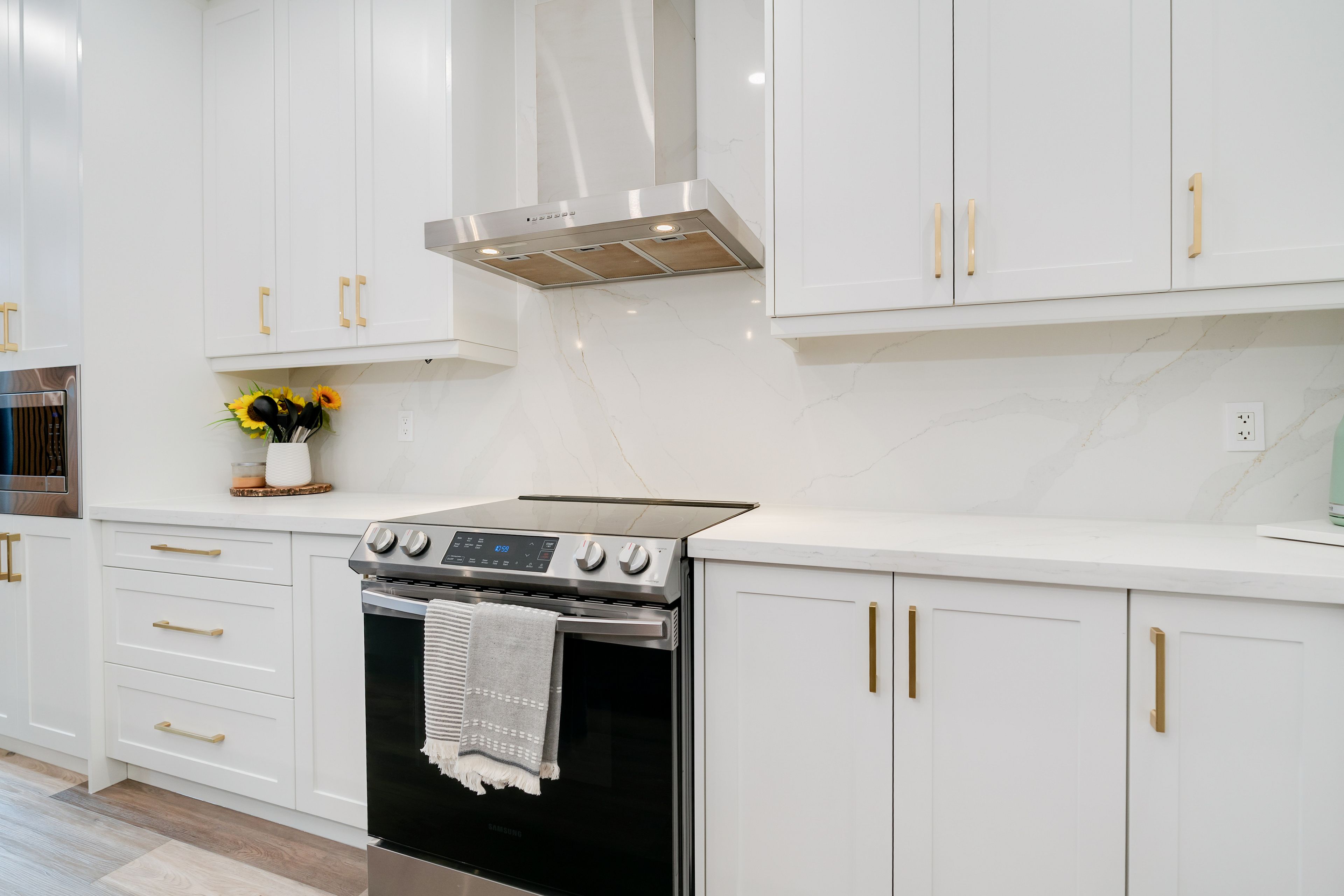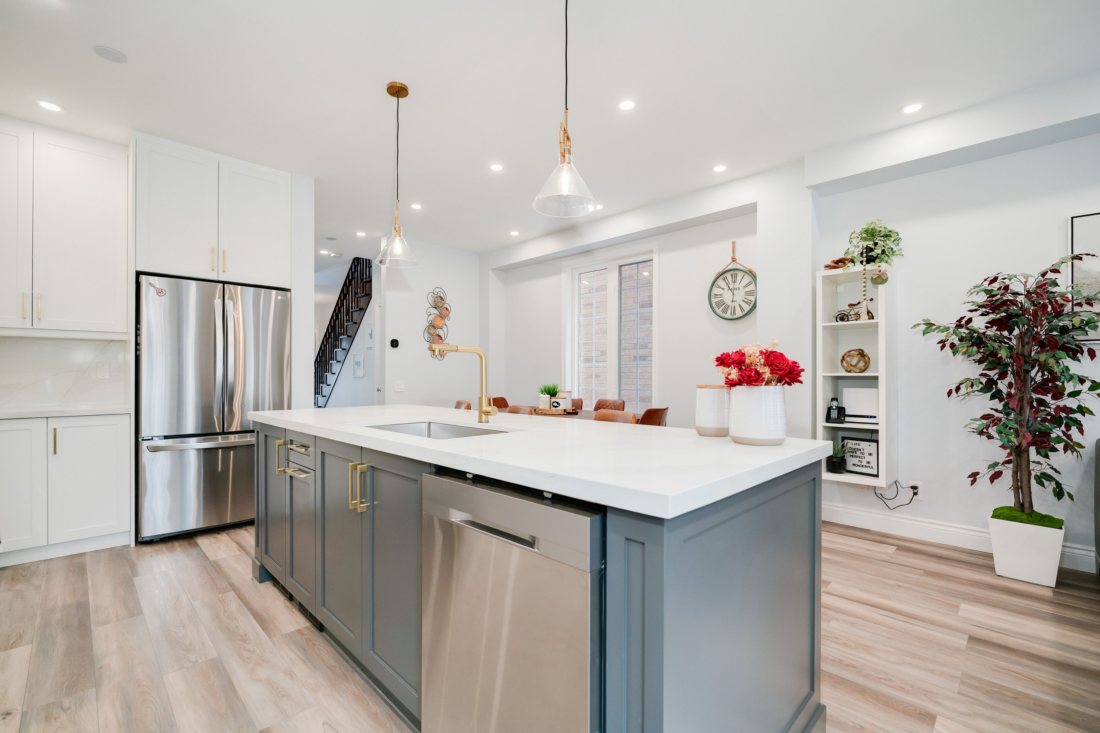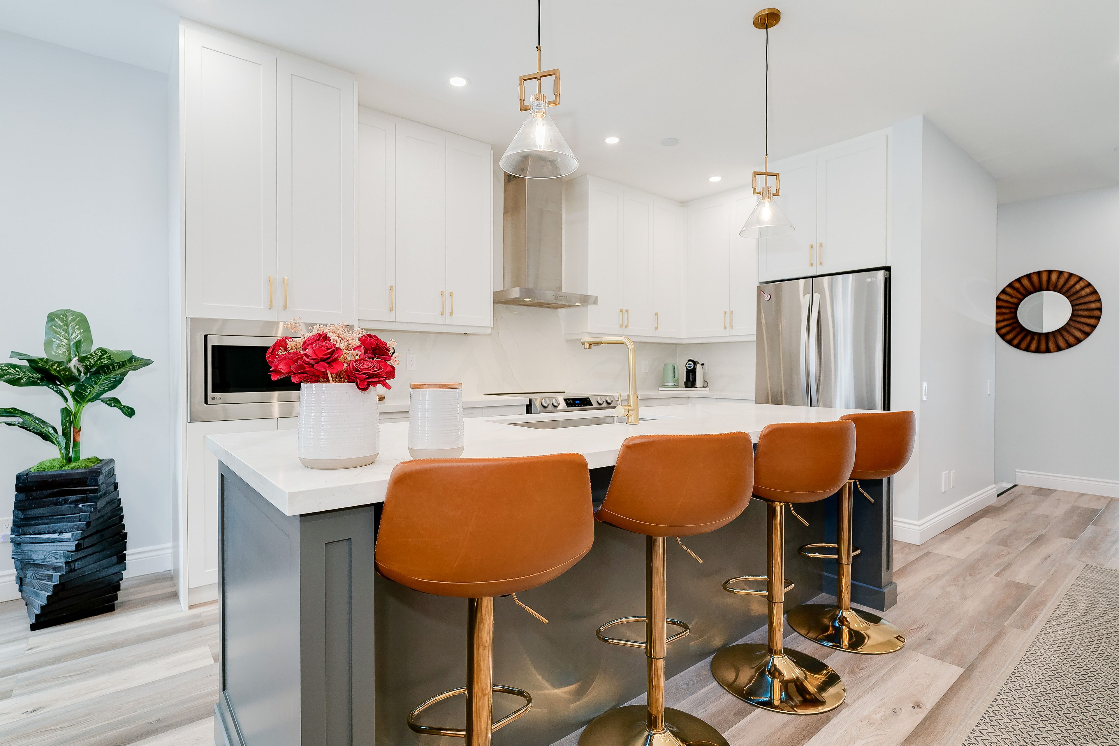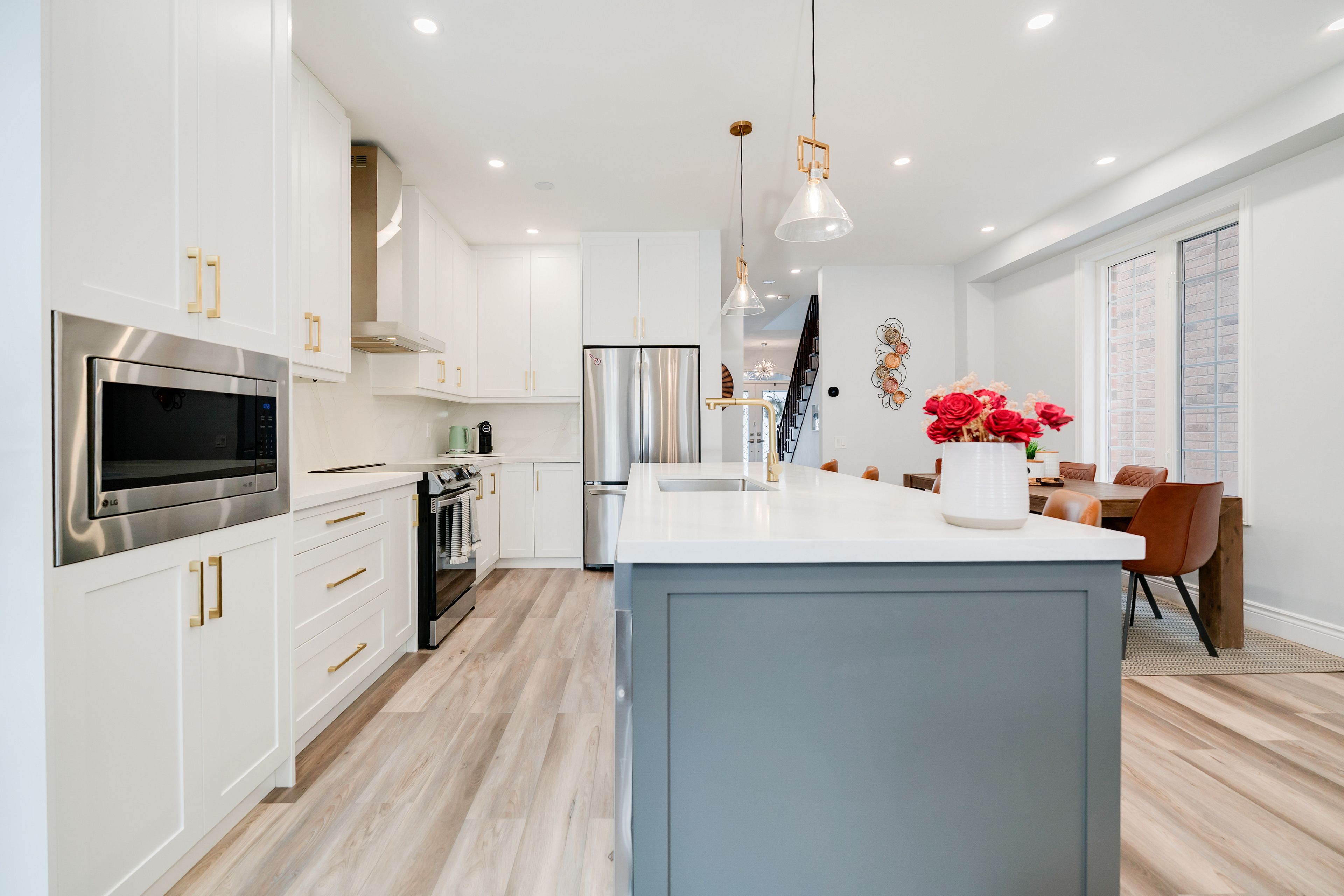 • Stylish new kitchen featuring quartz countertops and a large centre island.