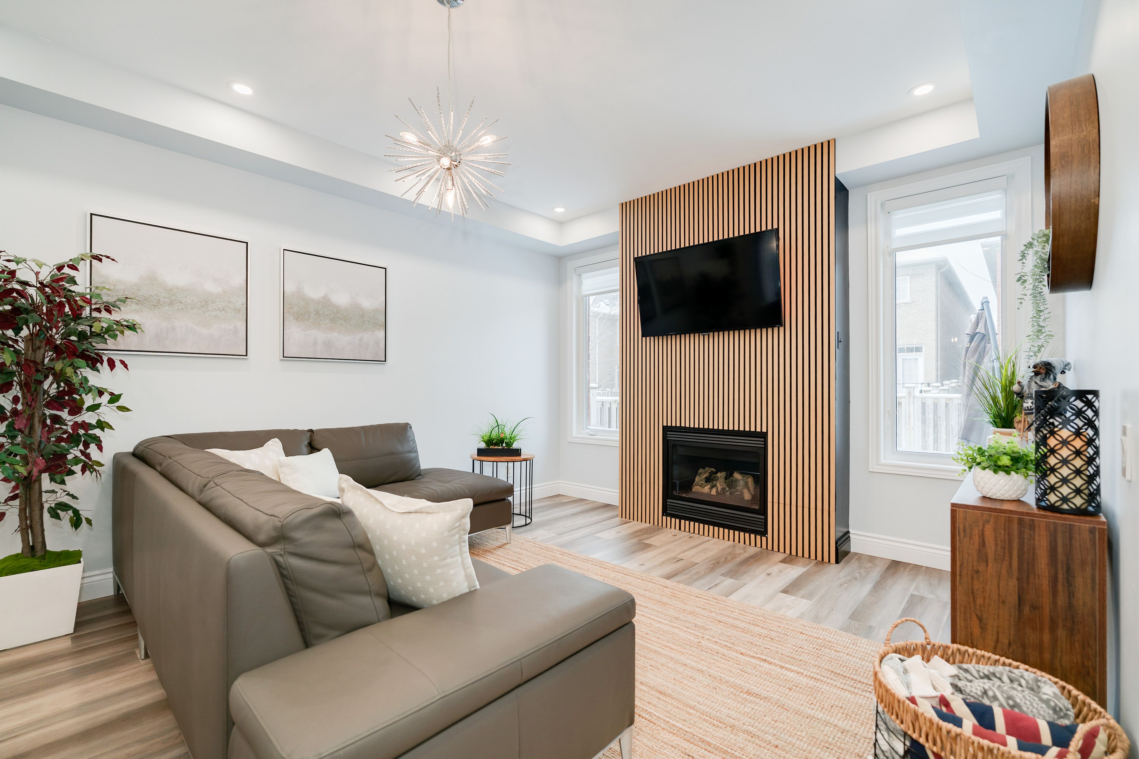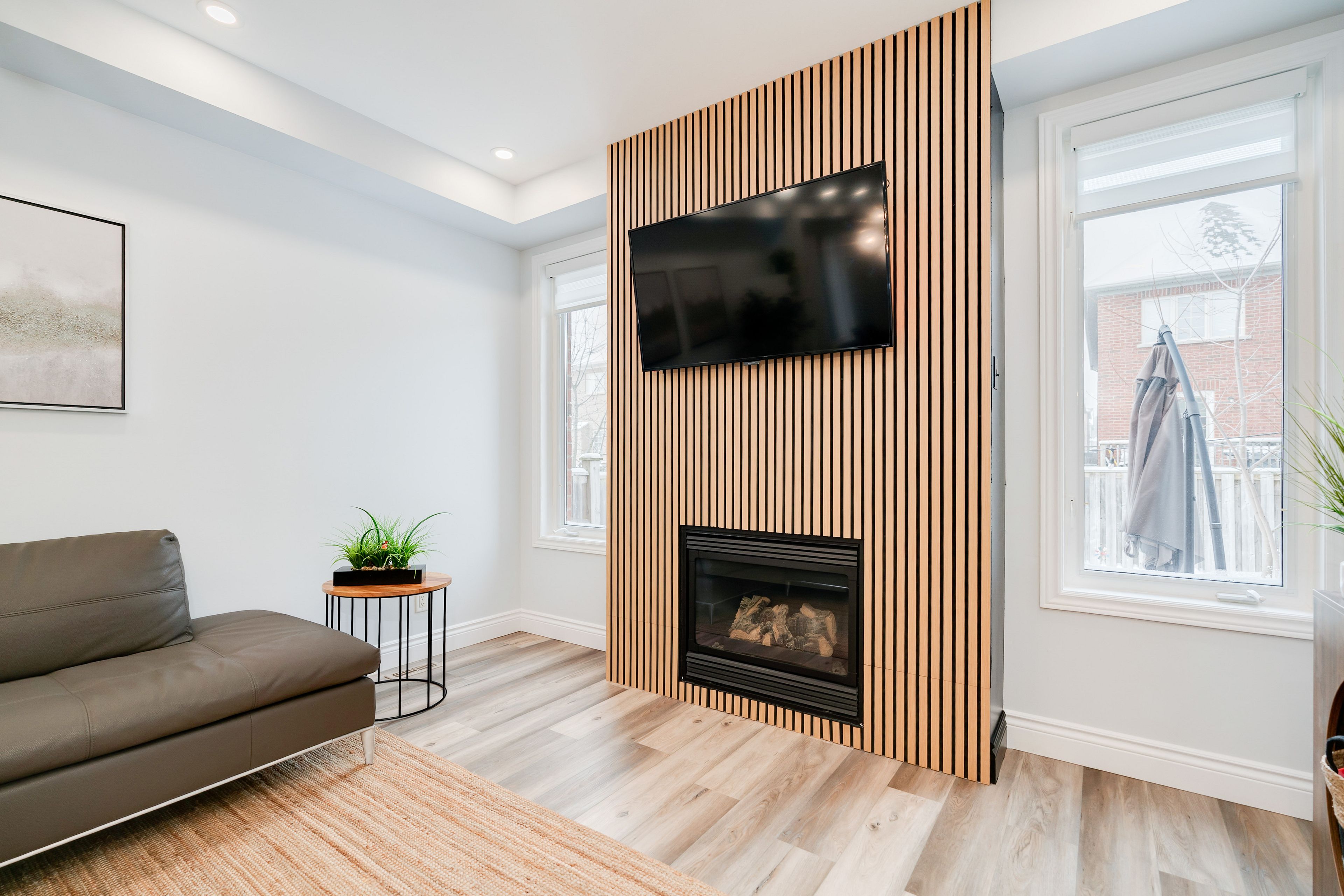 • Open-concept living and dining area with a gas fireplace.