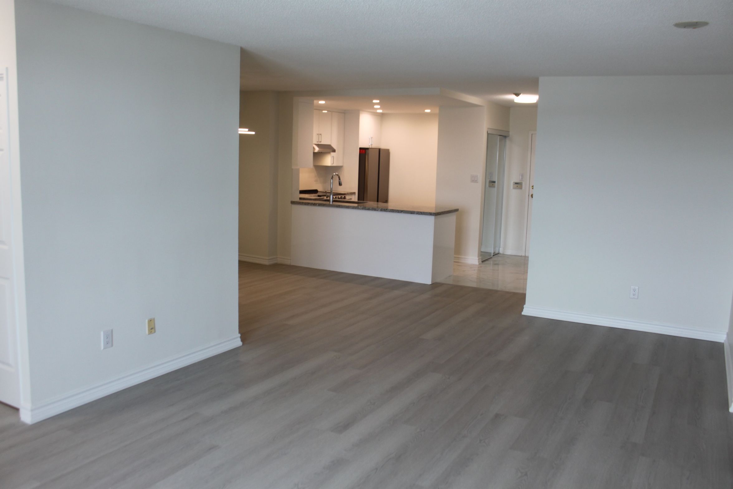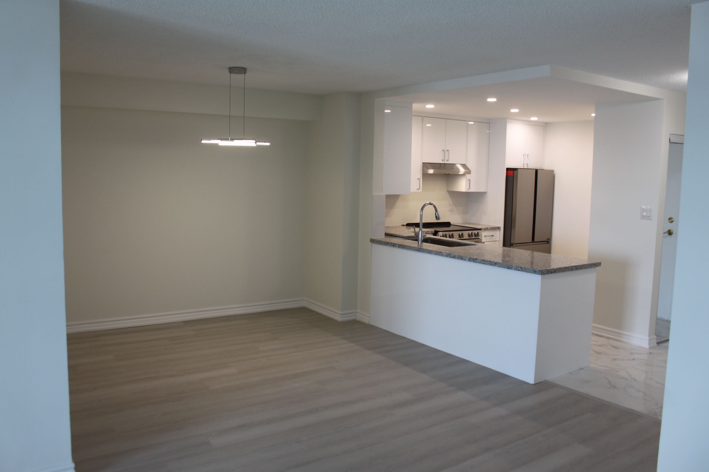 All inclusive in rent: heat, hydro, water, cable tv and internet, parking, and security/concierge, fully renovated luxury tridel condominium condo featuring a spacious 2-bedroom + 2 full bathroom suite in a prime location. This bright, open-concept unit includes a storage/pantry room, ensuite laundry, and a private balcony with two walkouts. Extensively renovated throughout with vinyl flooring, ceramic tile in the kitchen and bathrooms, granite countertops and backsplash, all new fixtures and faucets, new toilets, and five brand-new appliances. Thoughtfully designed for modern living with premium finishes. Well-maintained luxury building offering resort-style amenities, including onsite management office, 24-hour concierge/security, indoor pool, sauna, fully equipped gym, recreation room, squash court, tennis/pickleball courts, and two guest suites. Exceptional location close to shopping malls, stores, library, hospital, public transit, and quick access to highway 401.