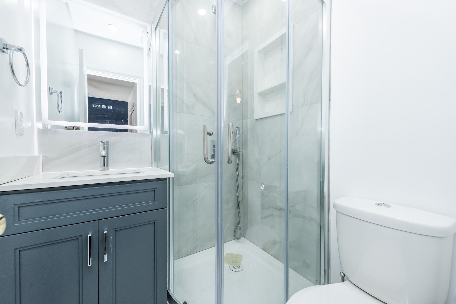 • New kitchen with quartz countertops and matching backsplash for style and functionality.