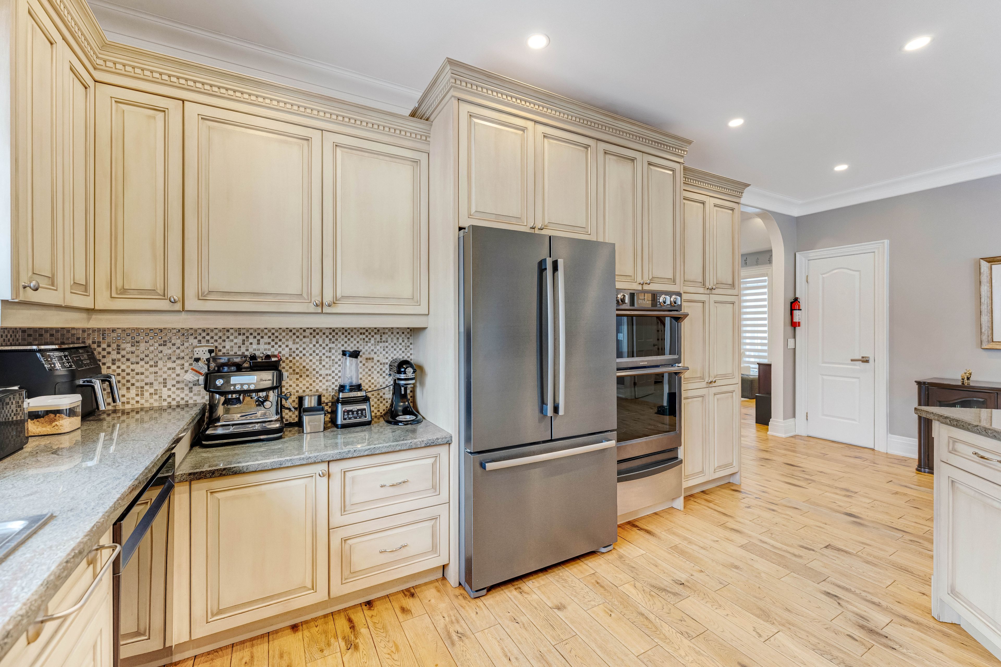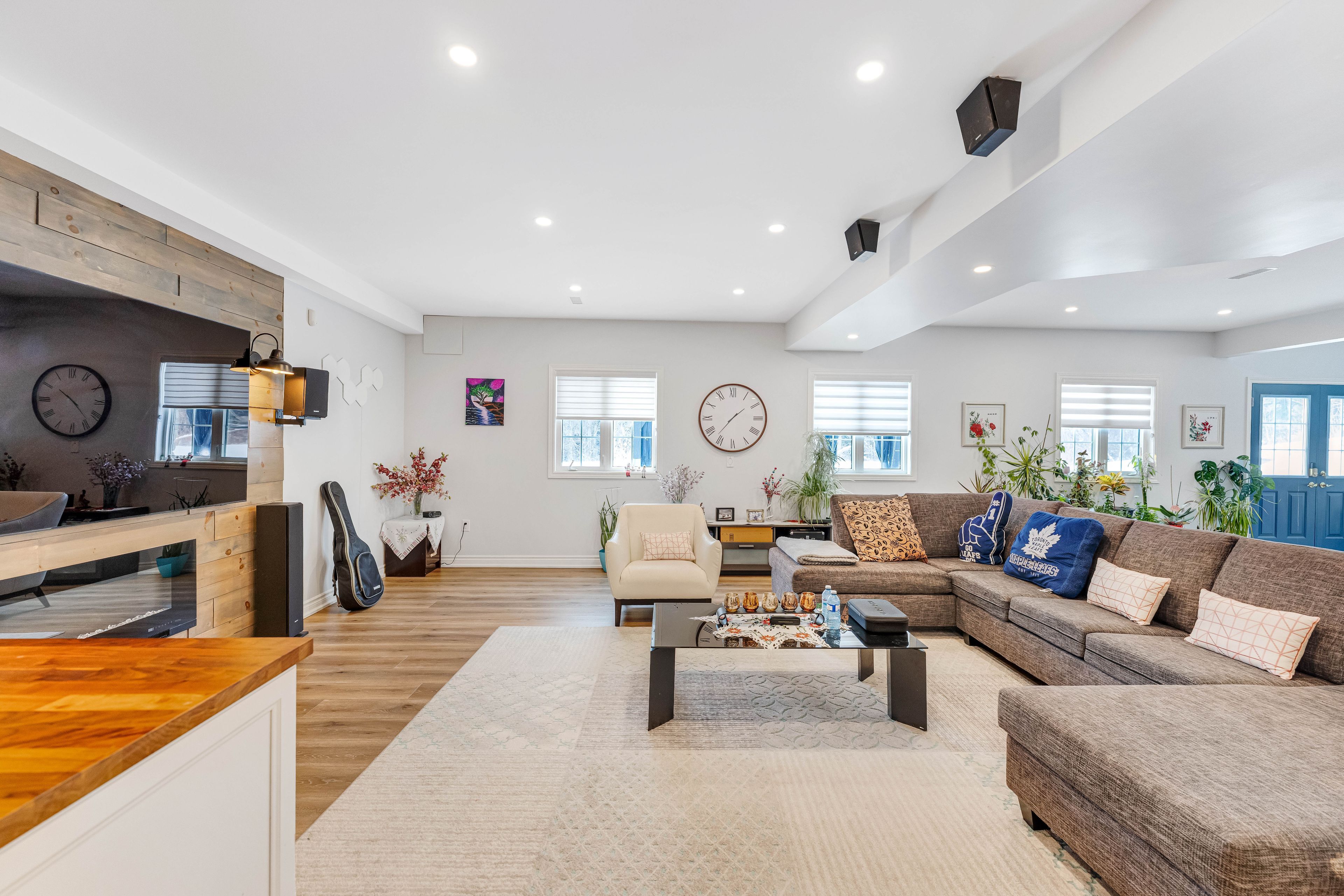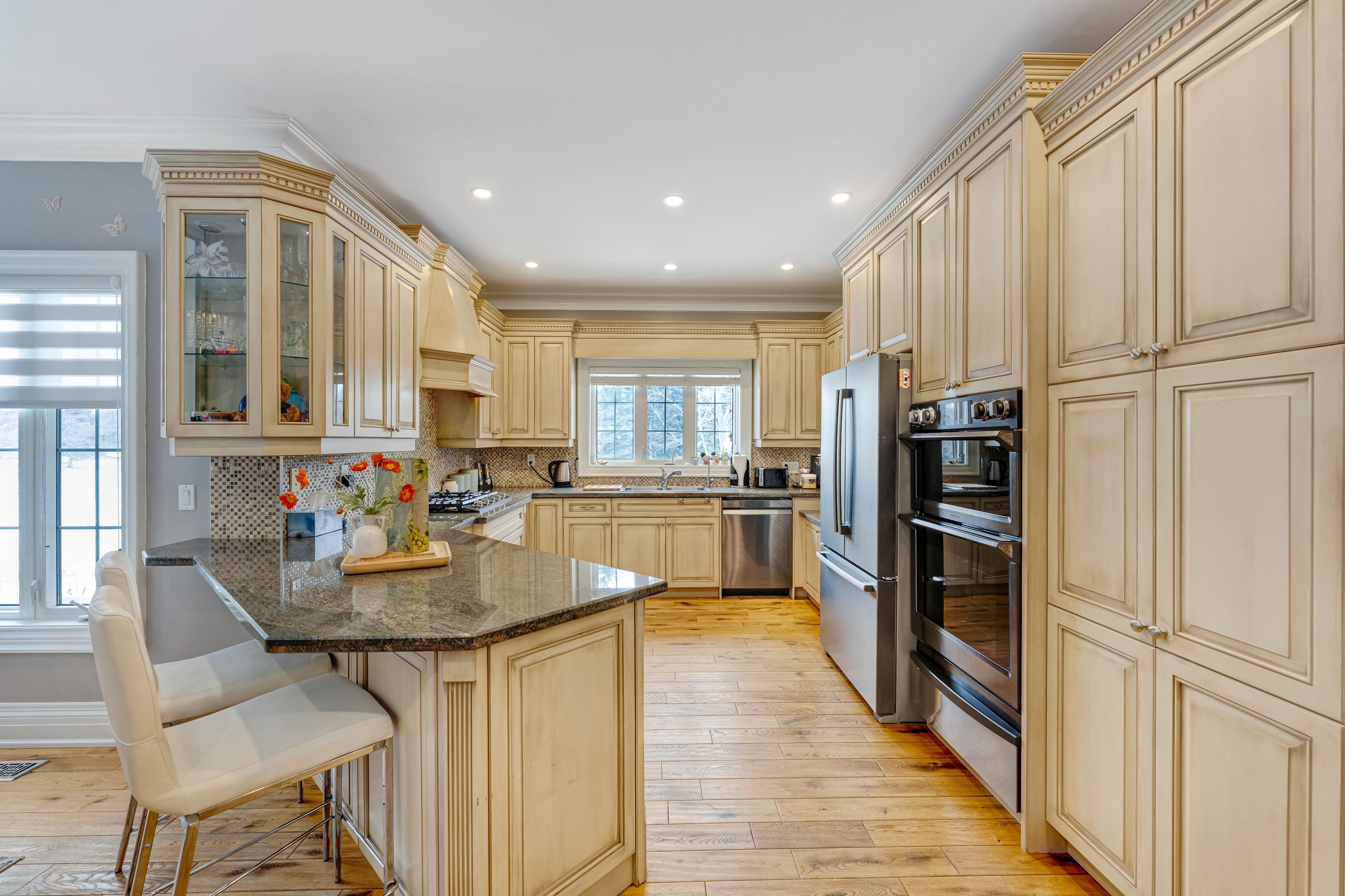 • Bright interior with 10-ft ceilings and a custom kitchen.