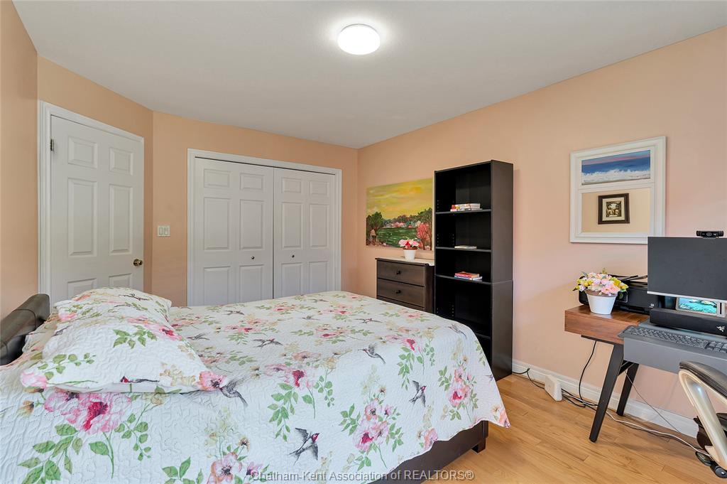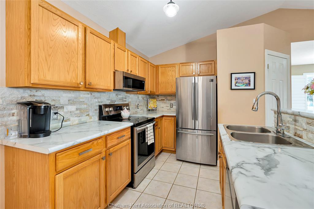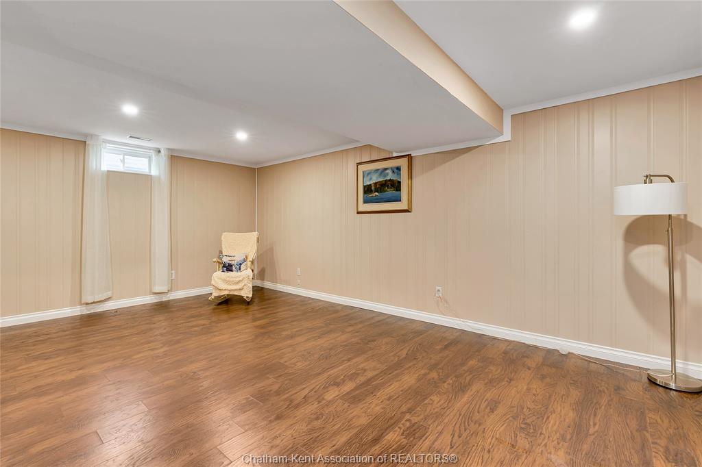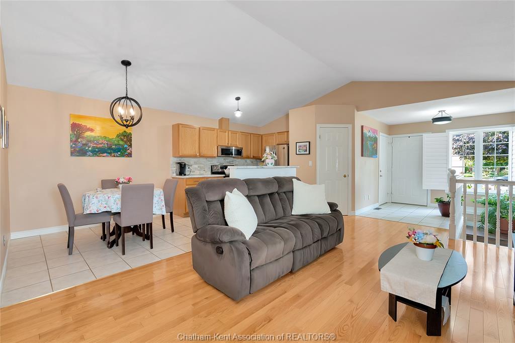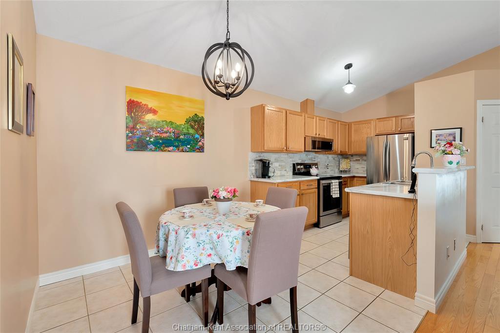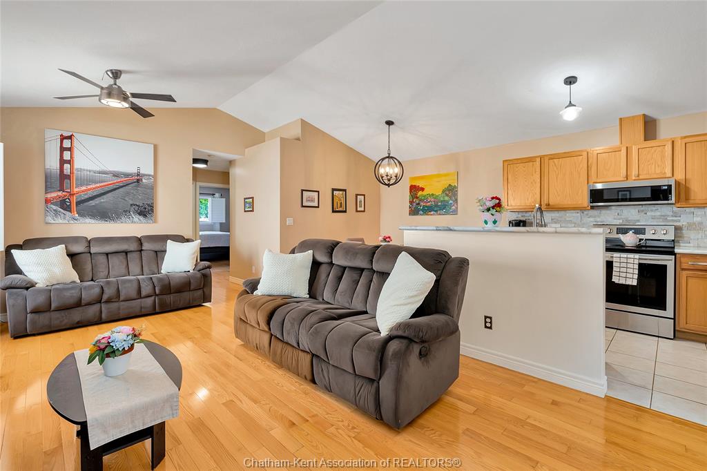 Effortless living in style home in chatham. Welcome to this beautifully maintained 3-bedroom, 2-bathroom bungalow-style row home offering the perfect blend of comfort, style, and convenience. With 2 spacious bedrooms on the main floor and a third bedroom in the finished lower level, there’s room for family, guests, or a private home office. Inside, you'll find beautiful hardwood floors, california shutters, and a warm, inviting layout. The bright, functional kitchen is a standout with its stone backsplash, plenty of cabinet space, and a functional design that makes meal prep a breeze. The finished basement includes a full second bathroom and a good-sized laundry room—ideal for everyday ease and storage. Step outside to enjoy your new backyard deck and new fence, creating a peaceful, private outdoor space to enjoy your morning coffee. Close to st clair college and the new rogers sports dome to play pickleball or tennis in a comfortable setting. Low-maintenance exterior and affordable maintenance fees make this home an excellent choice for downsizers, busy professionals, or first-time buyers seeking move-in-ready living without the hassle.