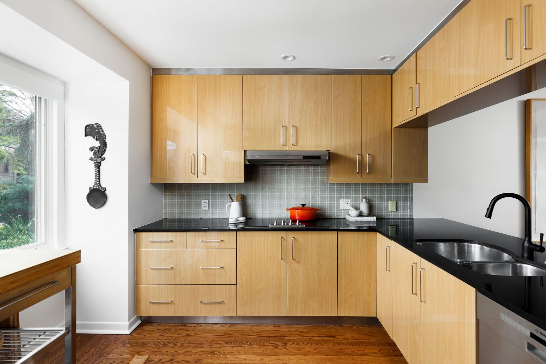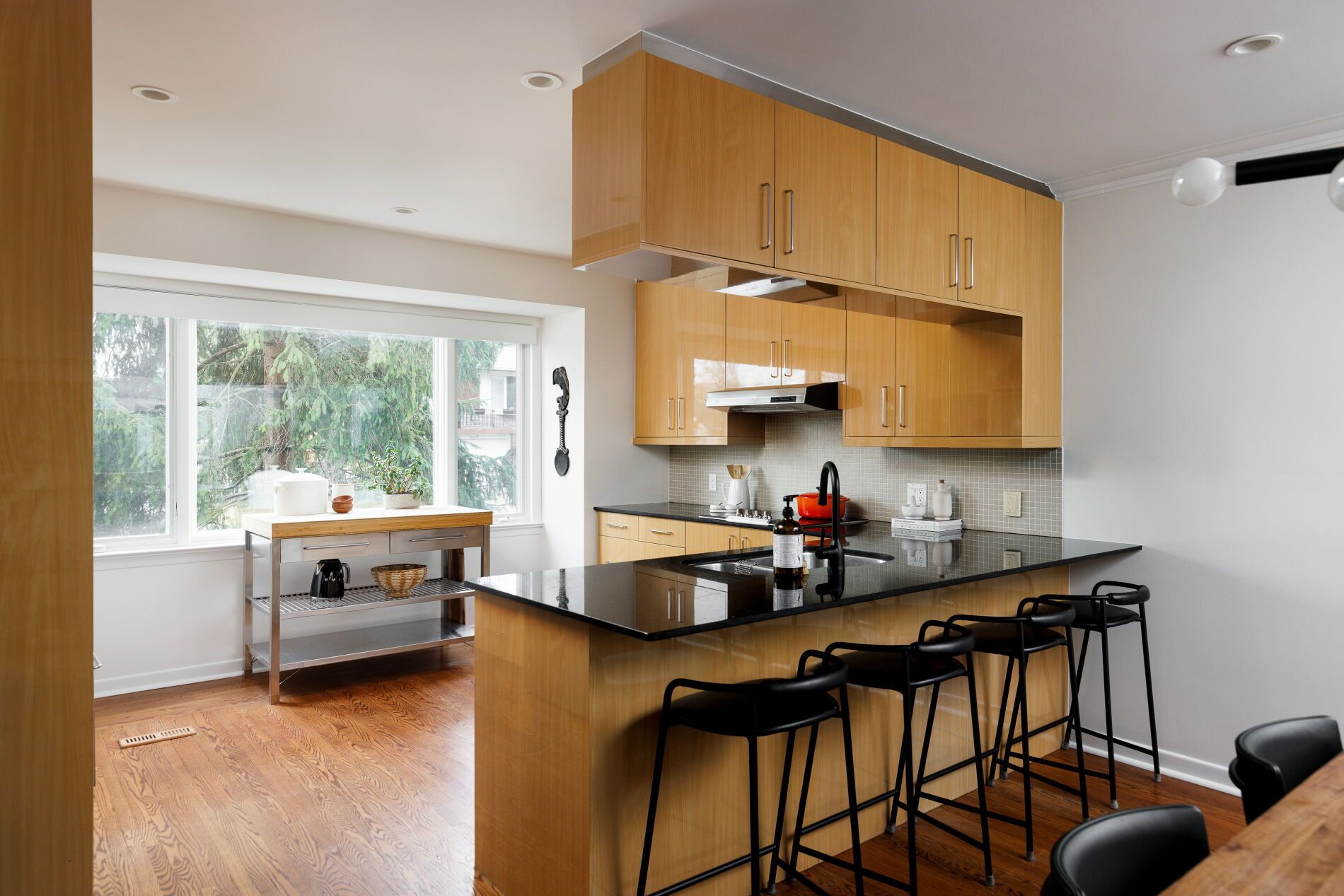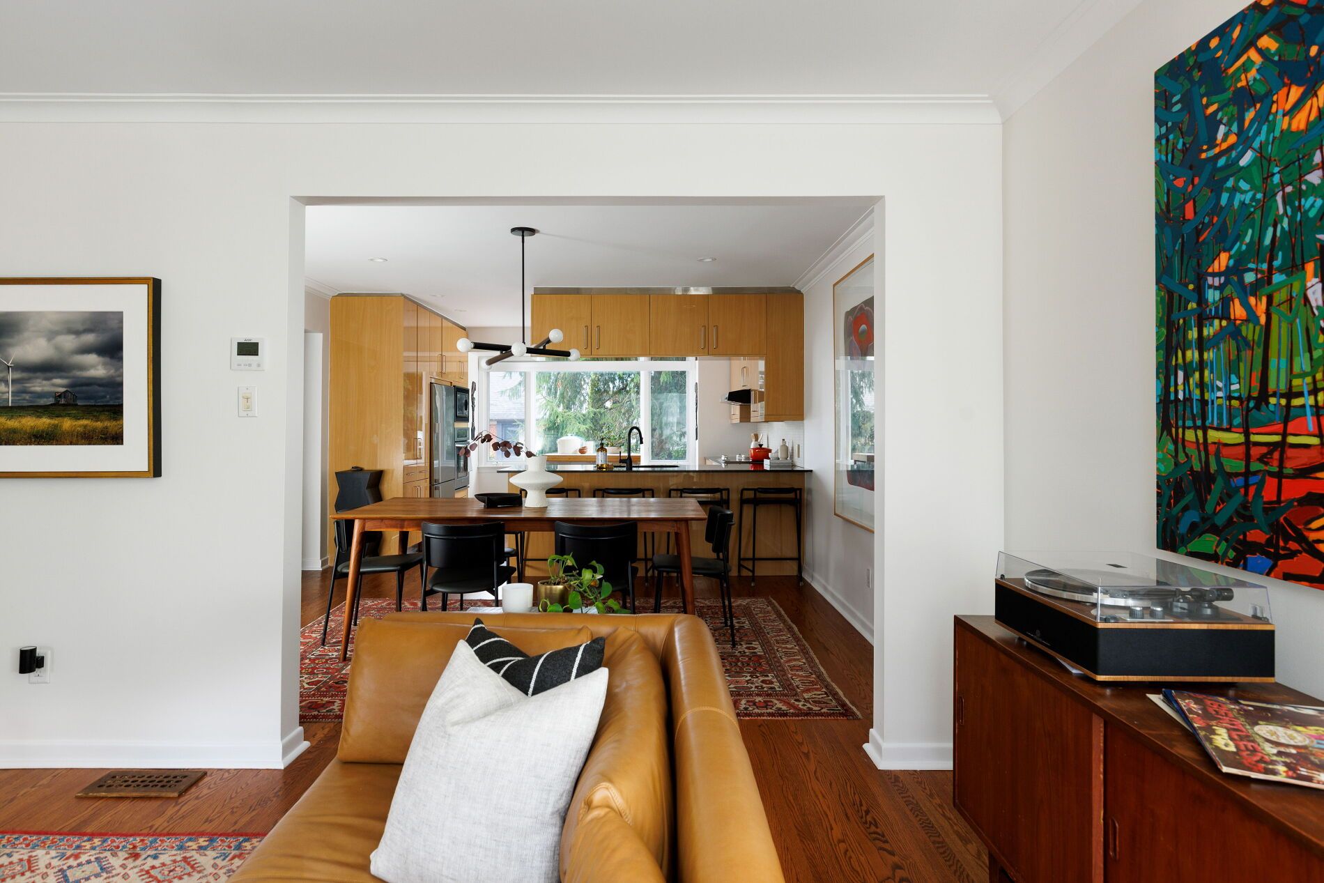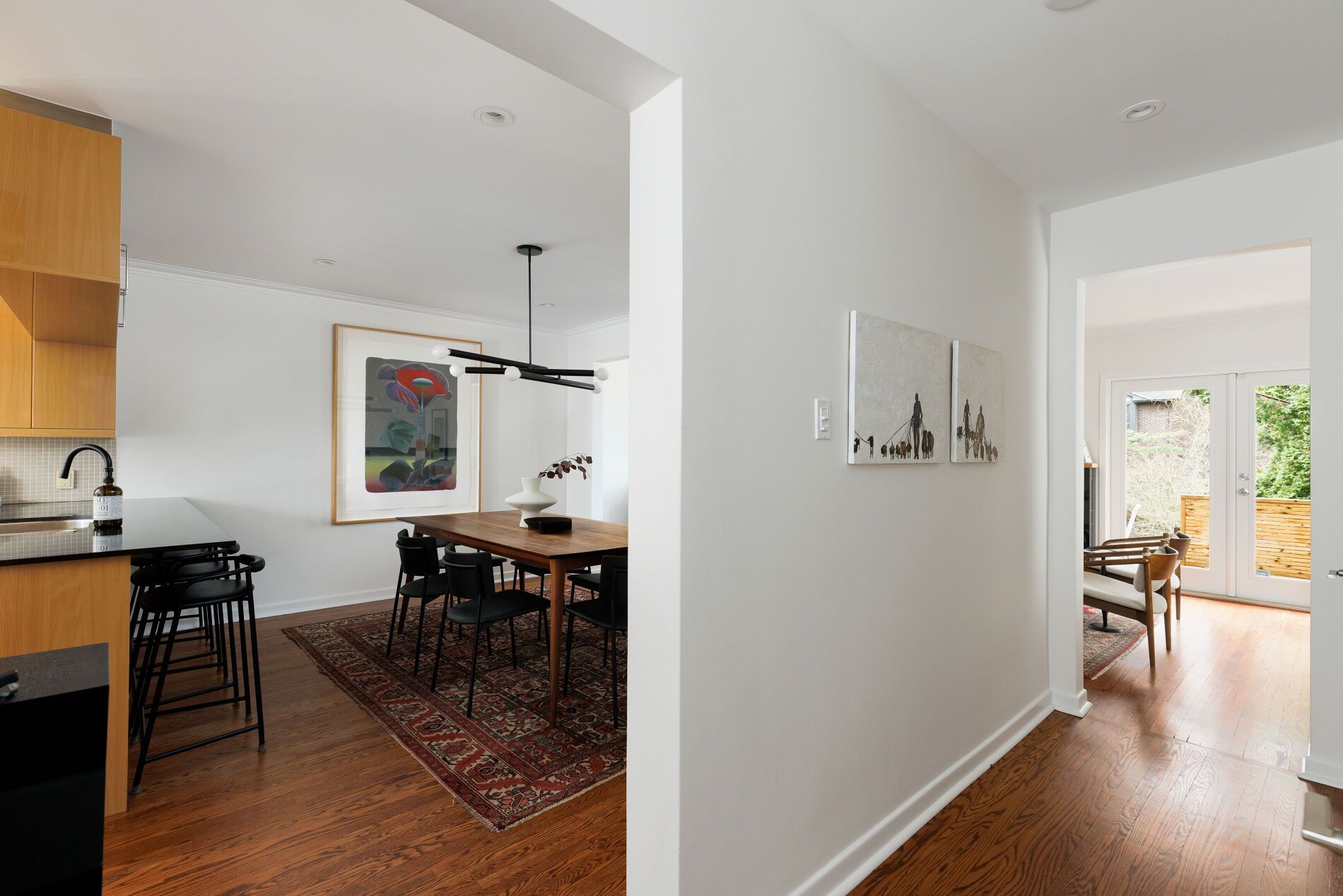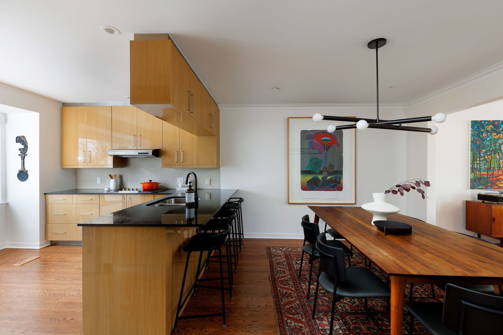 • Updated kitchen overlooks dining area with stylish designer lighting.