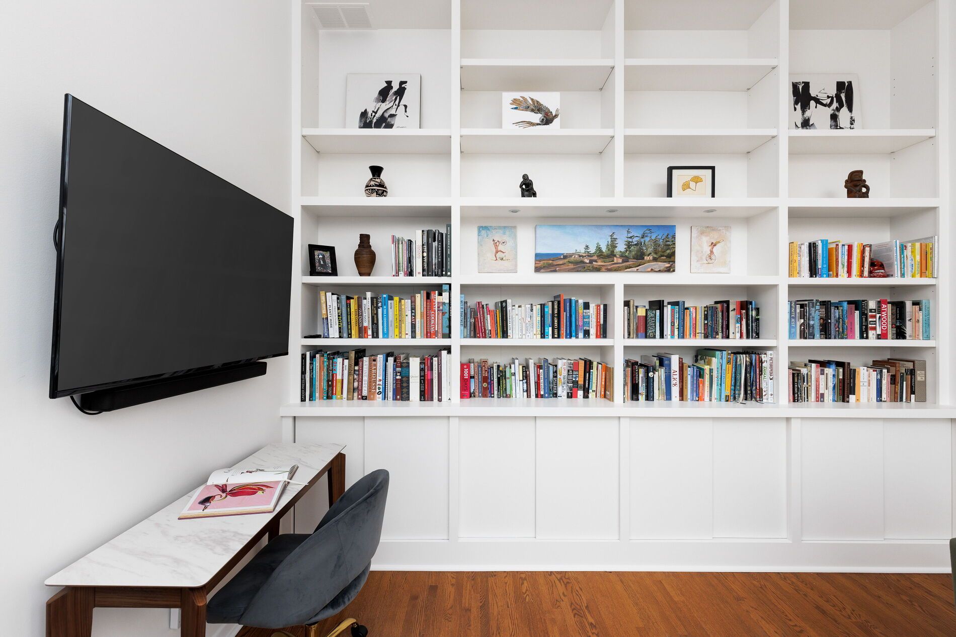 • Library with soaring ceilings and custom built-ins for an inspiring space.