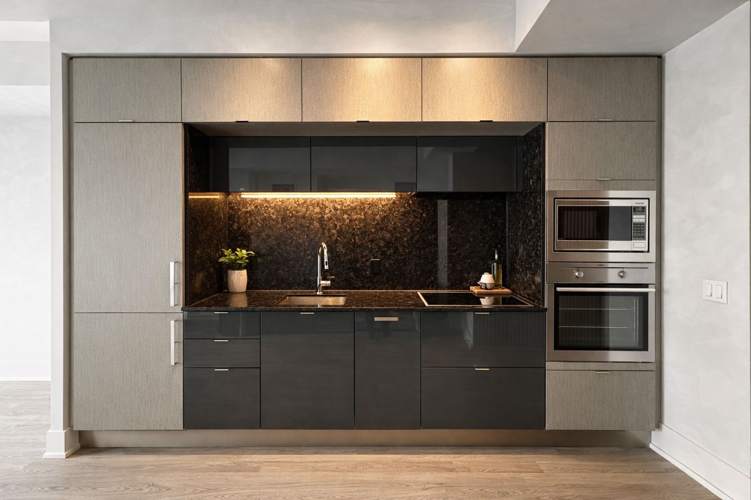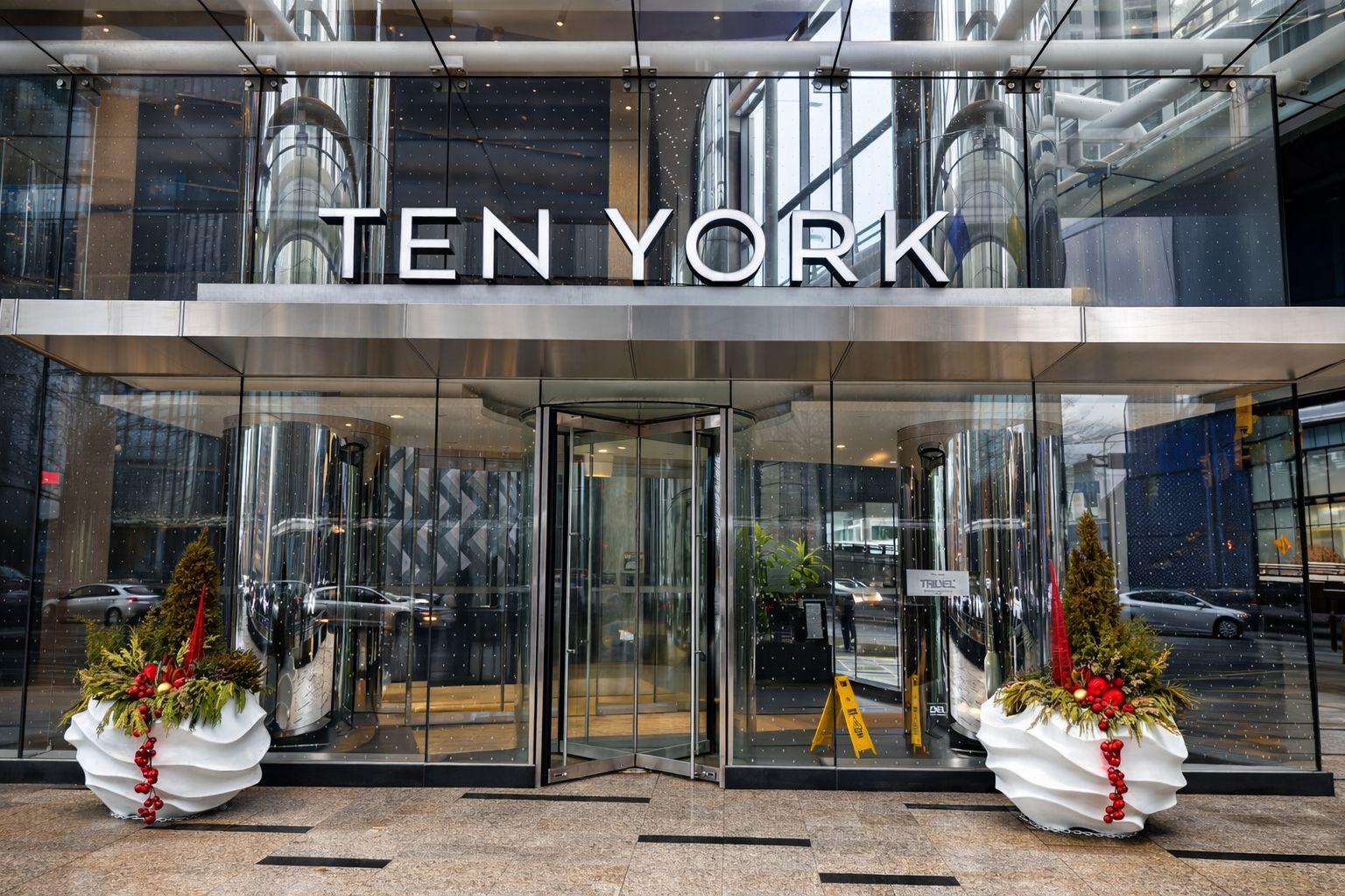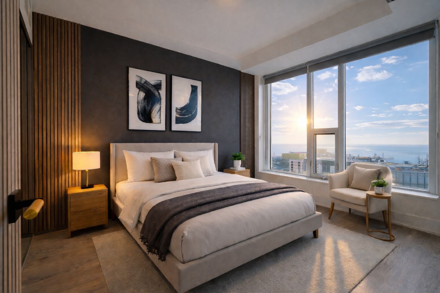 Luxury tridel built ten york condo. Fully renovated 1 bedroom suite with south exposure and breathtaking lake views. Designer interior featuring new laminate flooring, limewash finish plus feature walls, architectural fluted wood feature wall with concealed flush door, hidden invisible door detail, and premium knurled lever door handles. Bedroom features a custom fluted wood feature wall with textured wallpaper accent. Spa-inspired bathroom with seamless microcement shower and flooring. Located in the heart of downtown toronto, steps to the waterfront, union station, financial district, shopping, restaurants and entertainment. High-tech keyless entry building with 24 hr concierge and world-class amenities including spectacular gym, yoga & spinning studios, billiards, theatre room, outdoor pool, party room, guest suites and visitor parking. With integrated modern kitchen, washer & dryer, all light fixtures and window coverings.