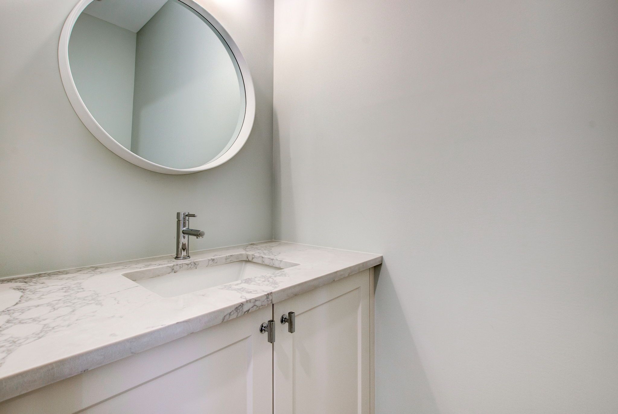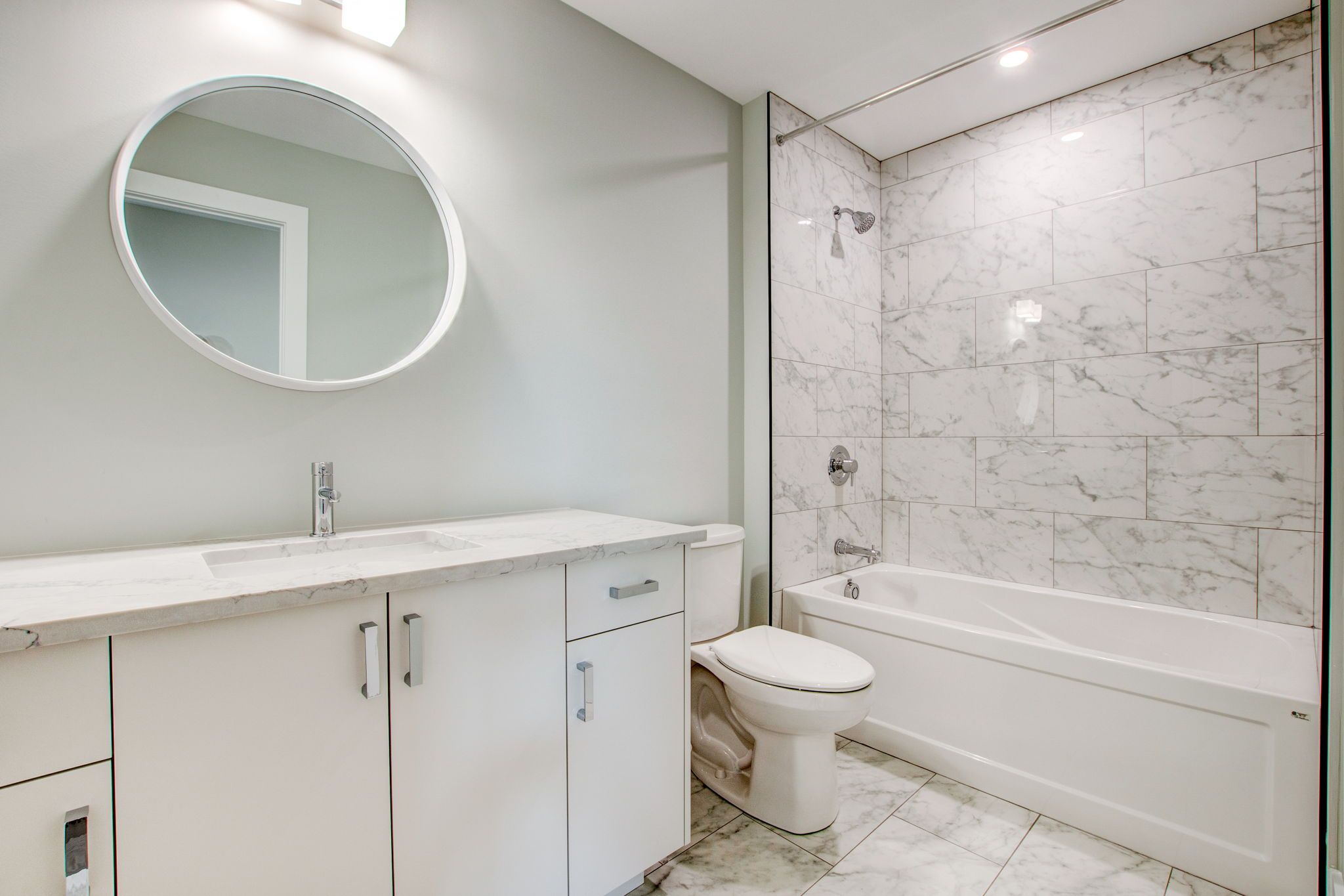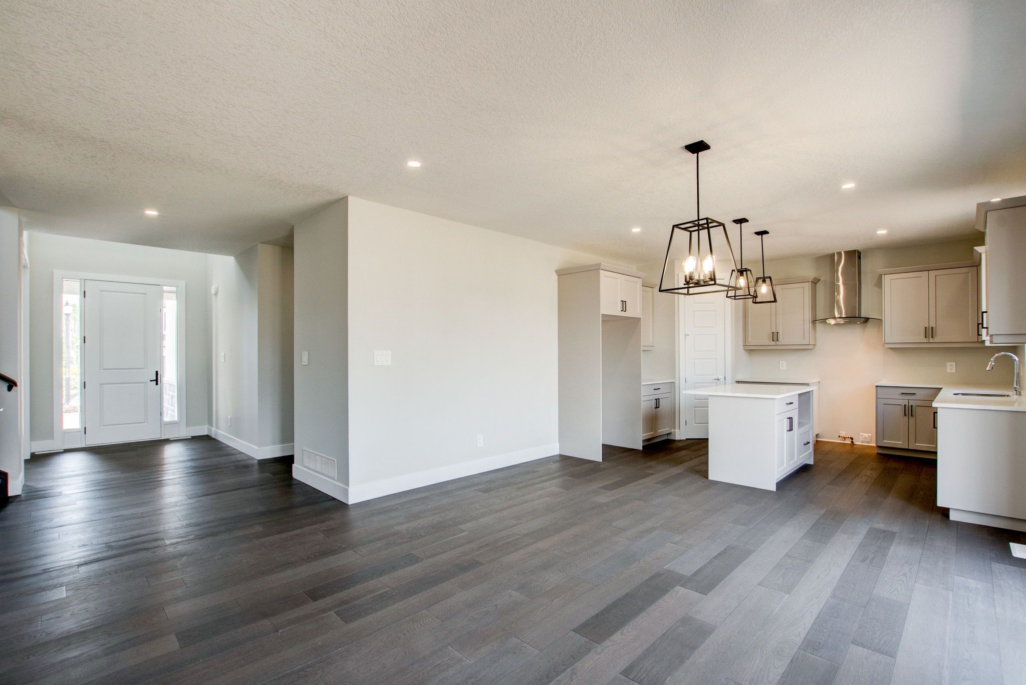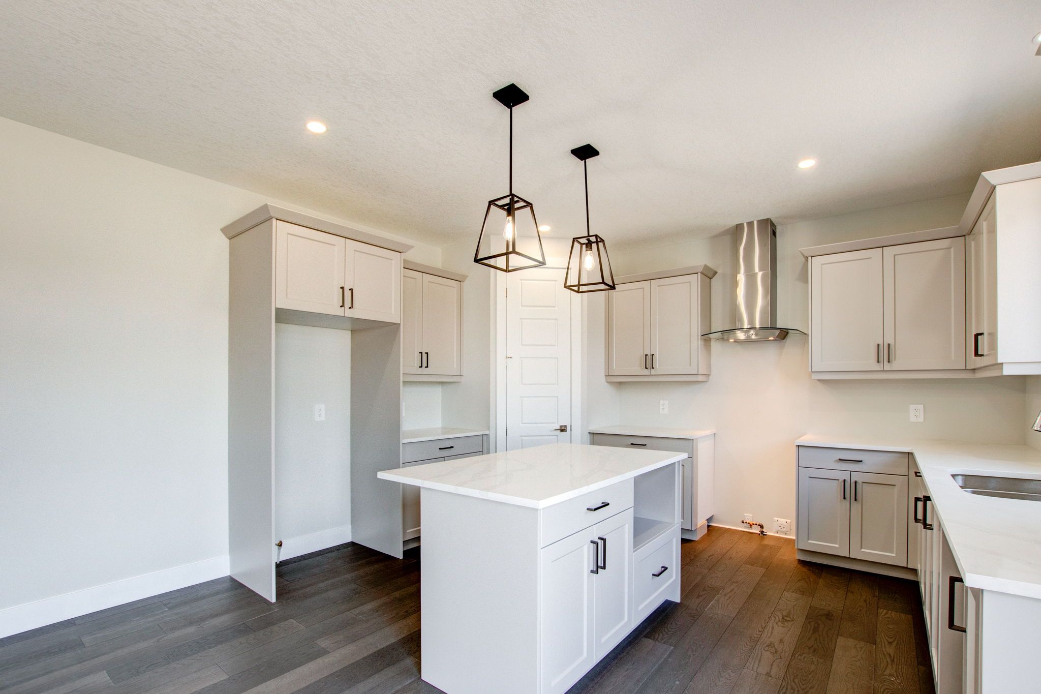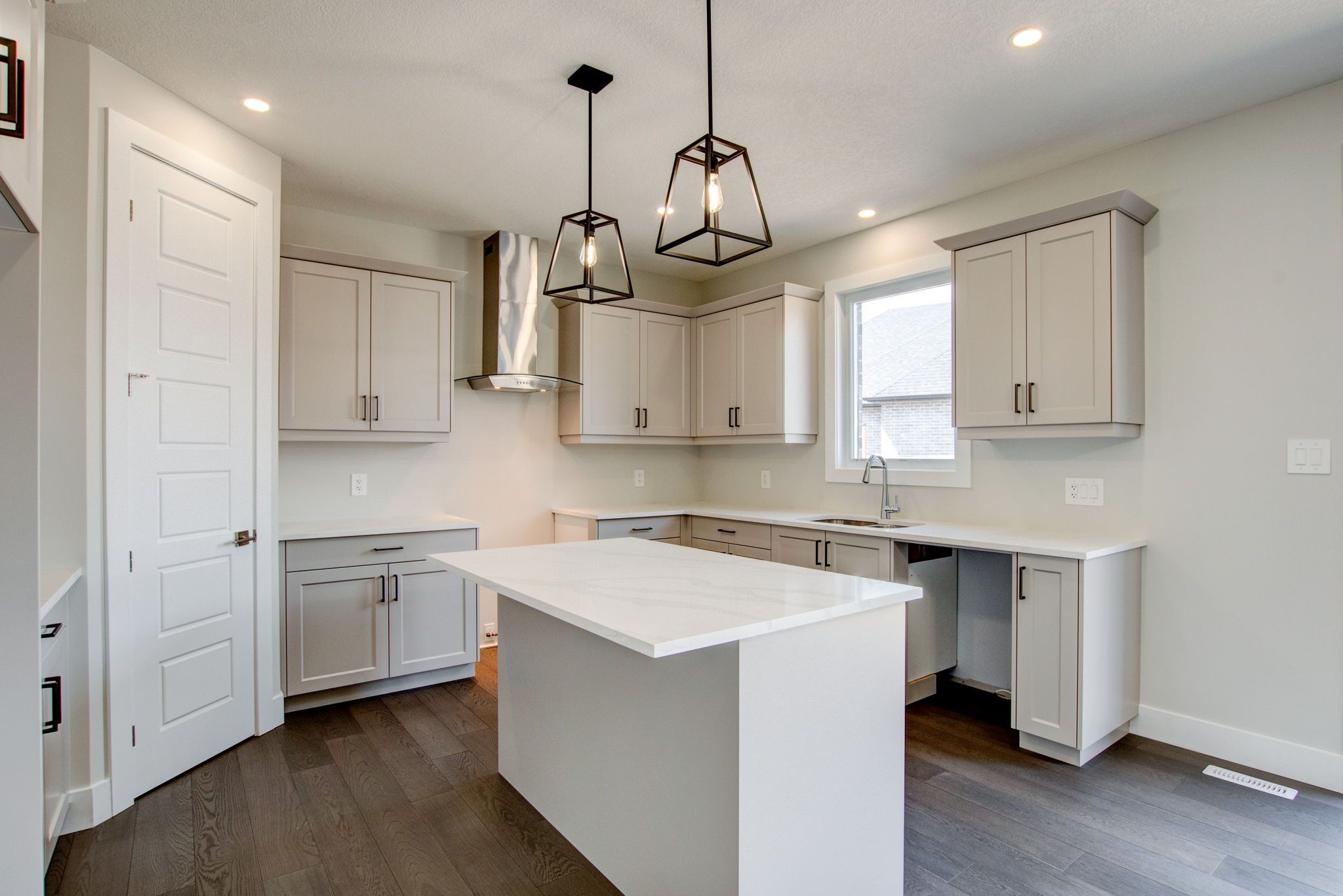 • Modern kitchen with Quartz countertops and stylish hardwood flooring.