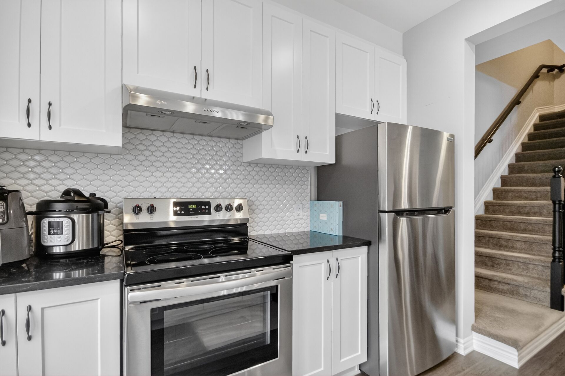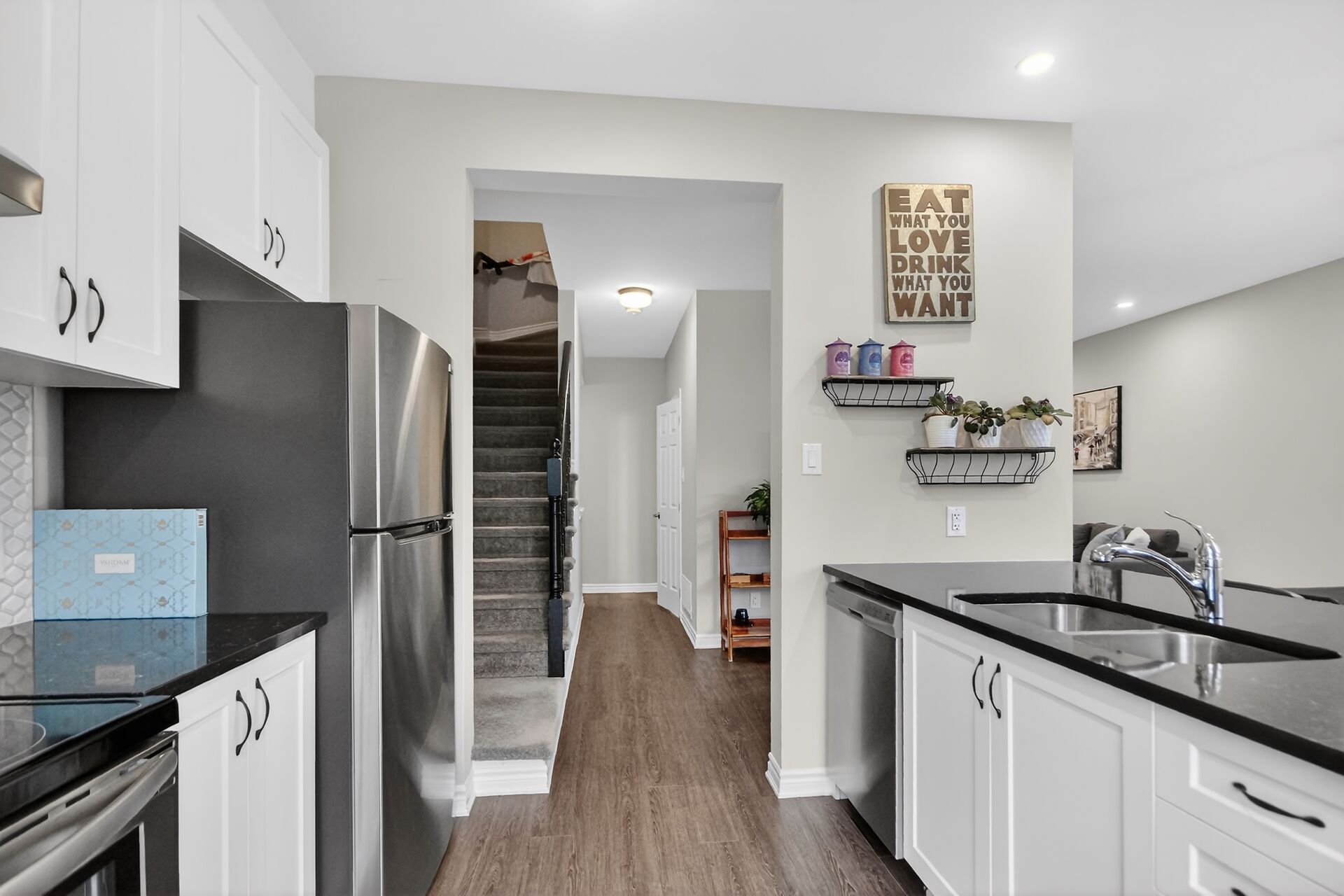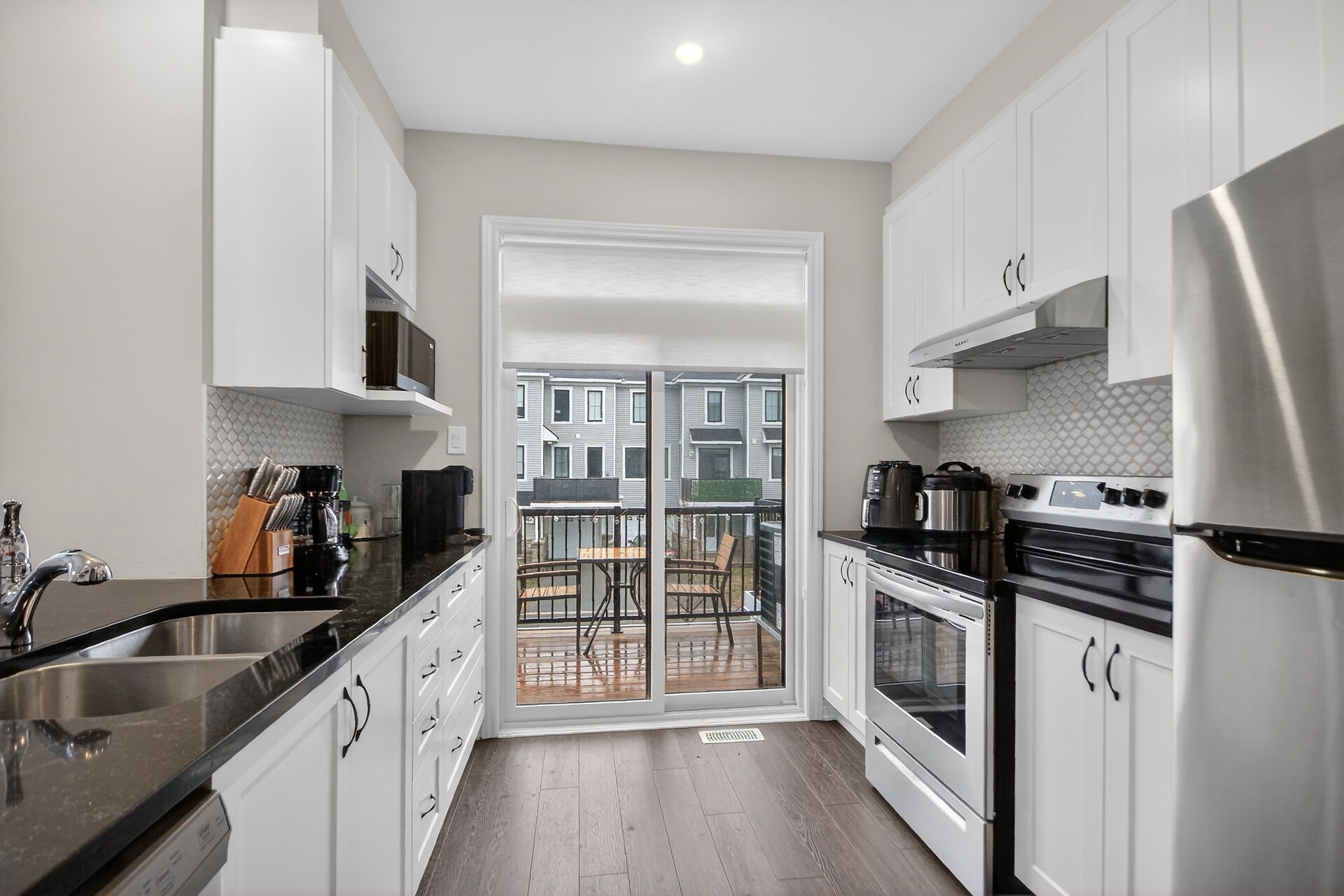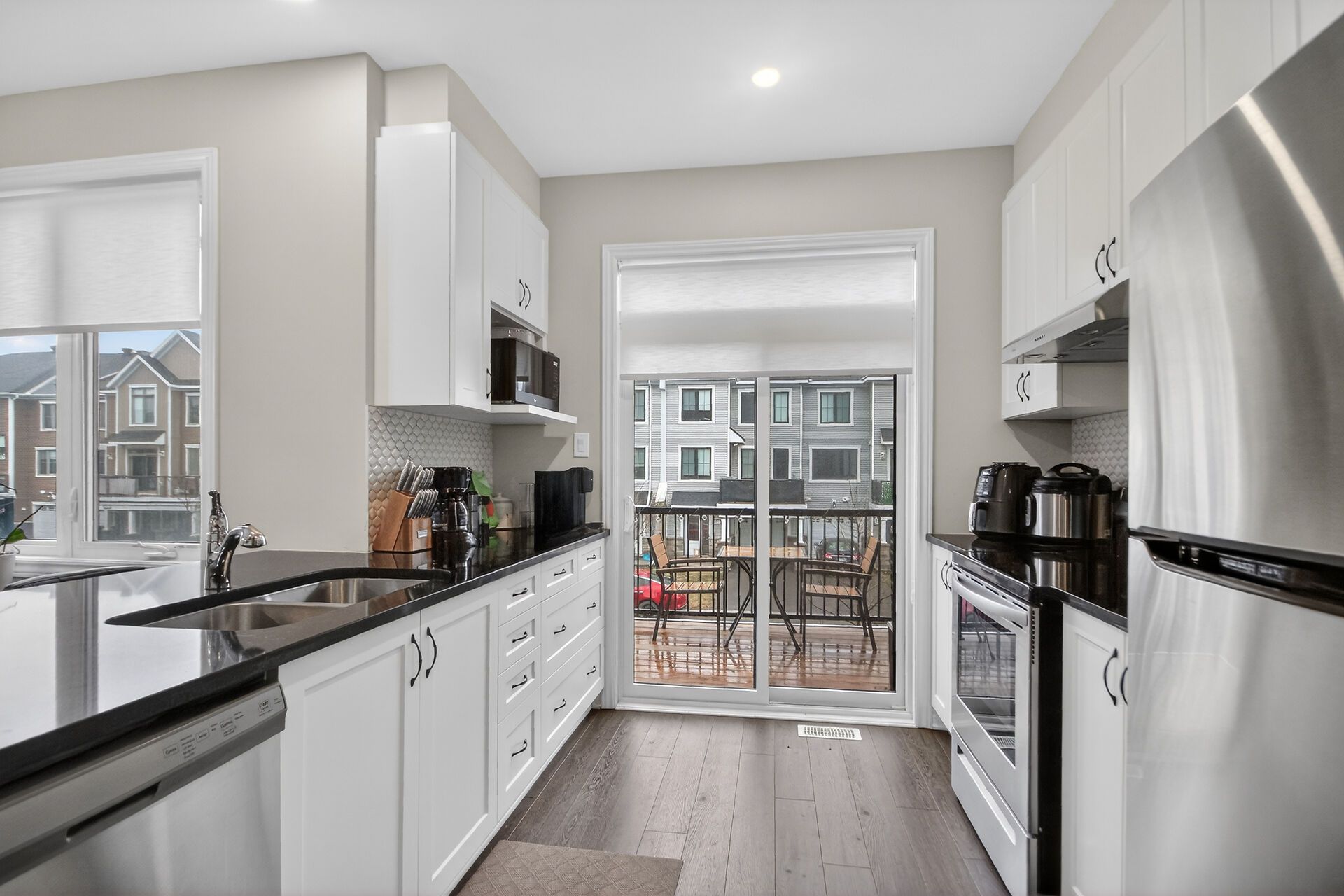 Welcome home to this meticulously maintained, three-story townhouse situated in a prime location near the tanger outlets and canadian tire centre. This stunning home features a bright, open-concept main floor with 9-foot ceilings, pot lights, and luxury vinyl flooring throughout. The gourmet kitchen is a true showstopper, boasting quartz countertops, an upgraded backsplash, premium cabinetry, and stainless steel appliances, all leading to a private balcony perfect for entertaining. Upstairs, you'll find a massive primary bedroom with a walk-in closet, a spacious secondary bedroom, and a beautifully upgraded family bath featuring quartz finishes. Offering the perfect blend of modern upgrades and unbeatable convenience, this is a property you'll want to call your own!