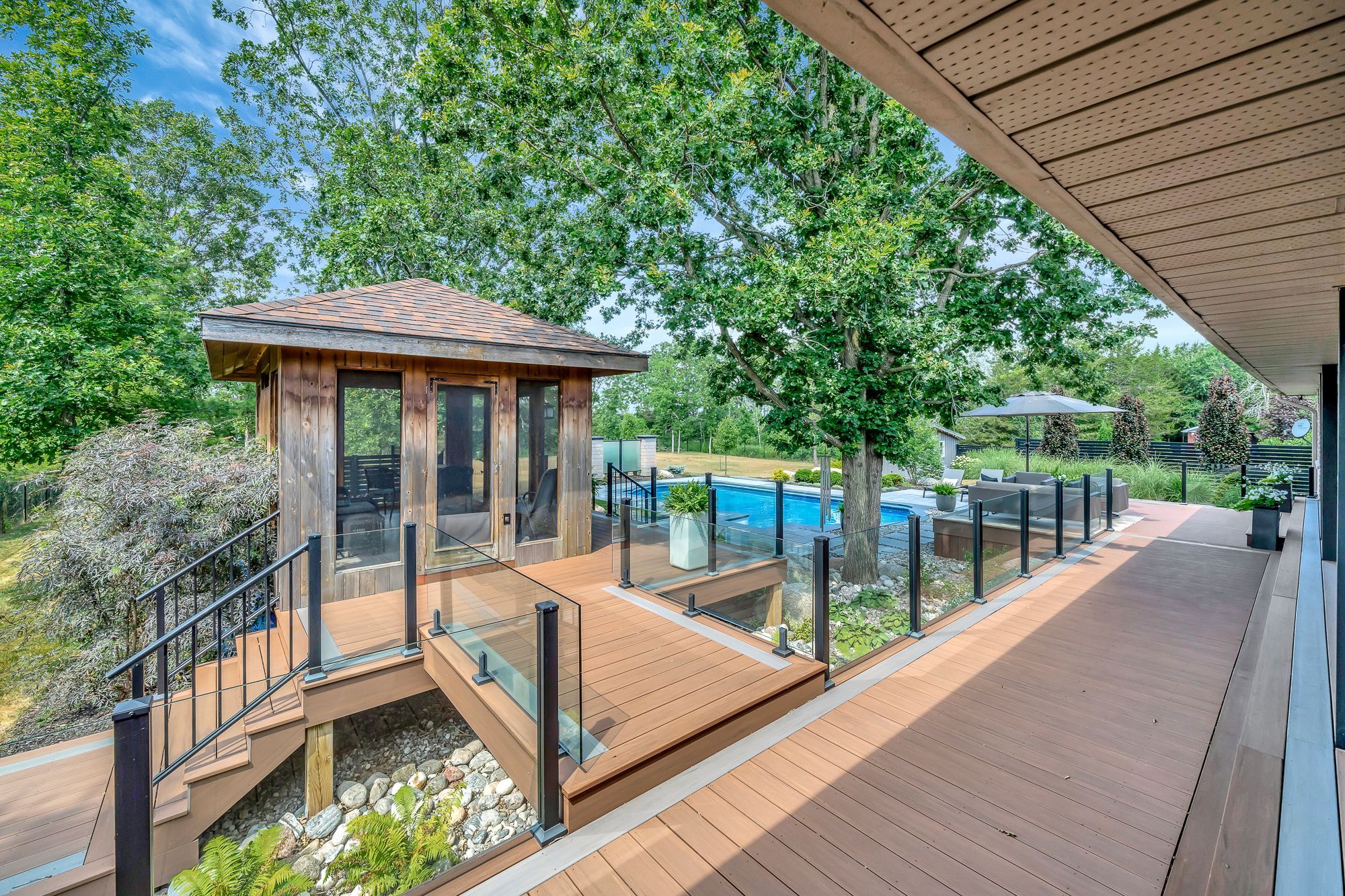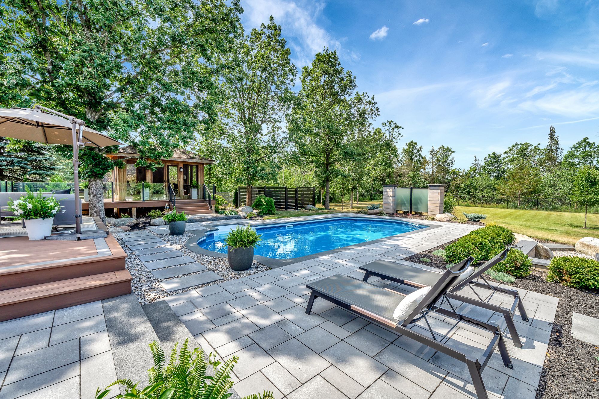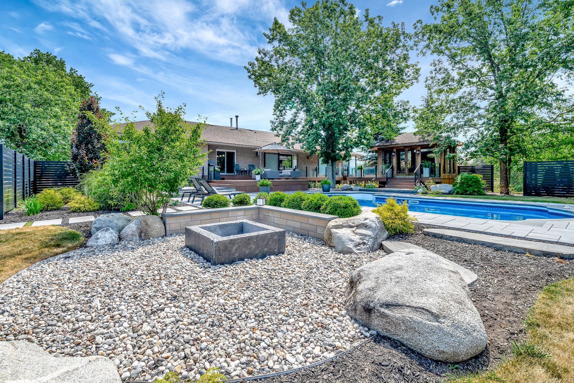 • Large, landscaped lot with a private outdoor oasis featuring a pool and gazebo.