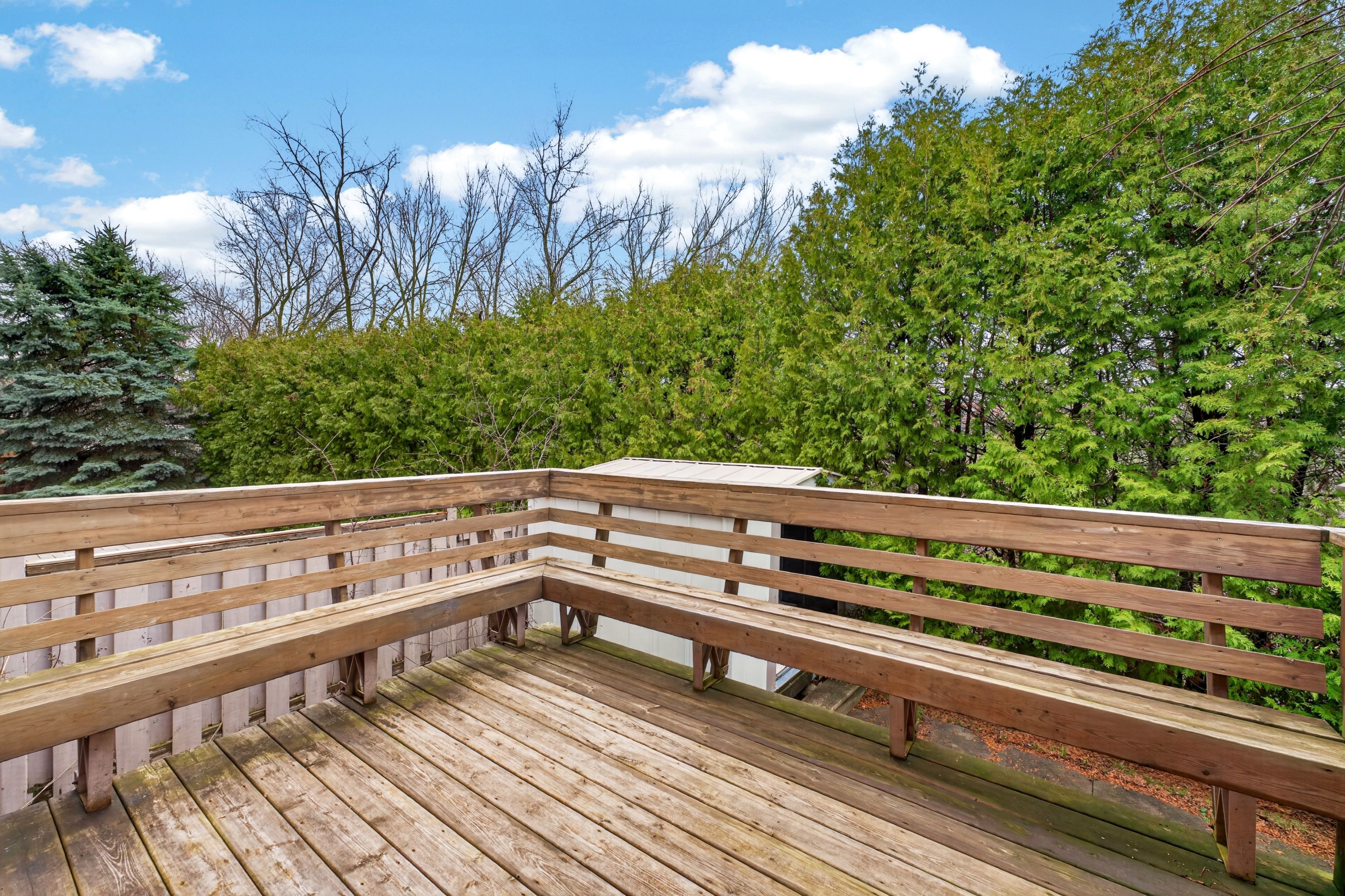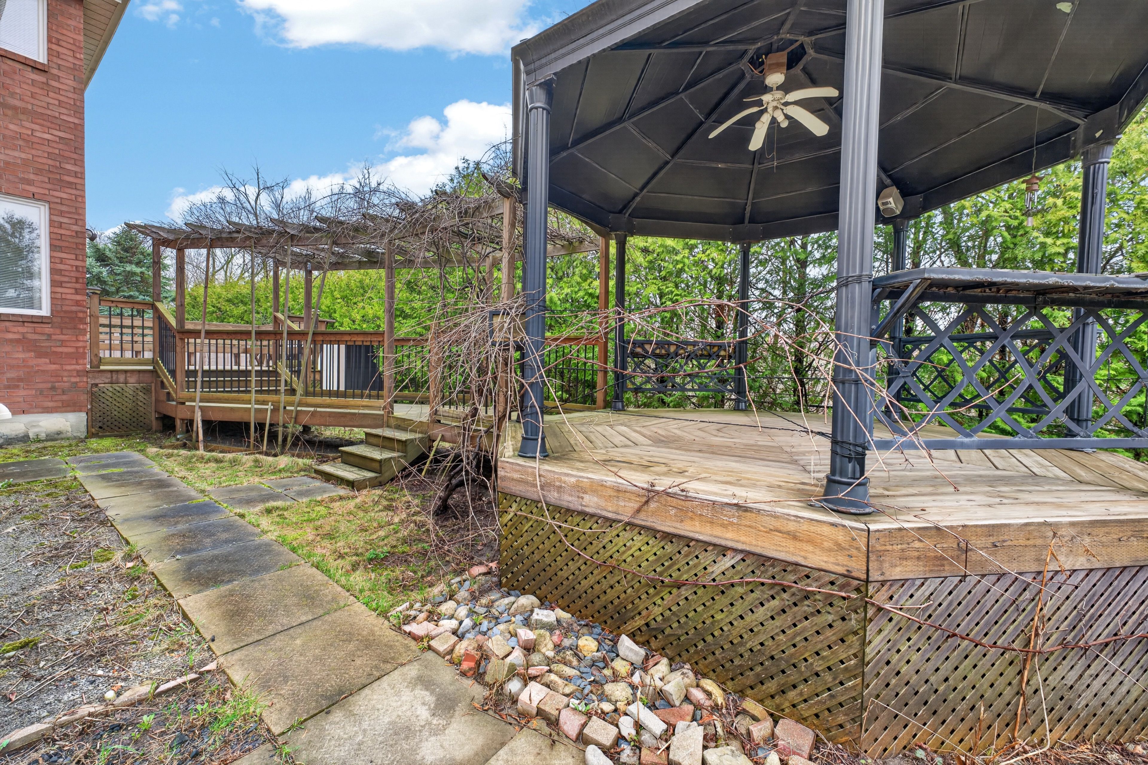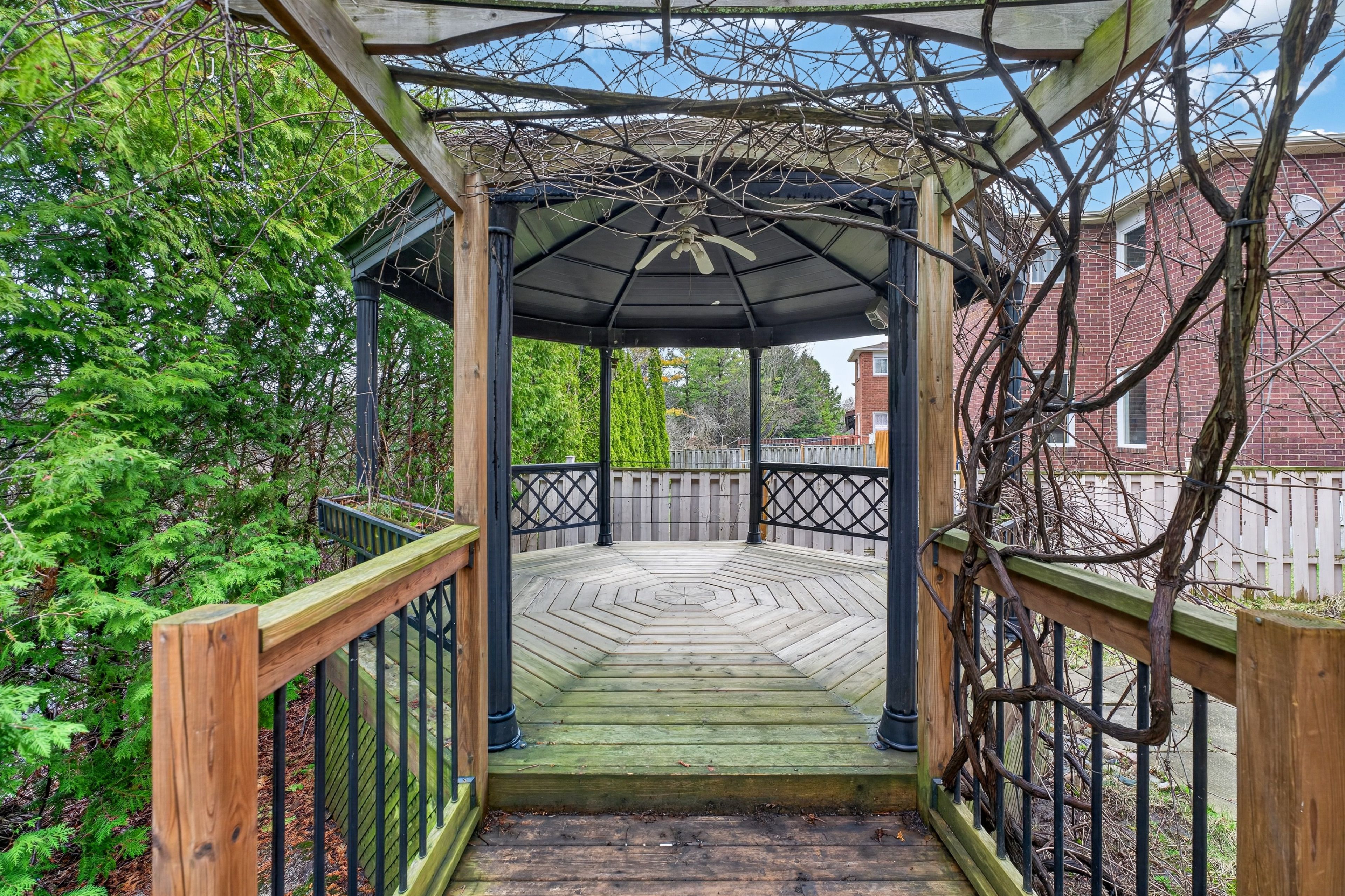 • Private backyard overlooking a ravine and pond with a gazebo.