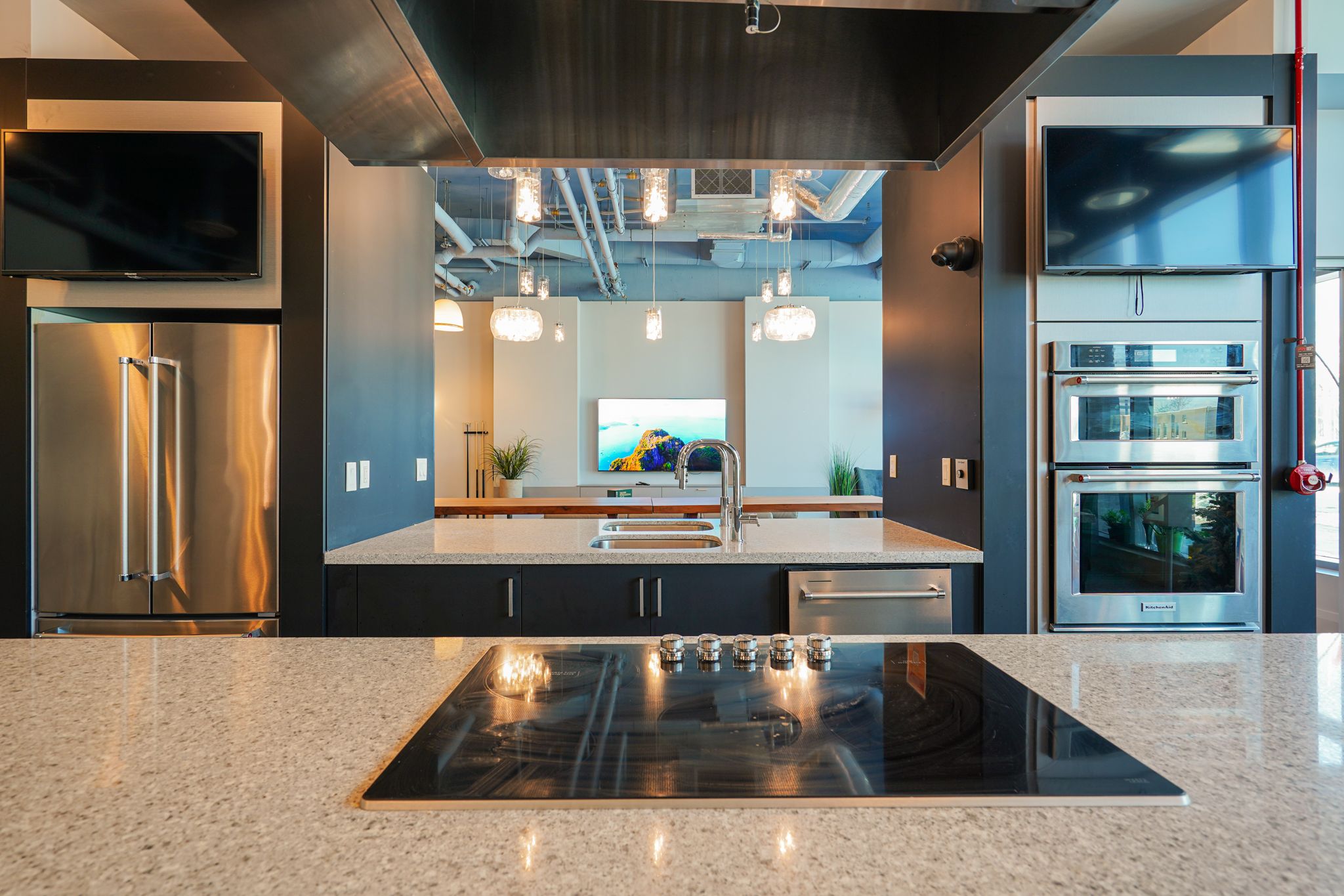 • Contemporary kitchen features stylish appliances and luxurious Caesarstone countertops.